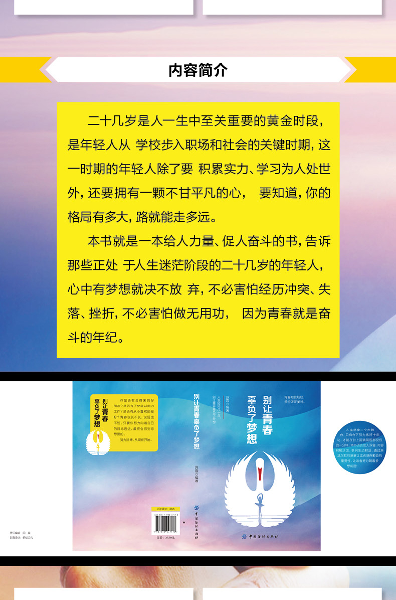 二十几岁是人一生中至关重要的黄金时段,是年轻人从 学校步入职场和社会的关键时期,这一时期的年轻人除了要 积累实力、学习为人处世外,还要拥有一颗不甘平凡的心, 要知道,你的格局有多大,路就能走多远。《别让青春辜负了梦想》就是一本给人力量、促人奋斗的书,告诉那些正处 于人生迷茫阶段的二十几岁的年轻人,心中有梦想就决不放 弃,不必害怕经历冲突、失落、挫折,不必害怕做无用功, 因为青春就是奋斗的年纪。