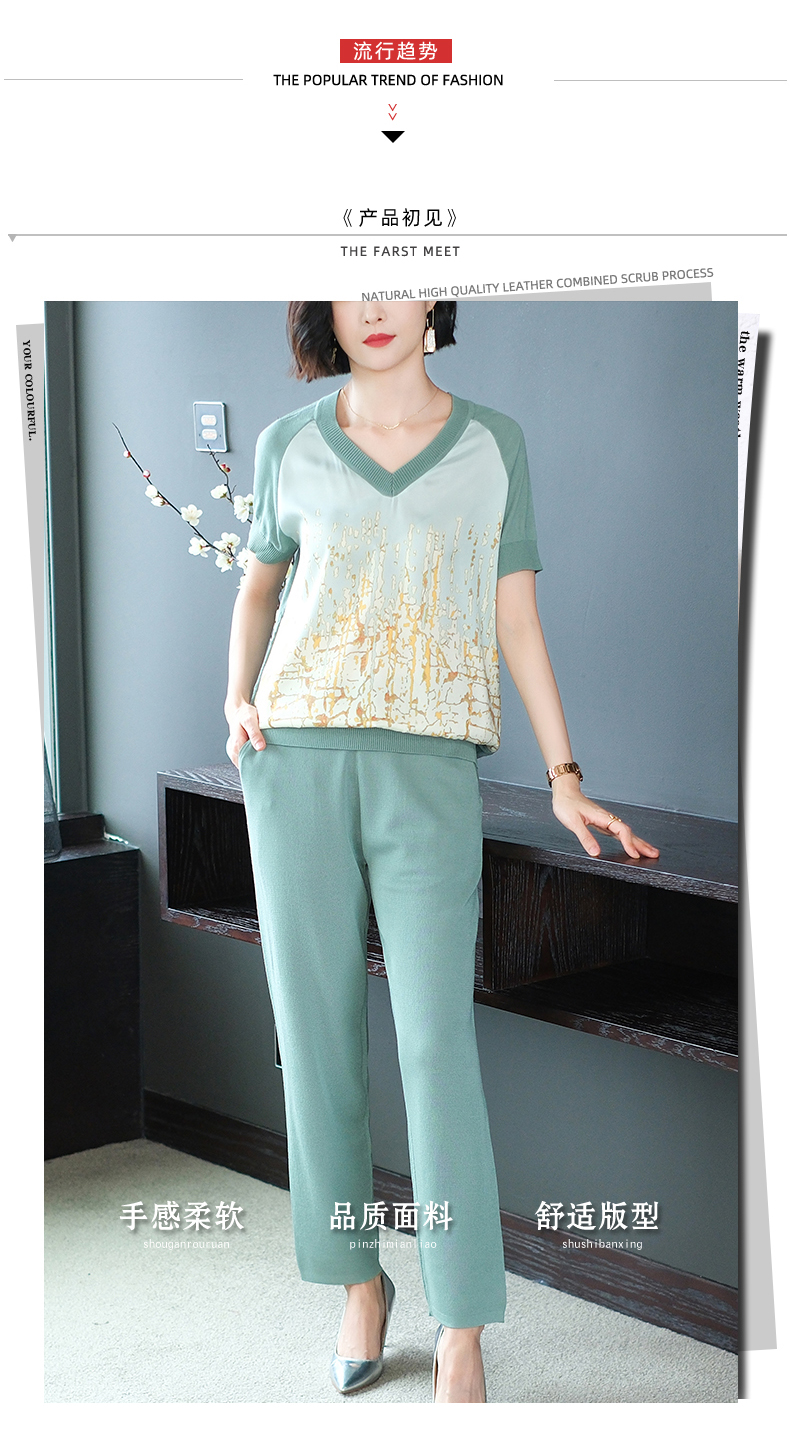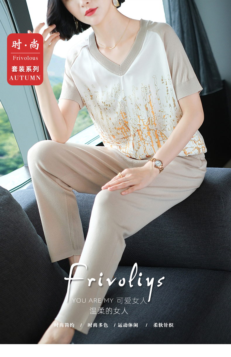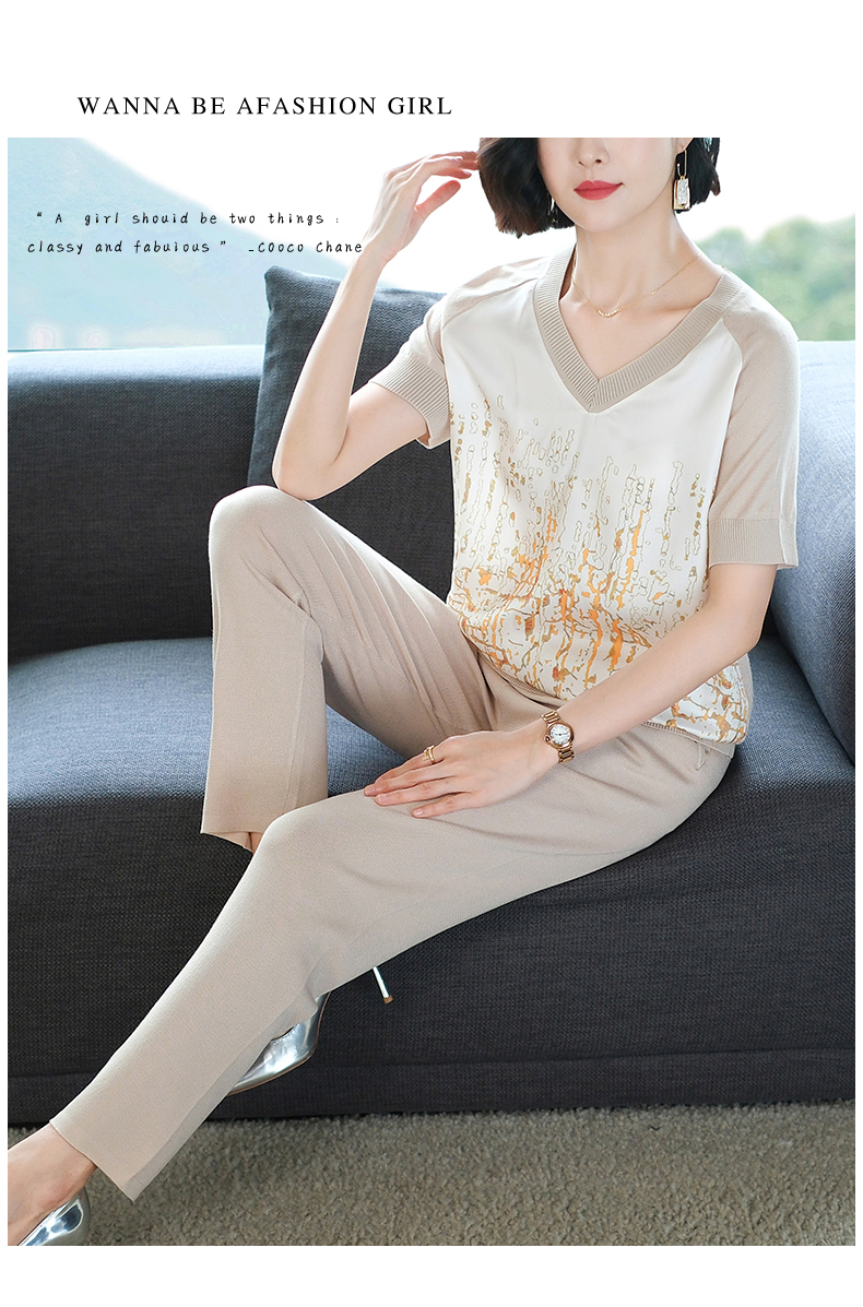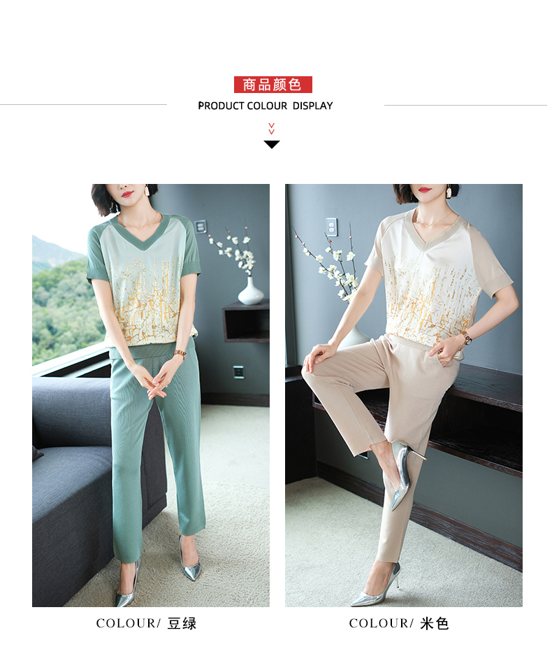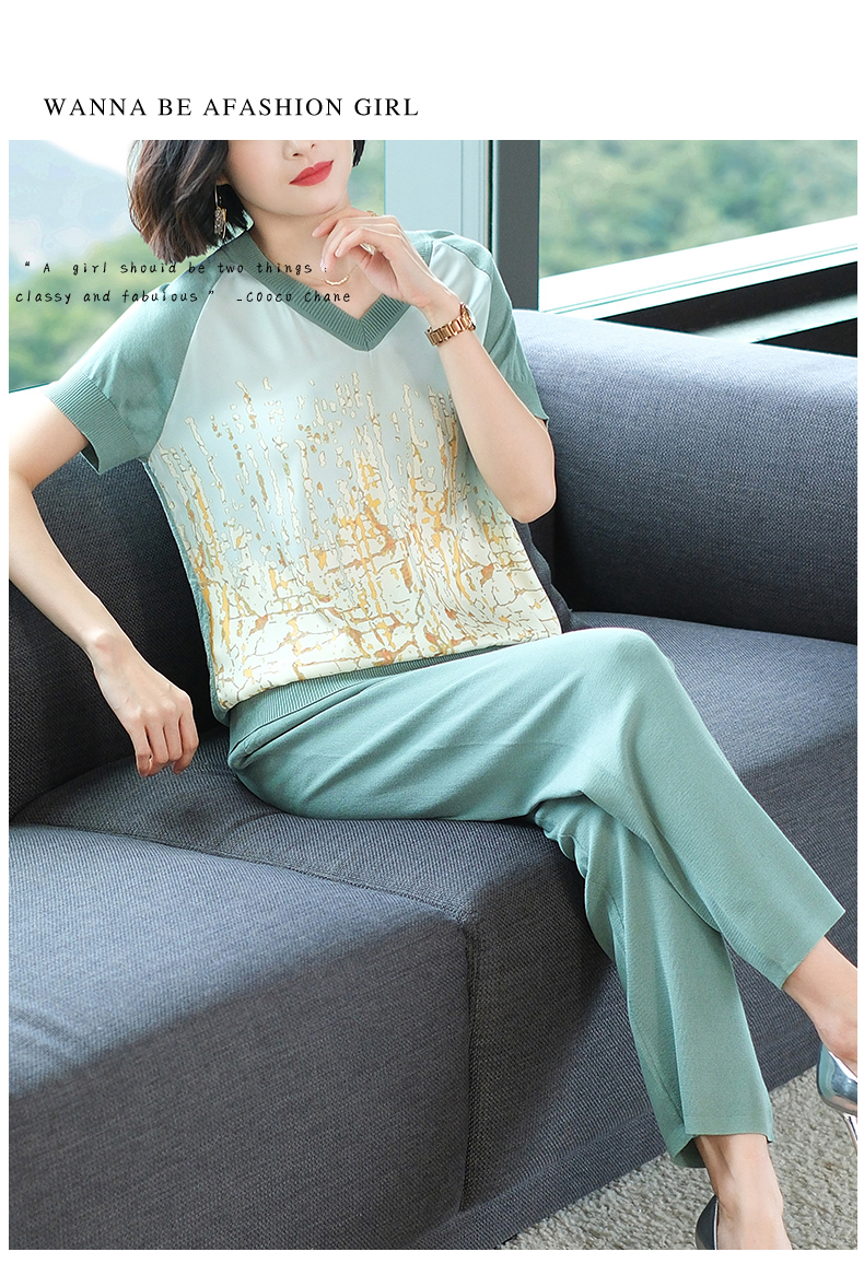 夏季新款,短袖V领冰丝休闲薄款运动套装女士宽松t恤洋气妈妈两件套CC-10-1696