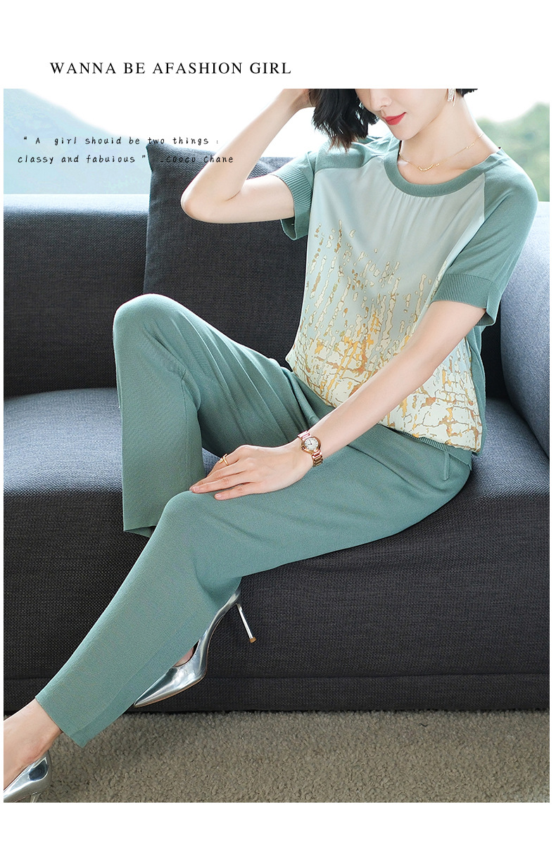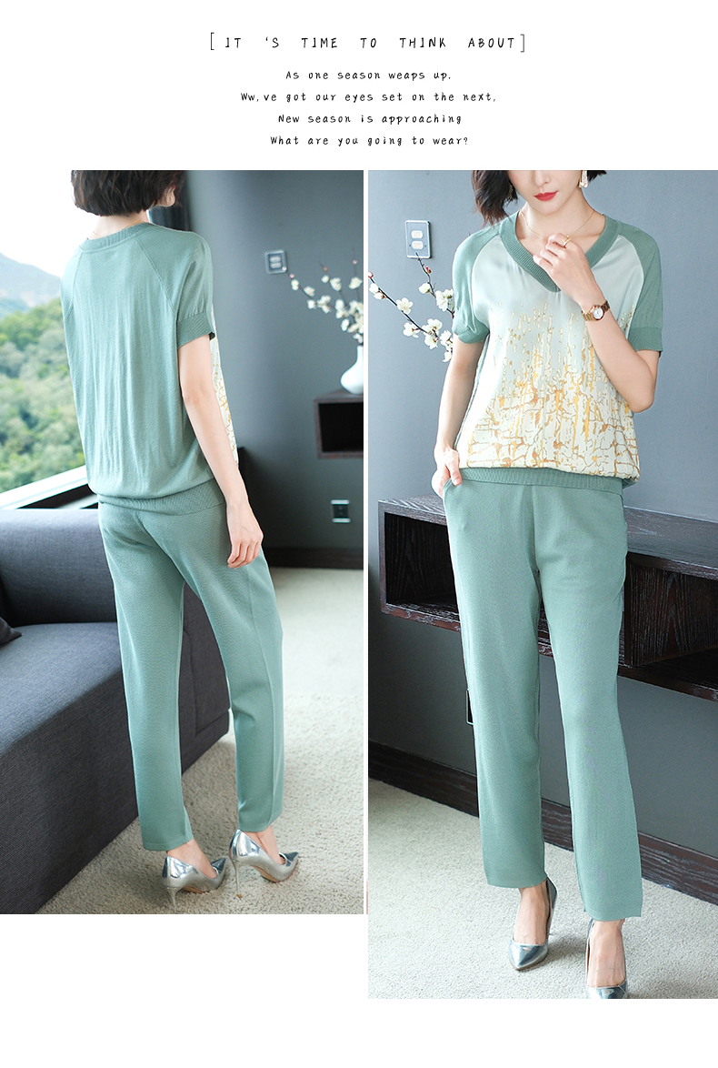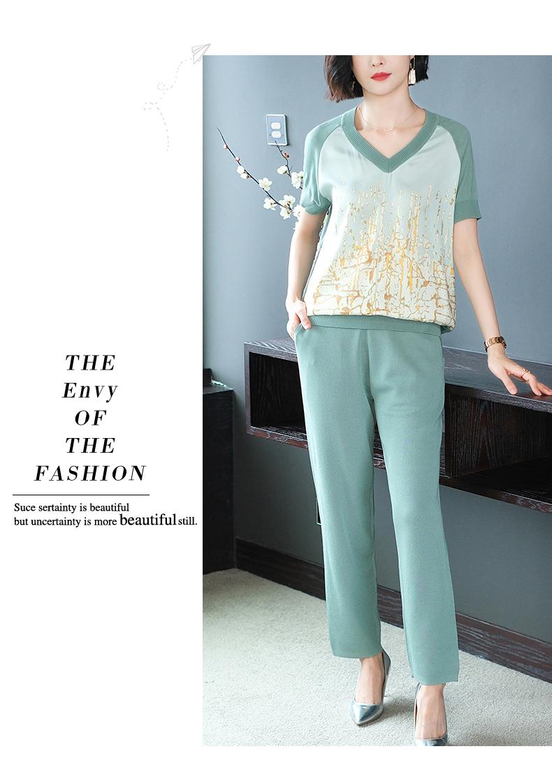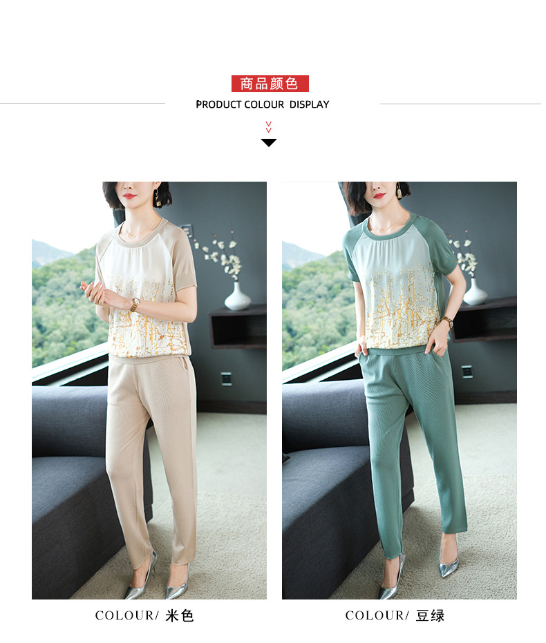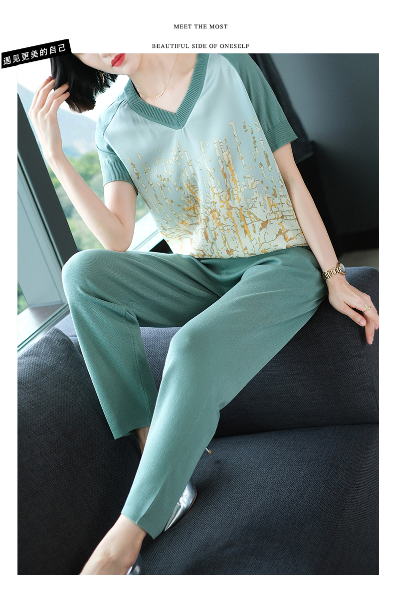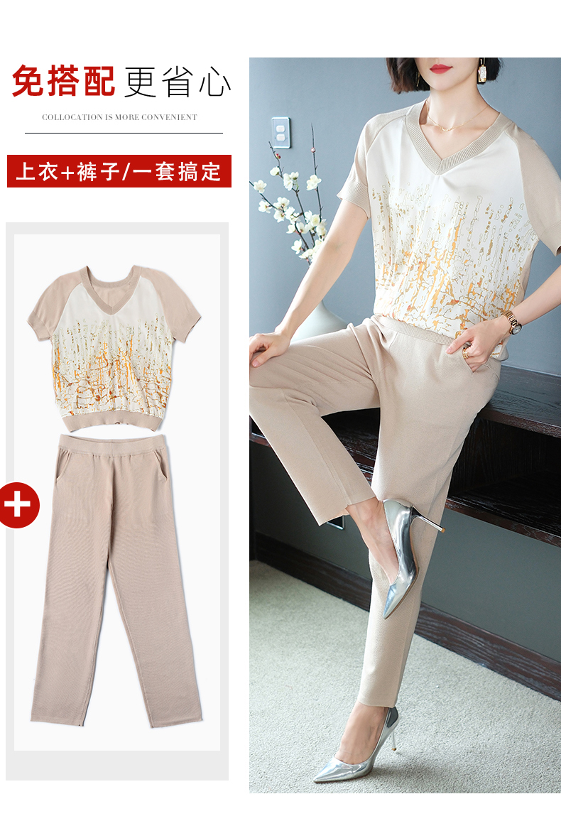 夏季新款,短袖V领冰丝休闲薄款运动套装女士宽松t恤洋气妈妈两件套CC-10-1696