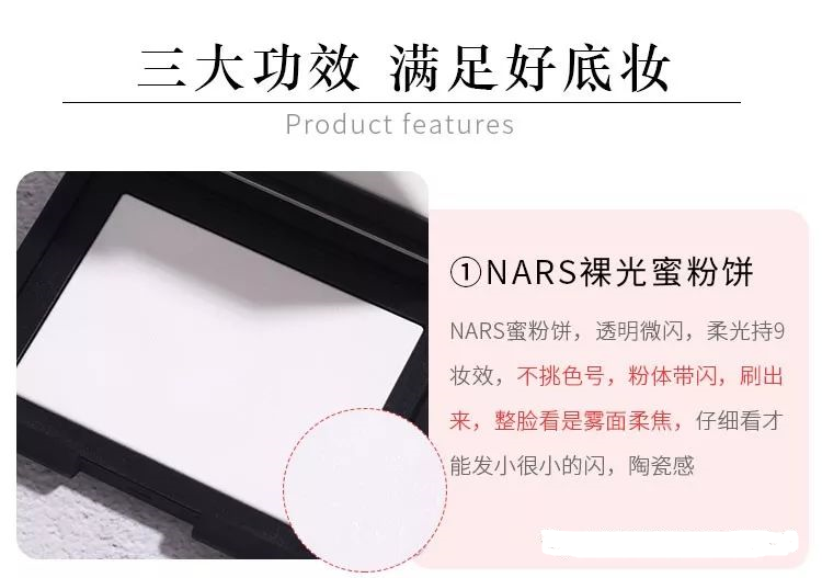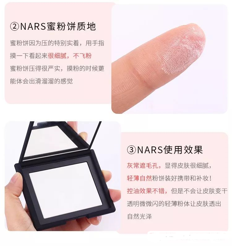 隐形毛孔+丝绒哑光妆效+持久控油+长效定妆NARS蜜粉饼=油皮和混油皮的王者饼粉质巨细腻,压盘非常实反复用刷子/粉扑去取粉,也不会有松散颗粒感。