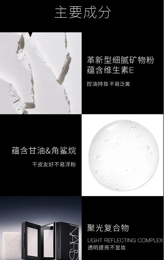 NARS专利LRC聚光复合物,能够主动提高肌肤对光的反射能力,饼面凑近看会有一些细闪,很像珍珠白色号的高光。