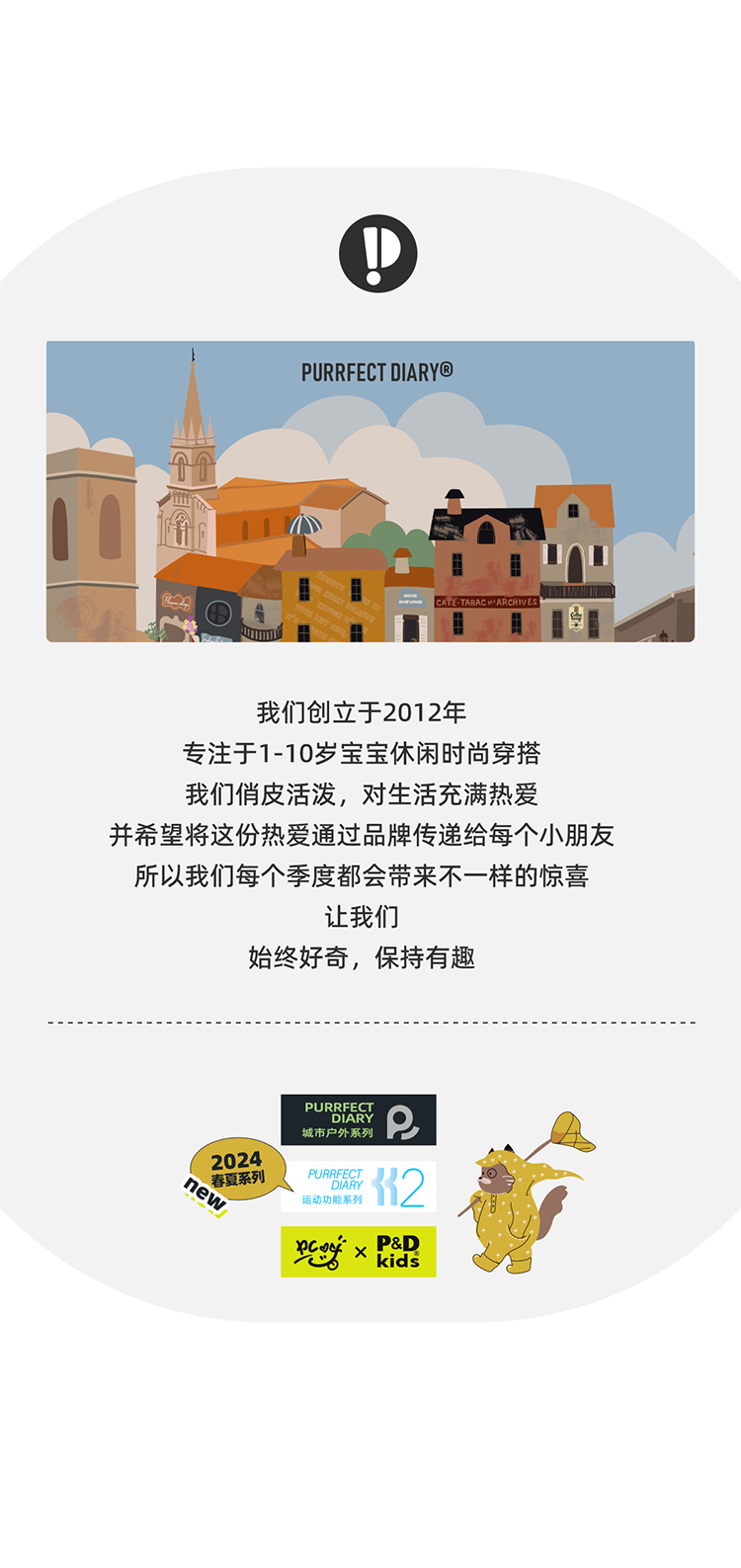 - Purrfect-Diary专注于贴近自然随性的穿着概念,轻奢平价的童装文化传播,在产品设计上更加注重婴童穿着的舒适性、安全性、更出众的国际化品牌,将欧美的育婴文化在中国进行深入的传播与推广。