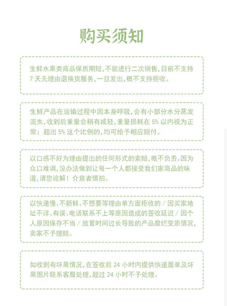 4.由于蕉绿是整株运输,运输过程中会有断裂风险,较轻的断裂按情况补偿售后,箱子破裂果不影响则不售后哈,重量少一斤赔付5元