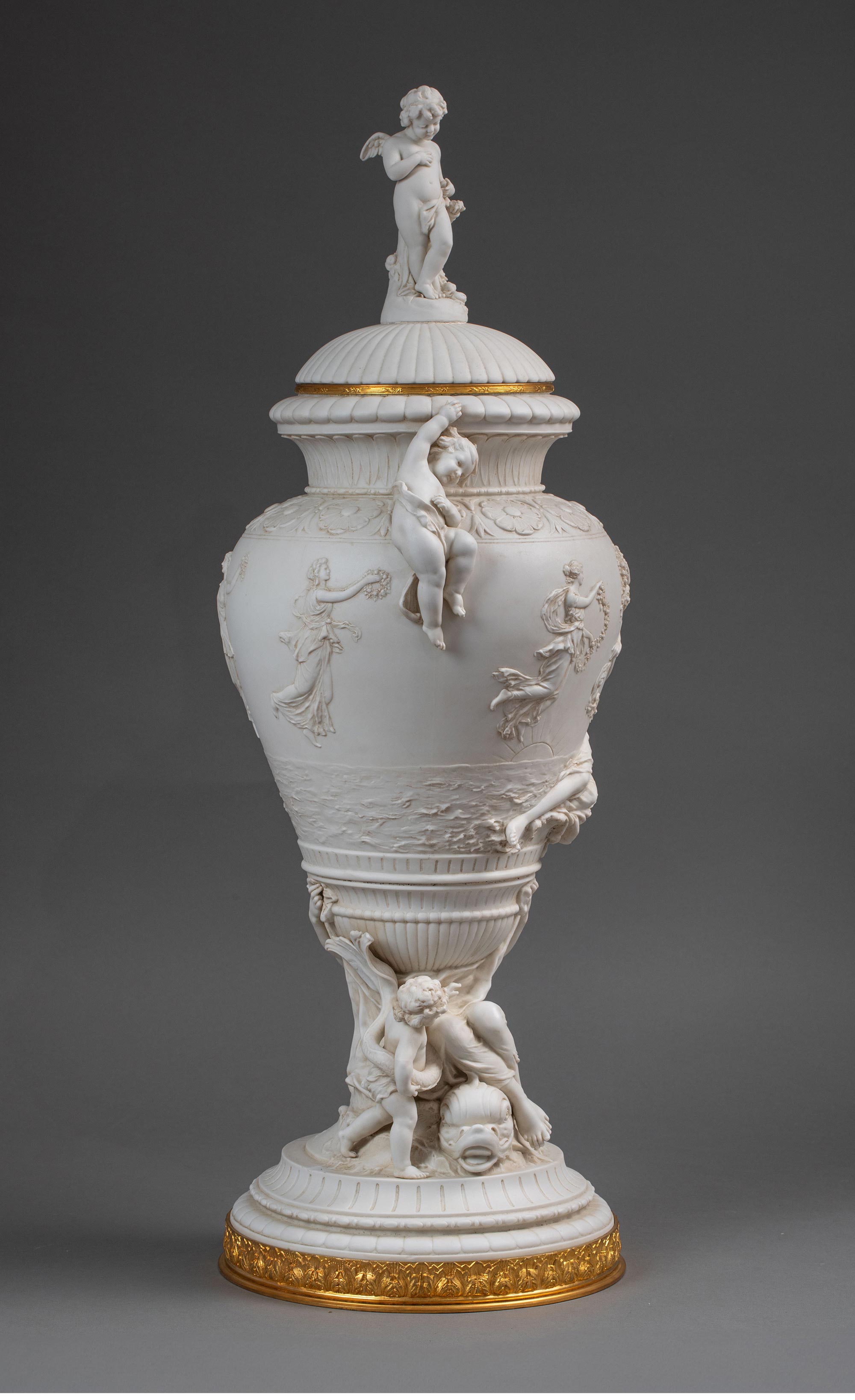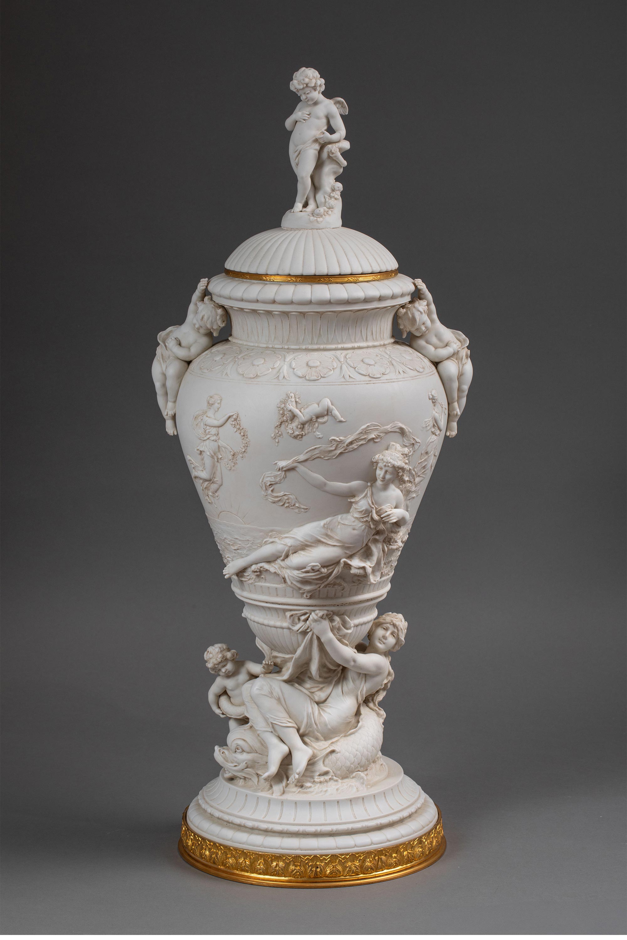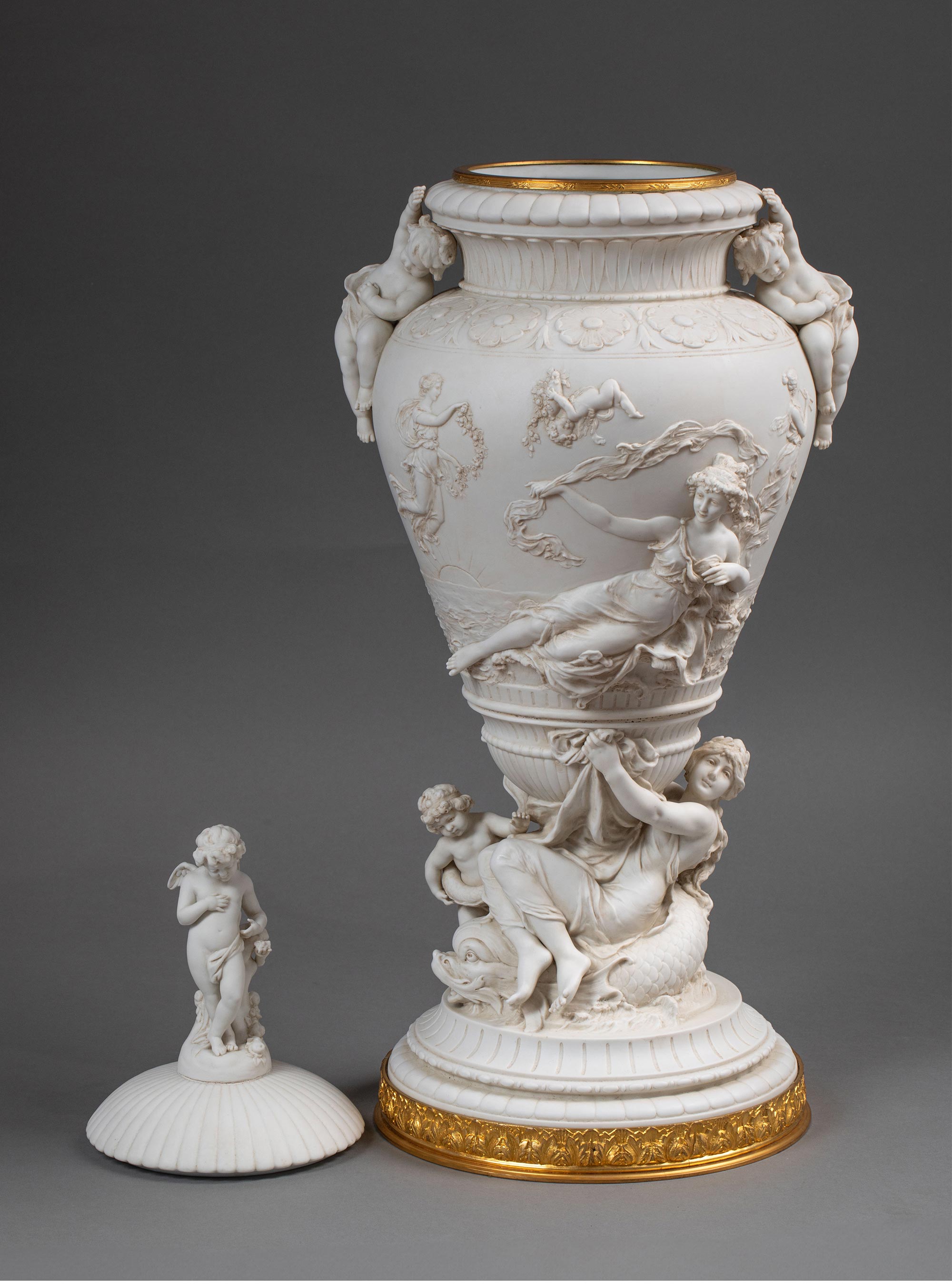 19世纪末法国艺术家E. JAMMES签名出品铜鎏金精雕装饰维纳斯与丘比特主题素胎瓷浮雕带盖花瓶