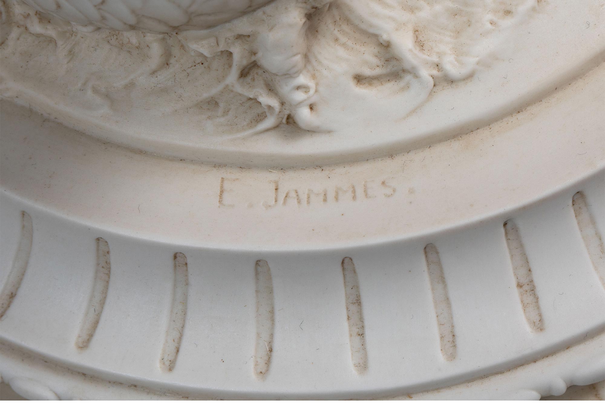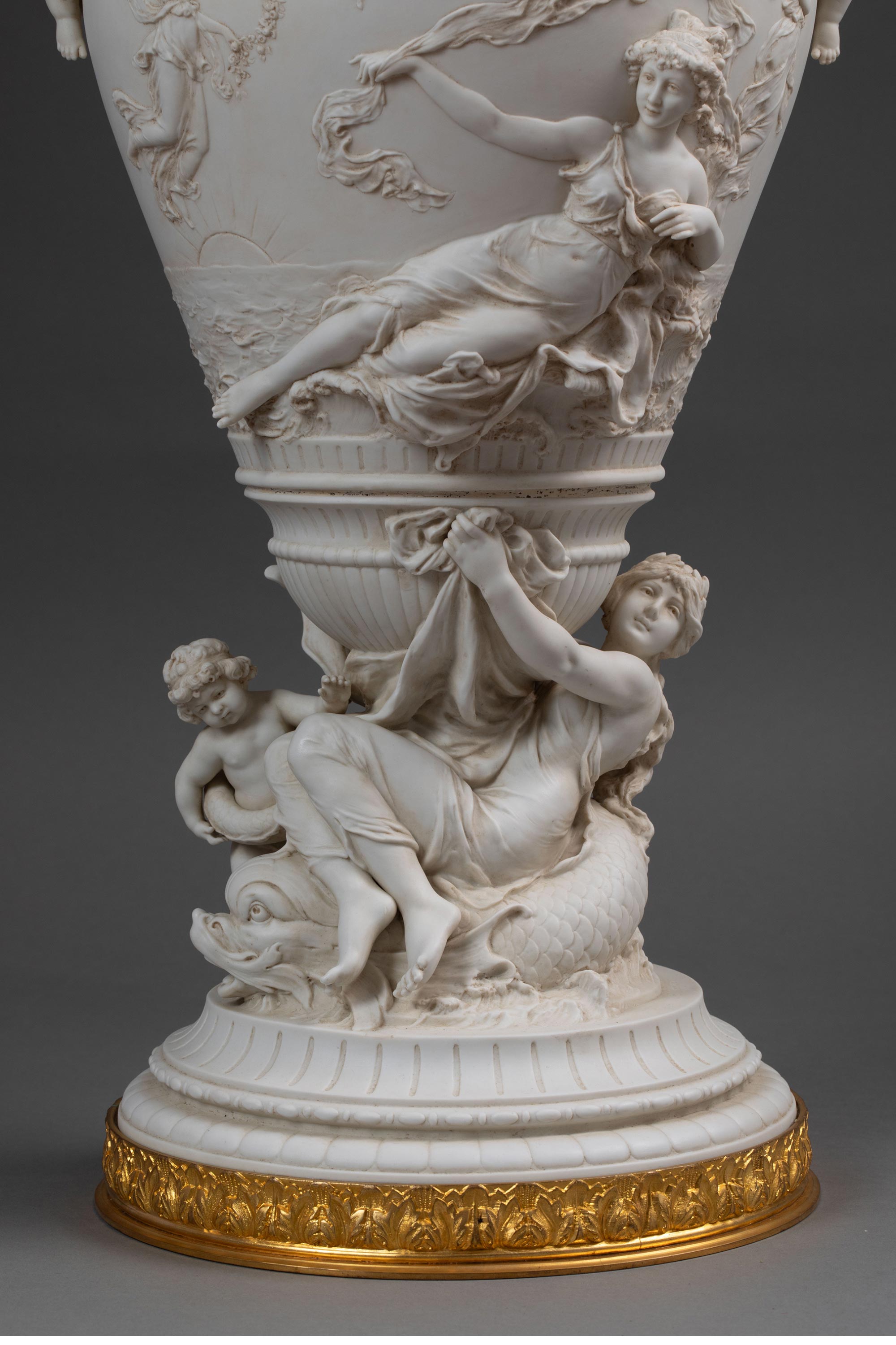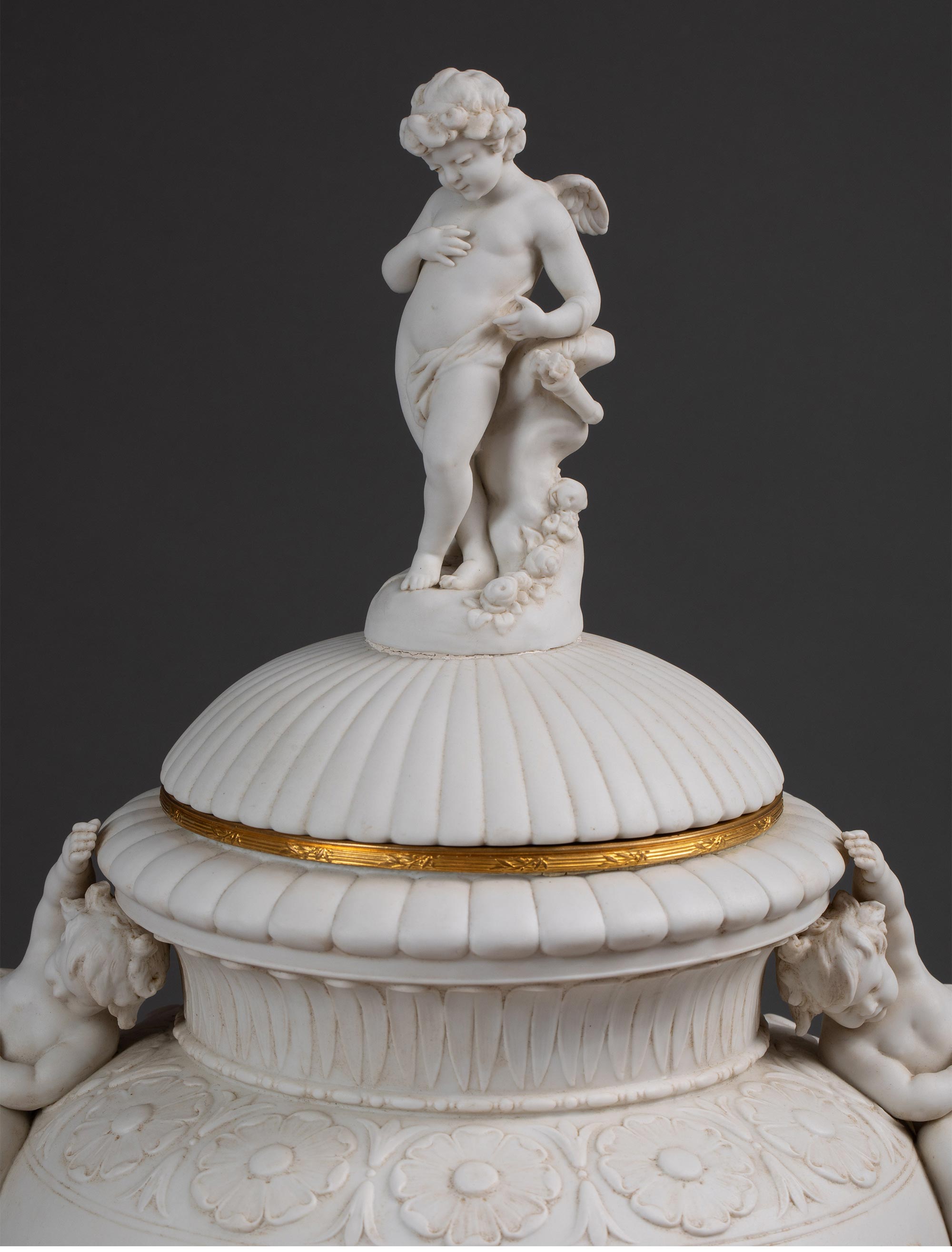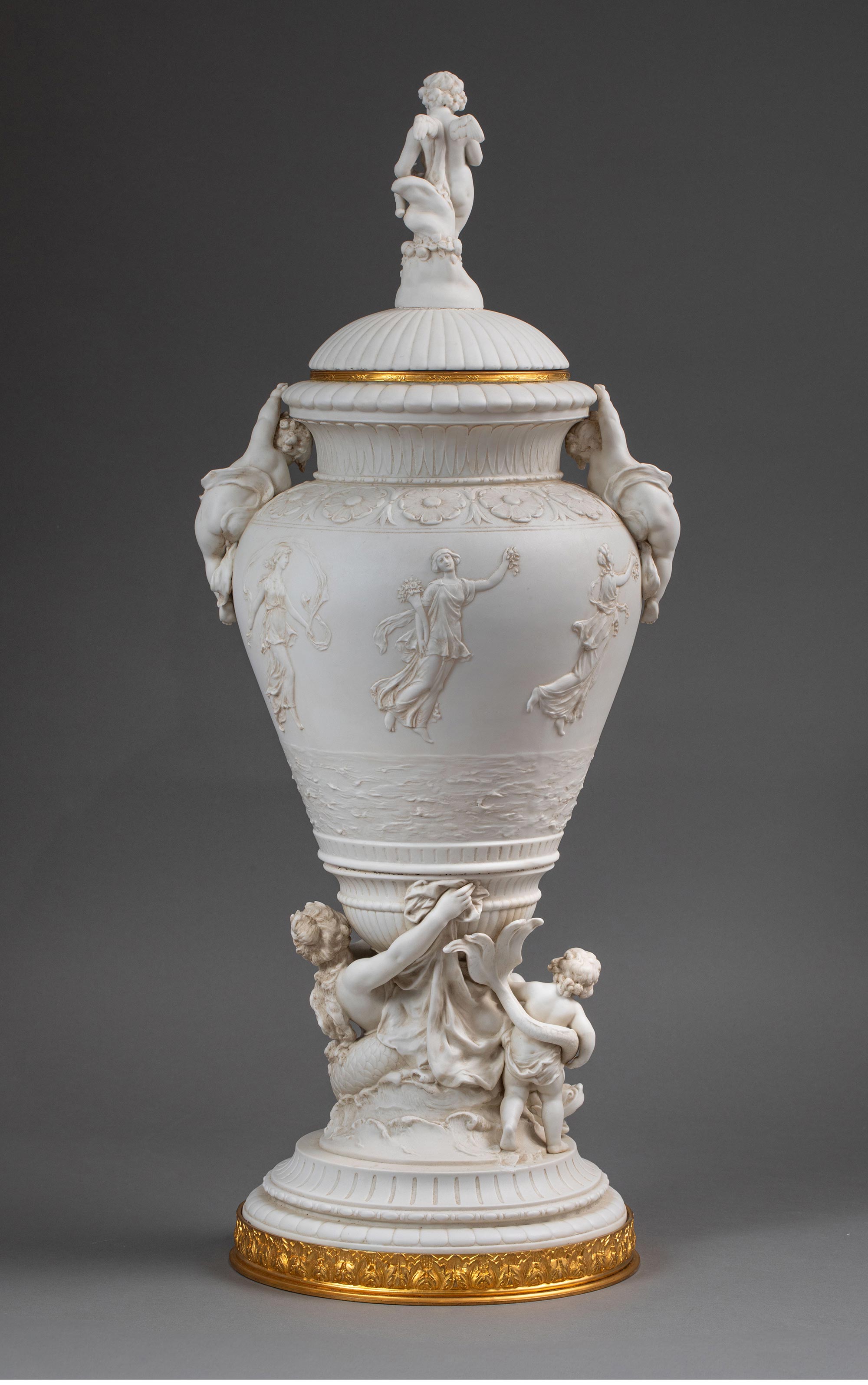 19世纪末法国艺术家E. JAMMES签名出品铜鎏金精雕装饰维纳斯与丘比特主题素胎瓷浮雕带盖花瓶
