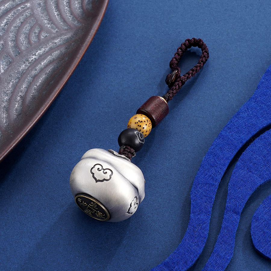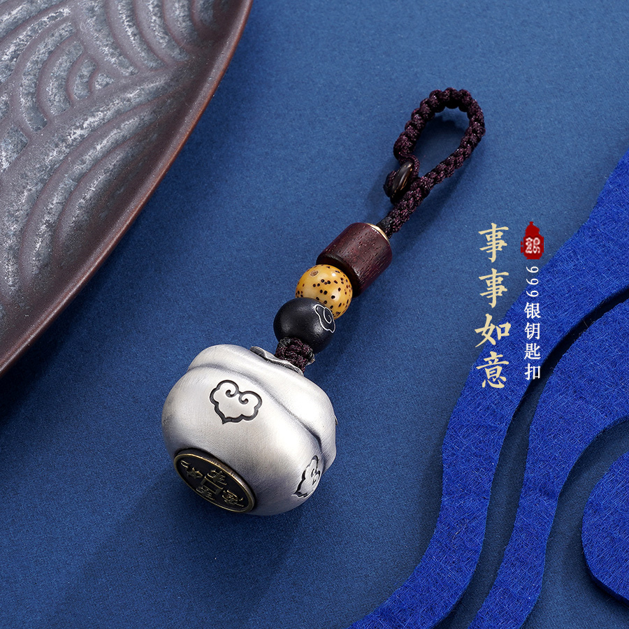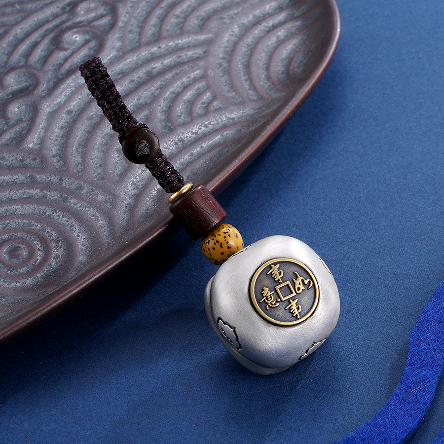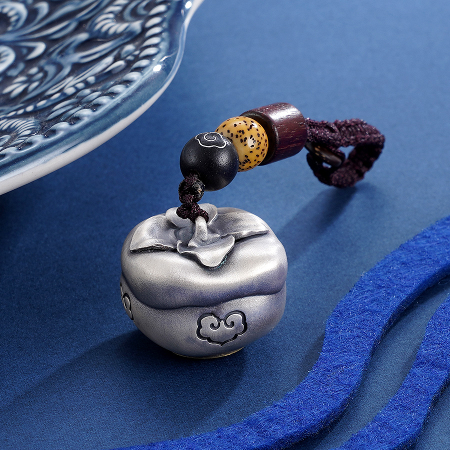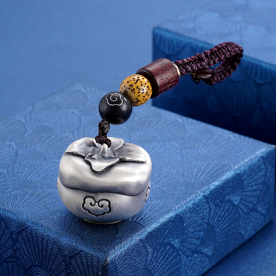 【寓意】:足银材质手把件,立体感十足,外侧錾刻如意,底部镶嵌铜钱。整体造型饱满可爱,寓意万事顺心,万“柿”如意。