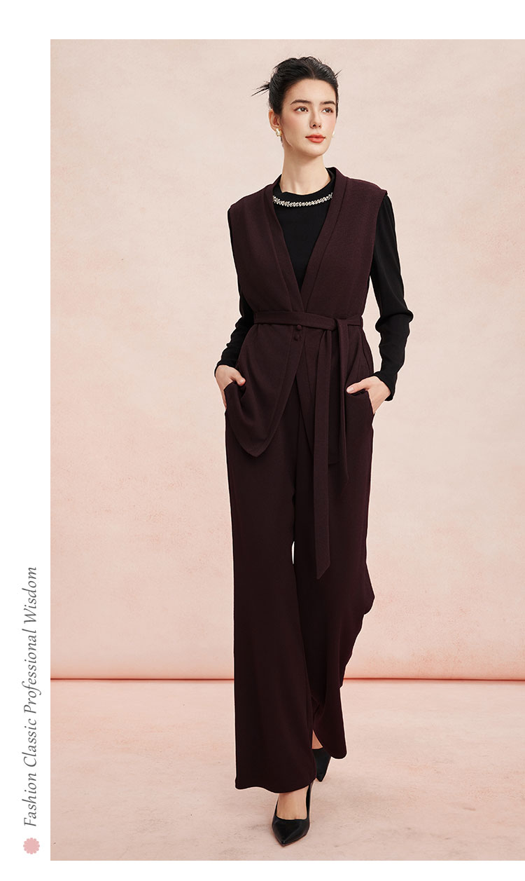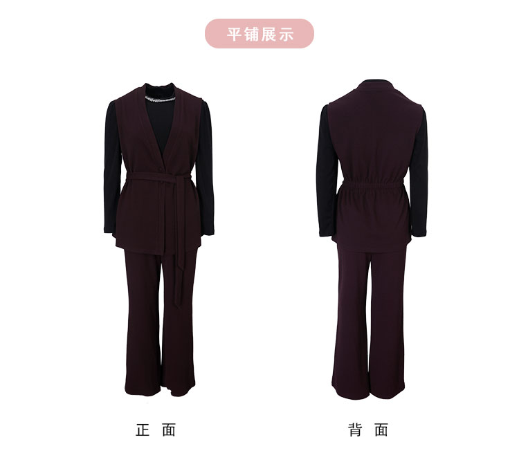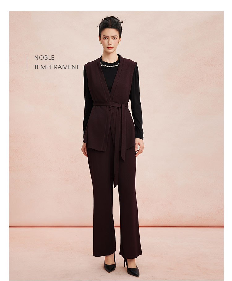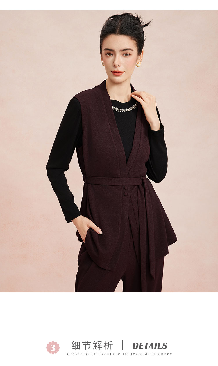 RE401斯尔丽26新款小香风V领马甲外套+打底衫+直筒长裤免搭配三件套装
