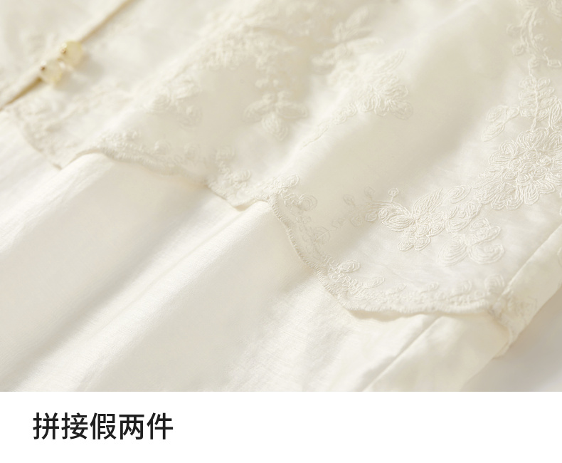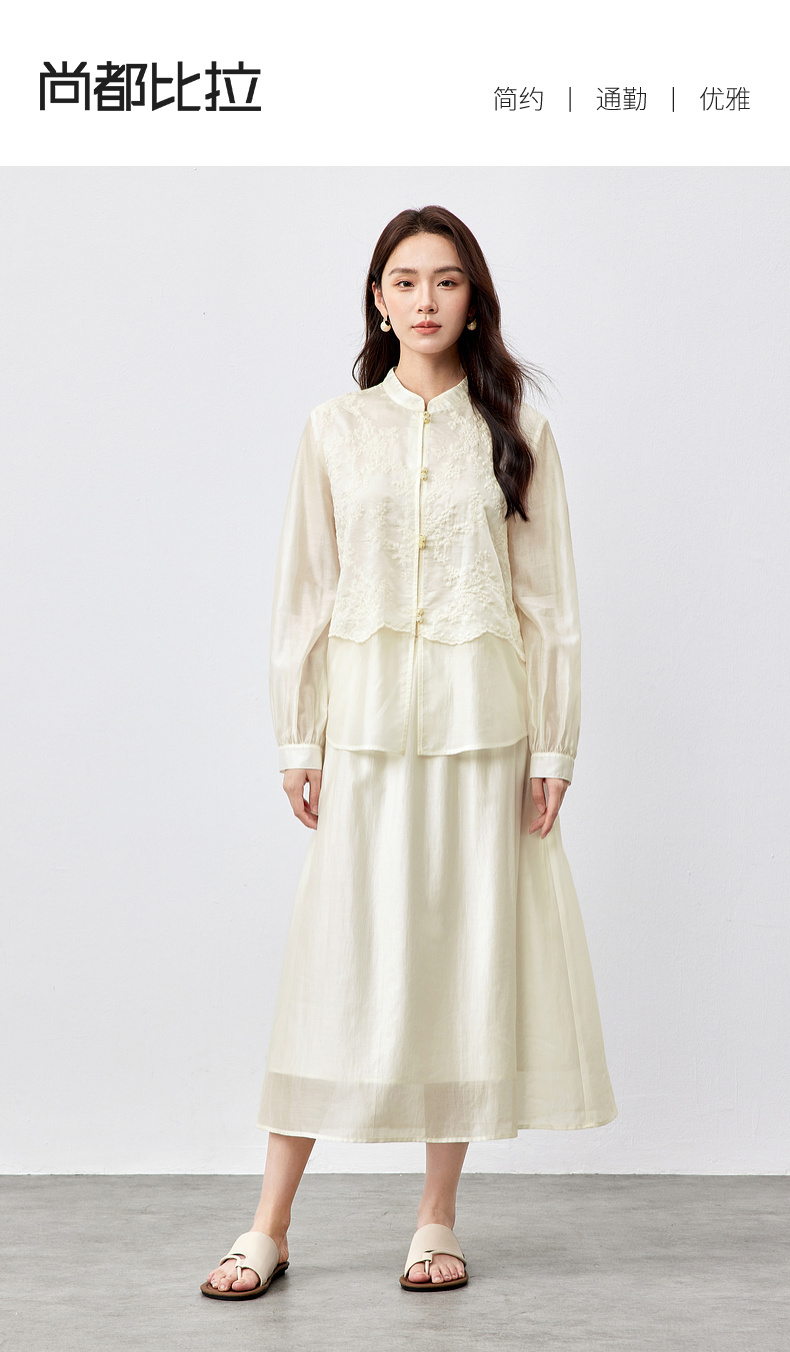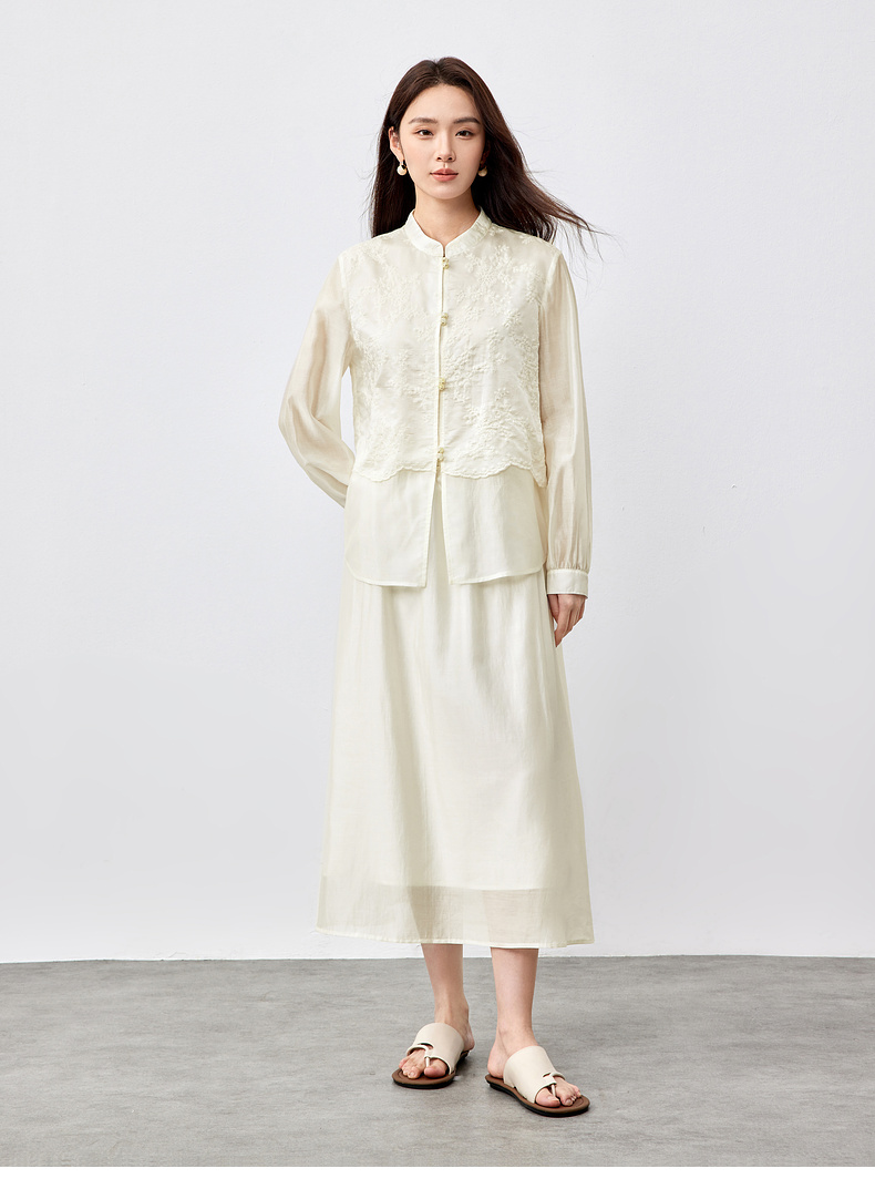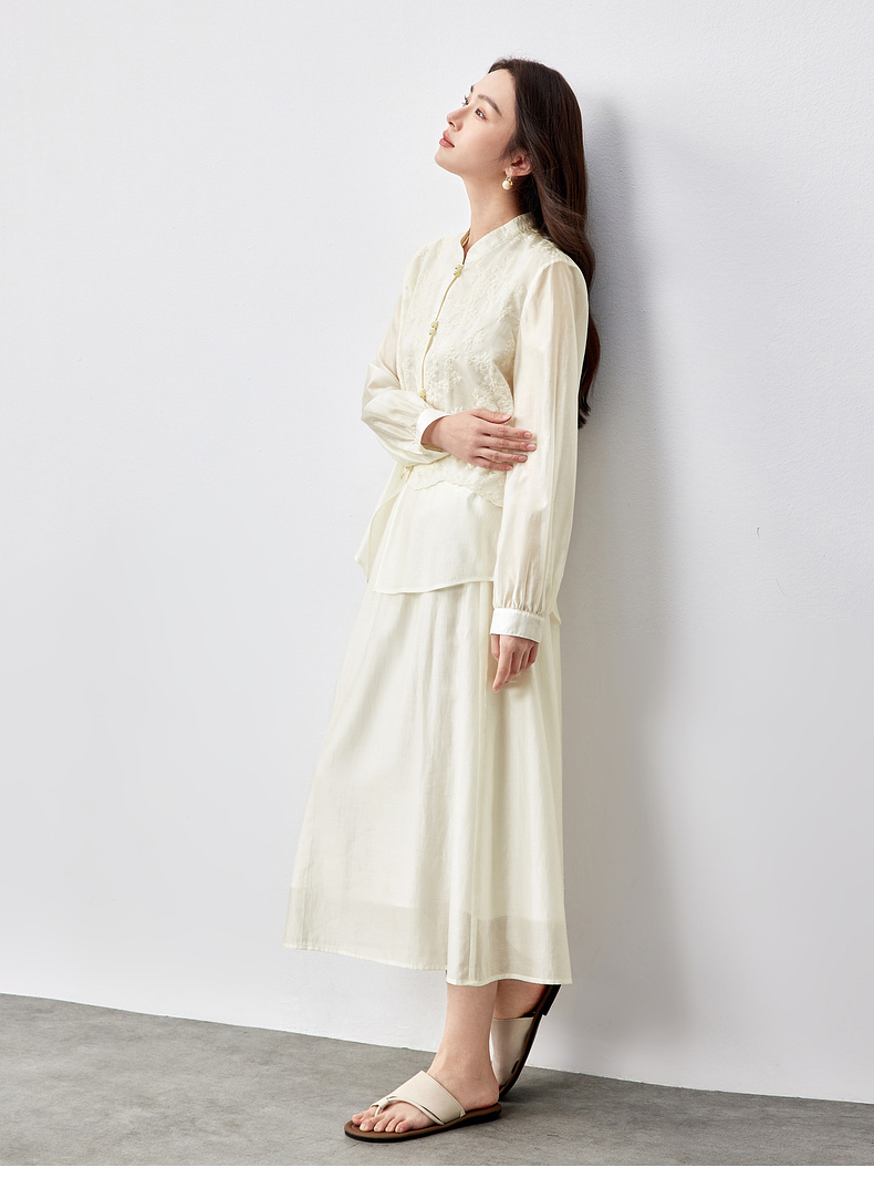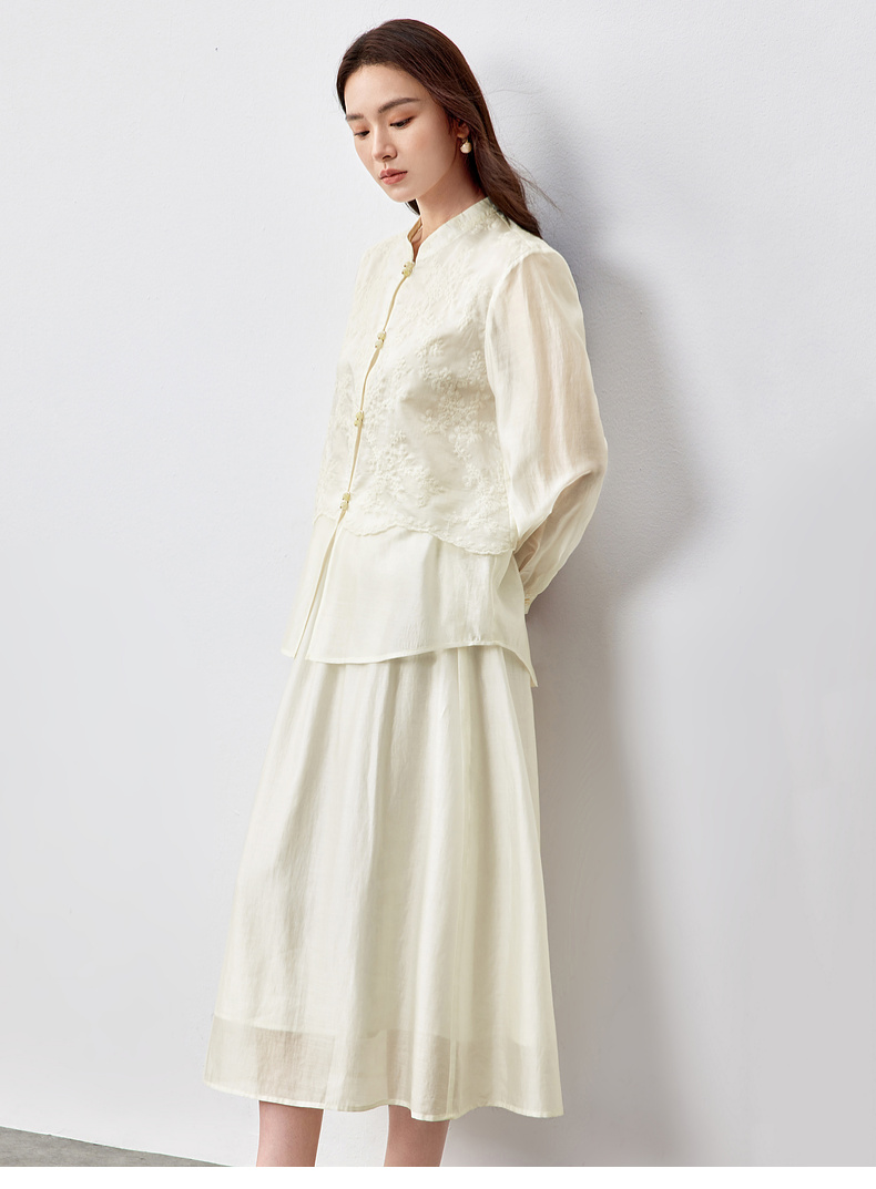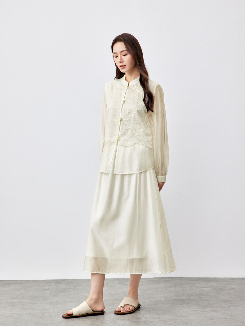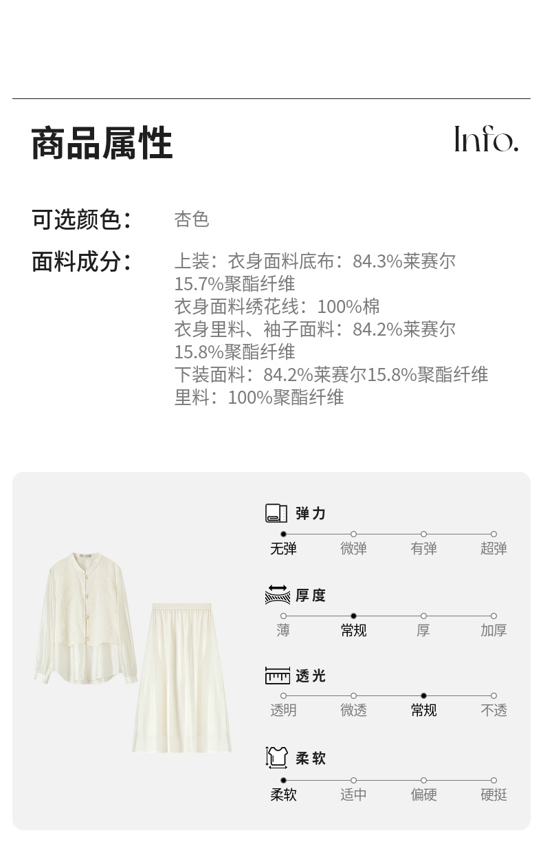 【内购】【抗起球莱赛尔套装】国风拼接假两件上衣&松紧腰中长A字裙两件套-151Z57874