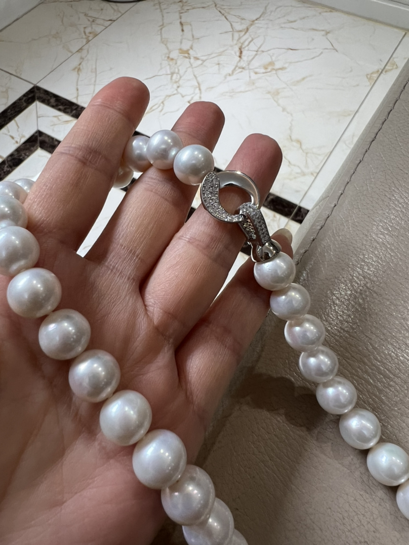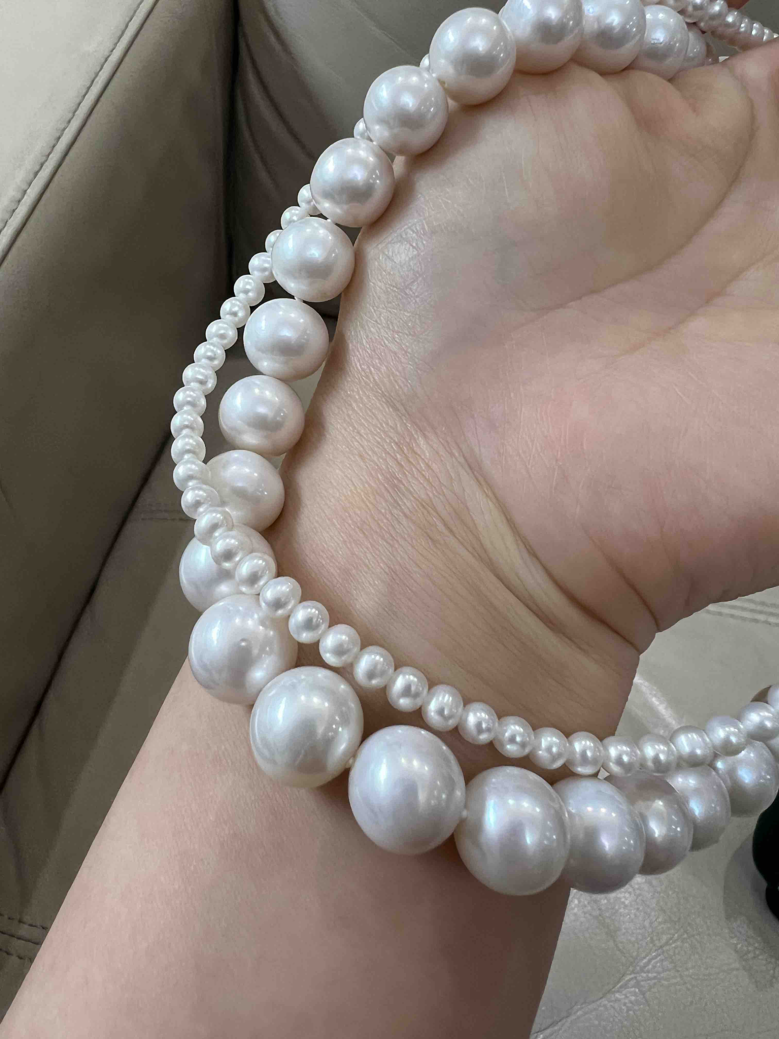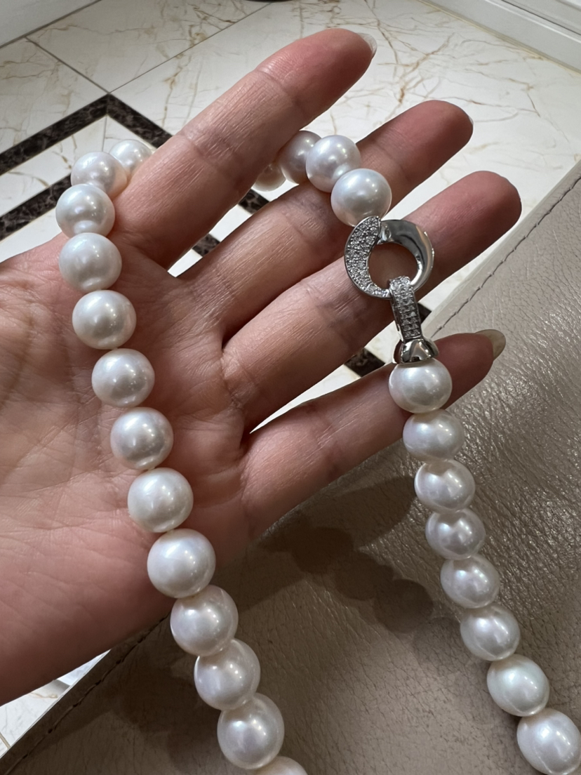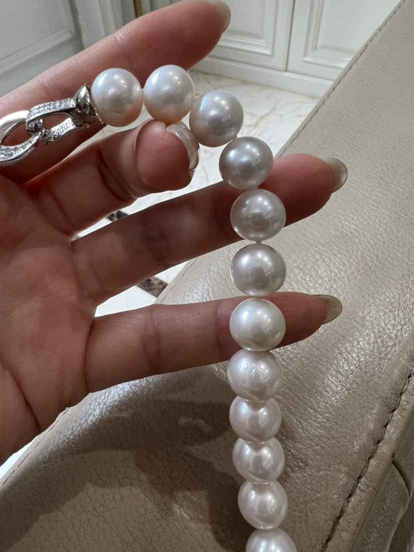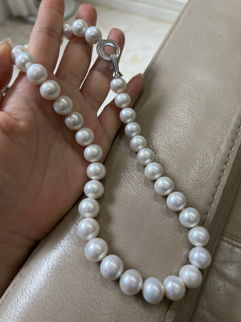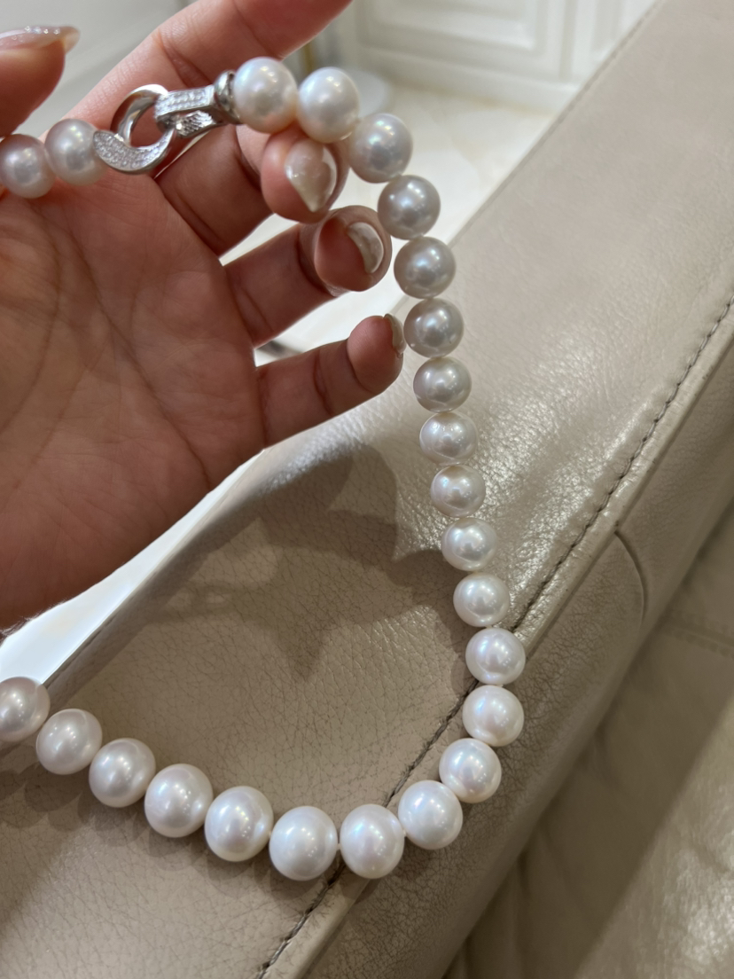 这种稀缺大珠珠,真的很少见了。不是随随便便的淡水珠都能澳白平替,它替不了。这条的优点在于,有澳白的冷光,就显得分外高级。光泽度很好,微瑕真的社交距离完全看不出。