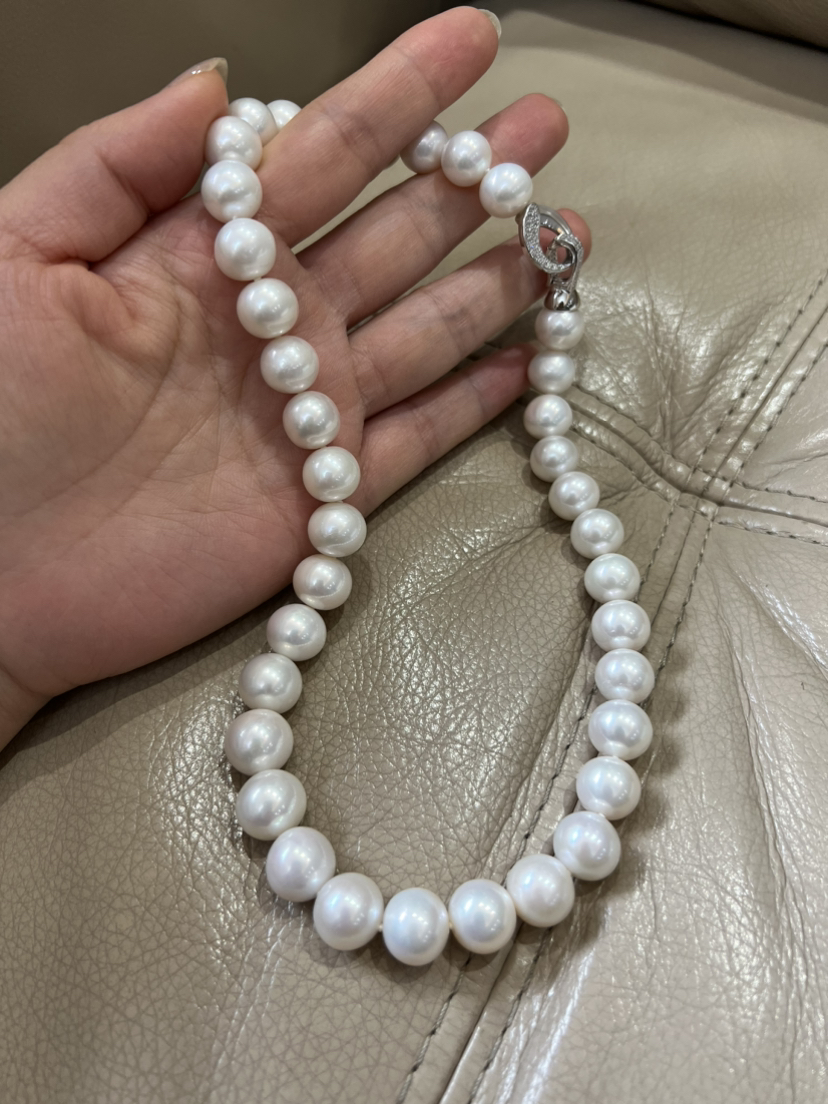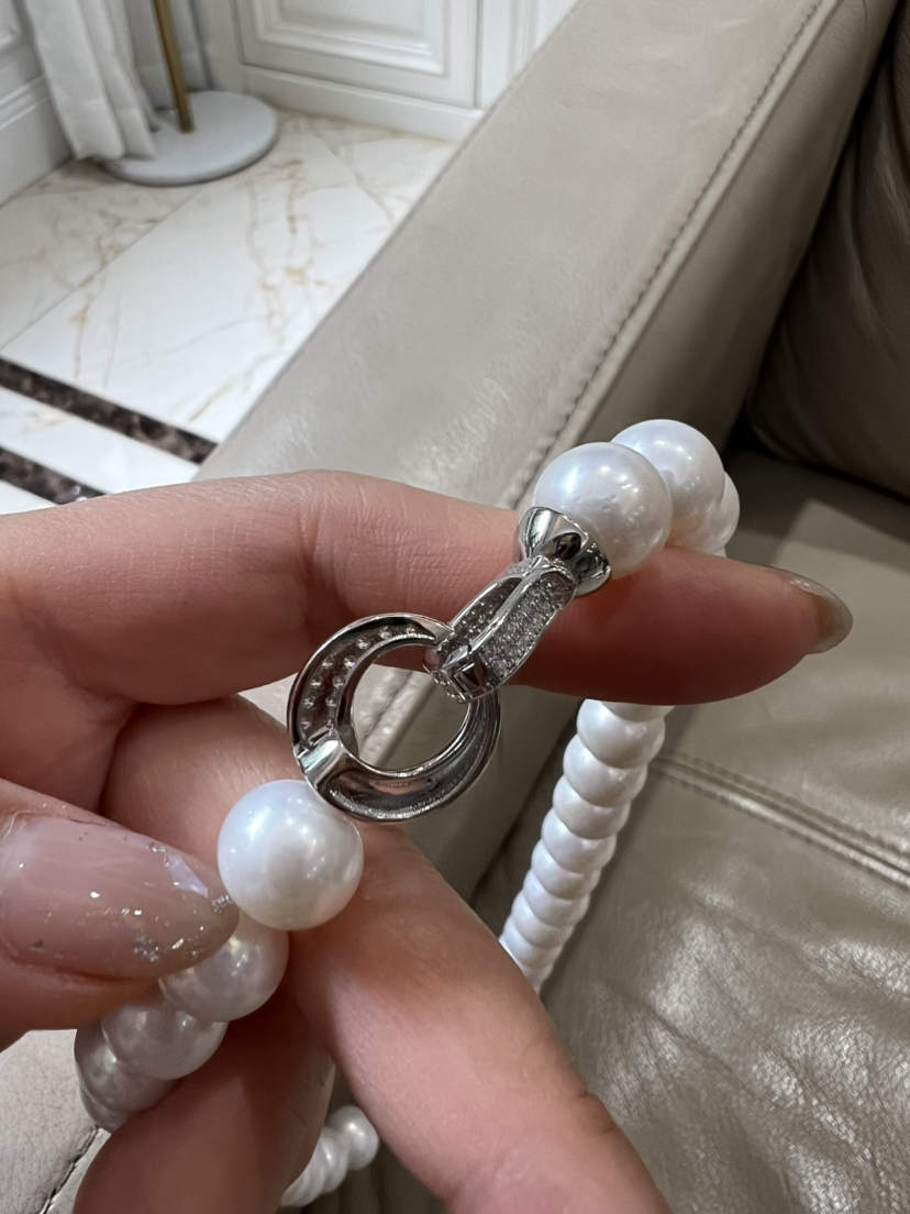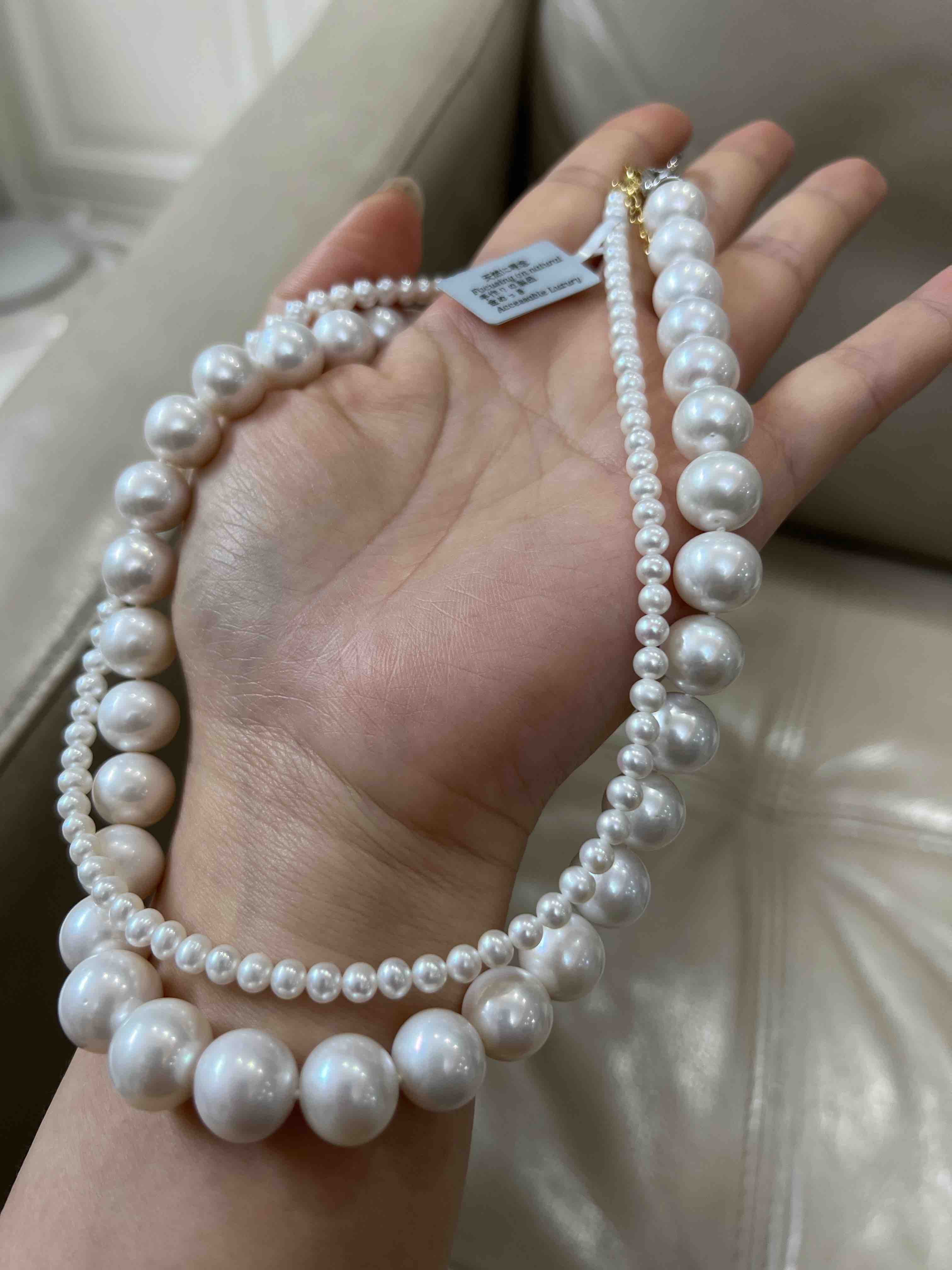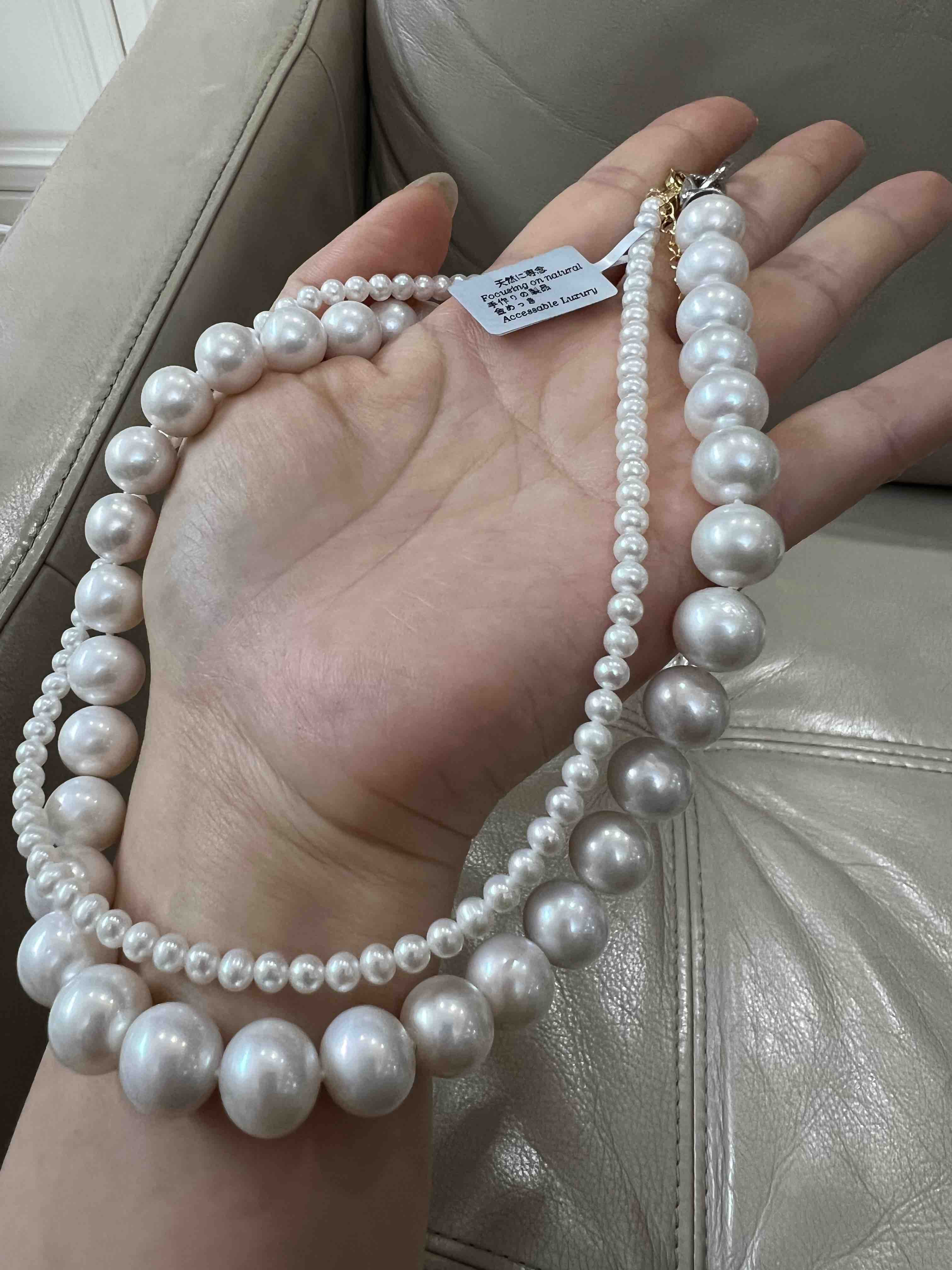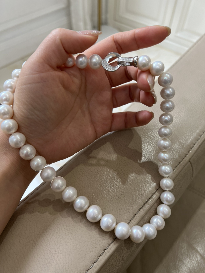 这种稀缺大珠珠,真的很少见了。不是随随便便的淡水珠都能澳白平替,它替不了。这条的优点在于,有澳白的冷光,就显得分外高级。光泽度很好,微瑕真的社交距离完全看不出。