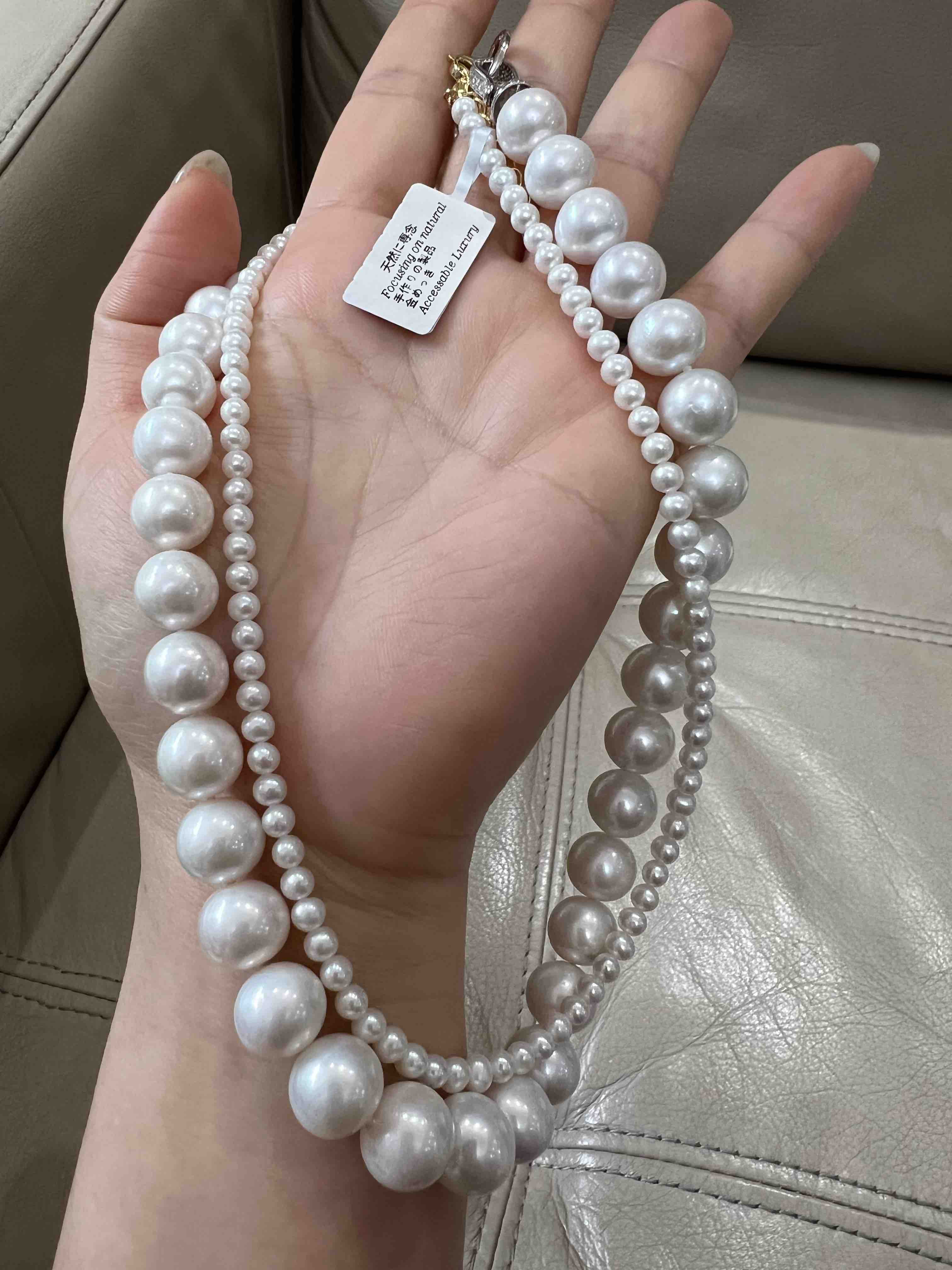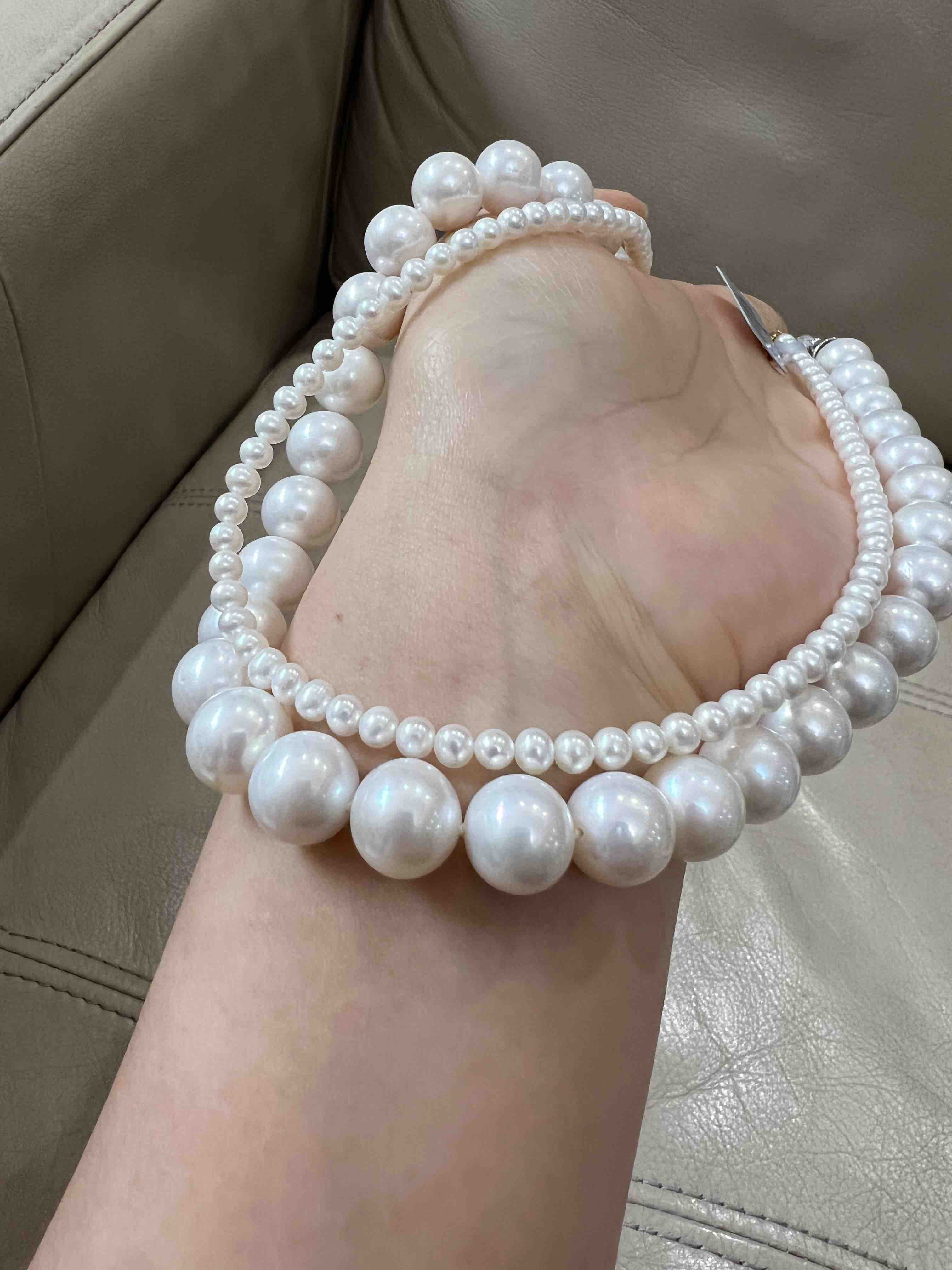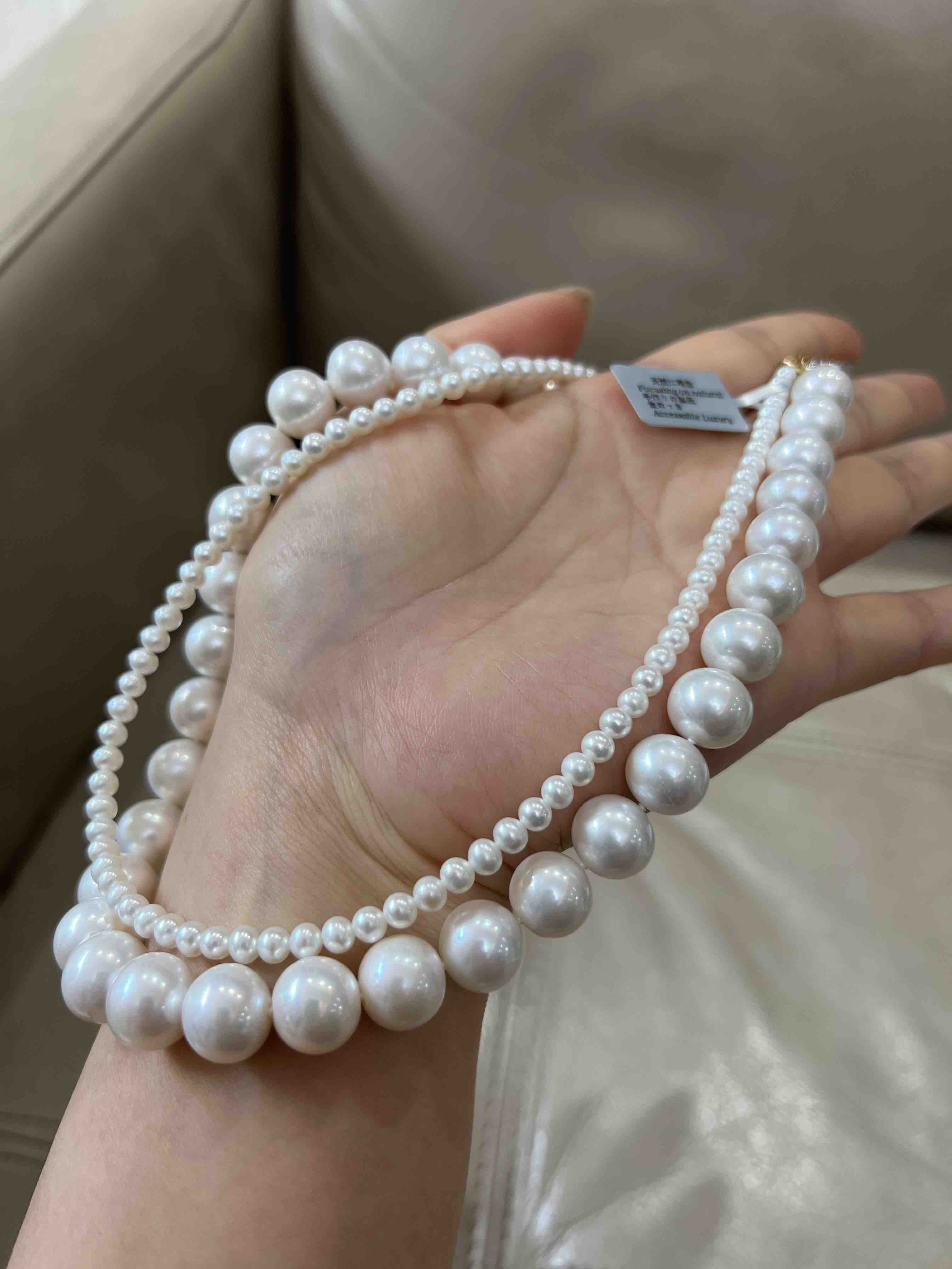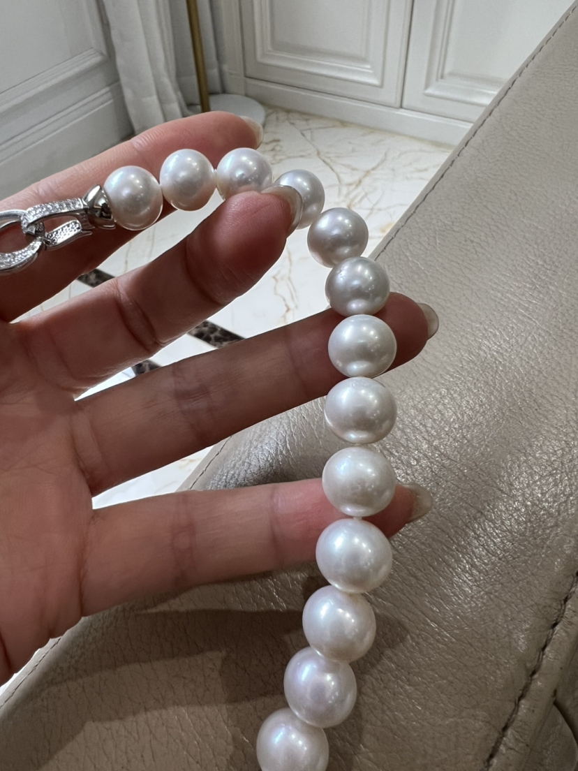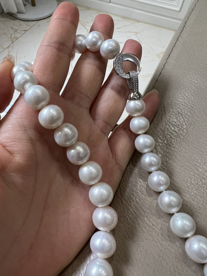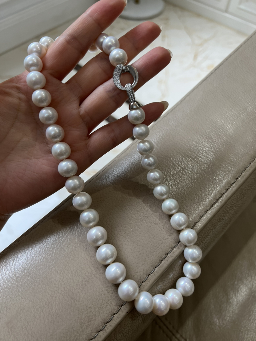 这种稀缺大珠珠,真的很少见了。不是随随便便的淡水珠都能澳白平替,它替不了。这条的优点在于,有澳白的冷光,就显得分外高级。光泽度很好,微瑕真的社交距离完全看不出。