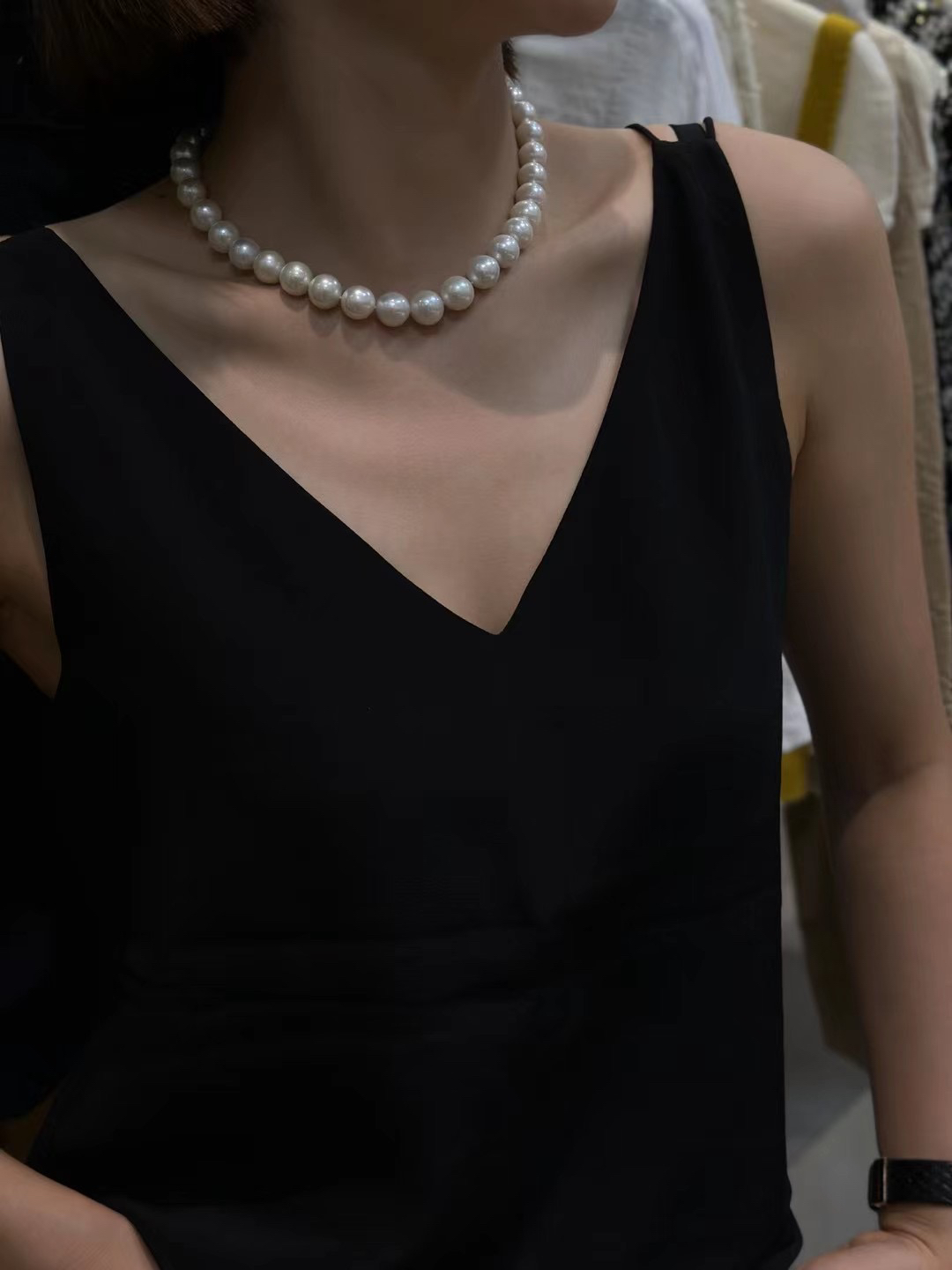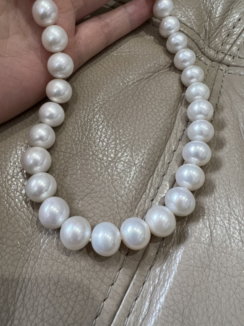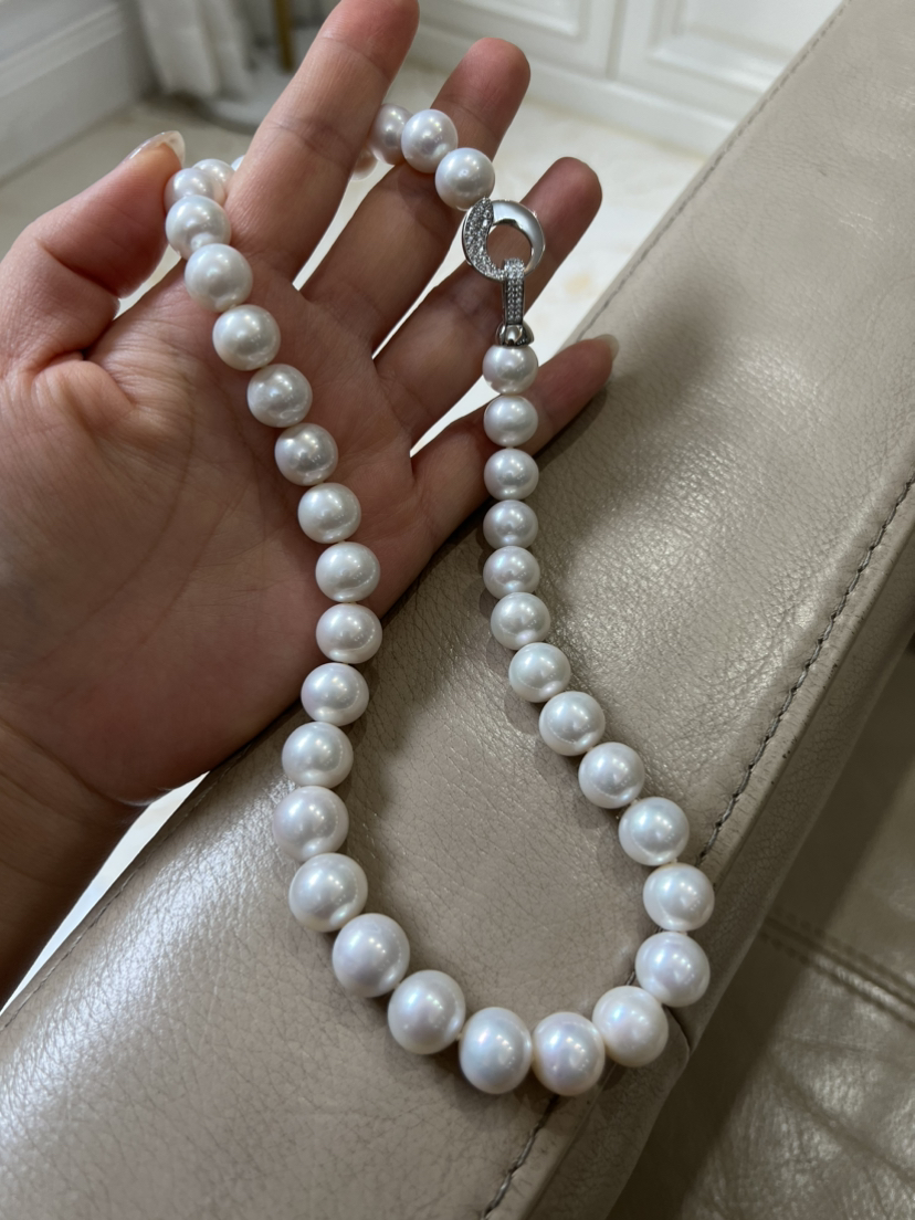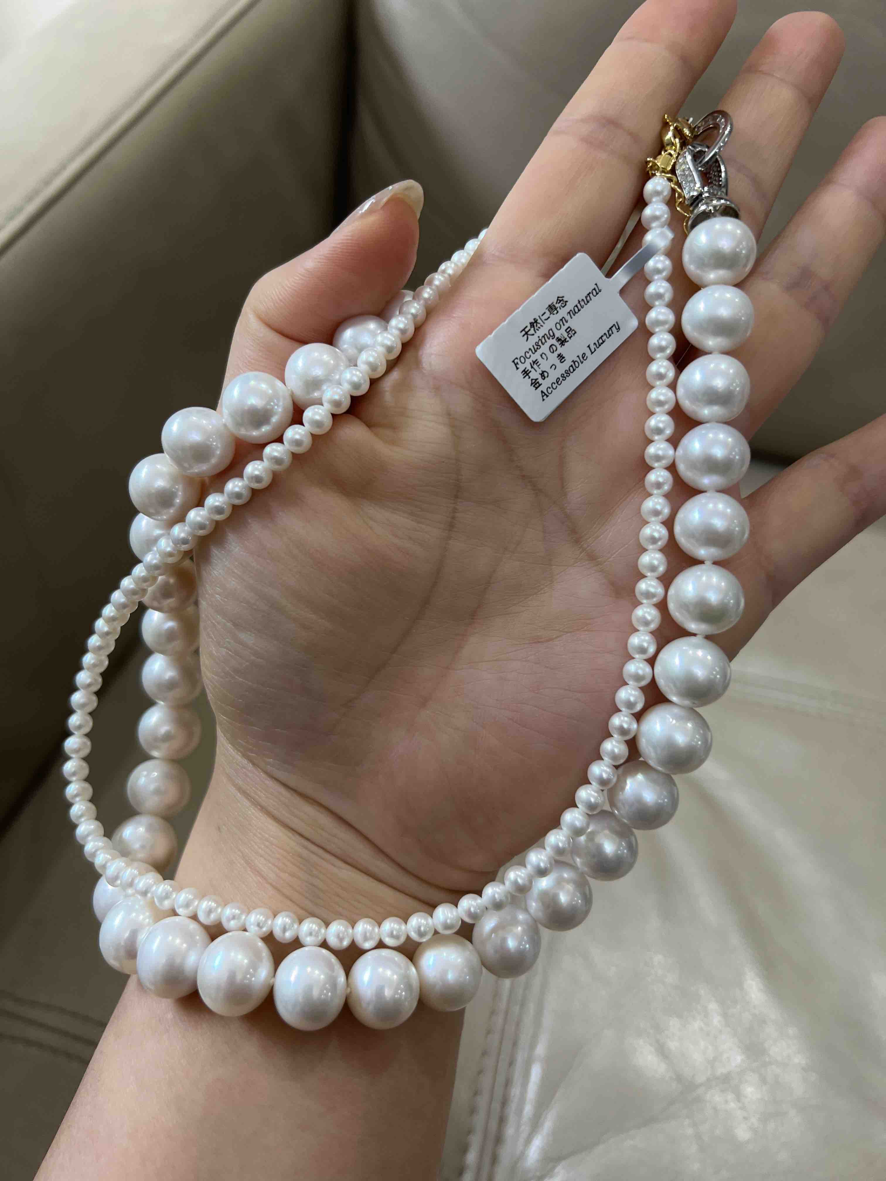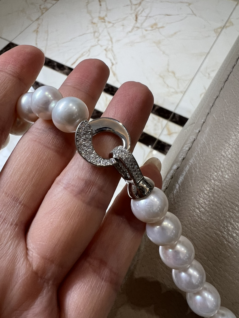 这种稀缺大珠珠,真的很少见了。不是随随便便的淡水珠都能澳白平替,它替不了。这条的优点在于,有澳白的冷光,就显得分外高级。光泽度很好,微瑕真的社交距离完全看不出。