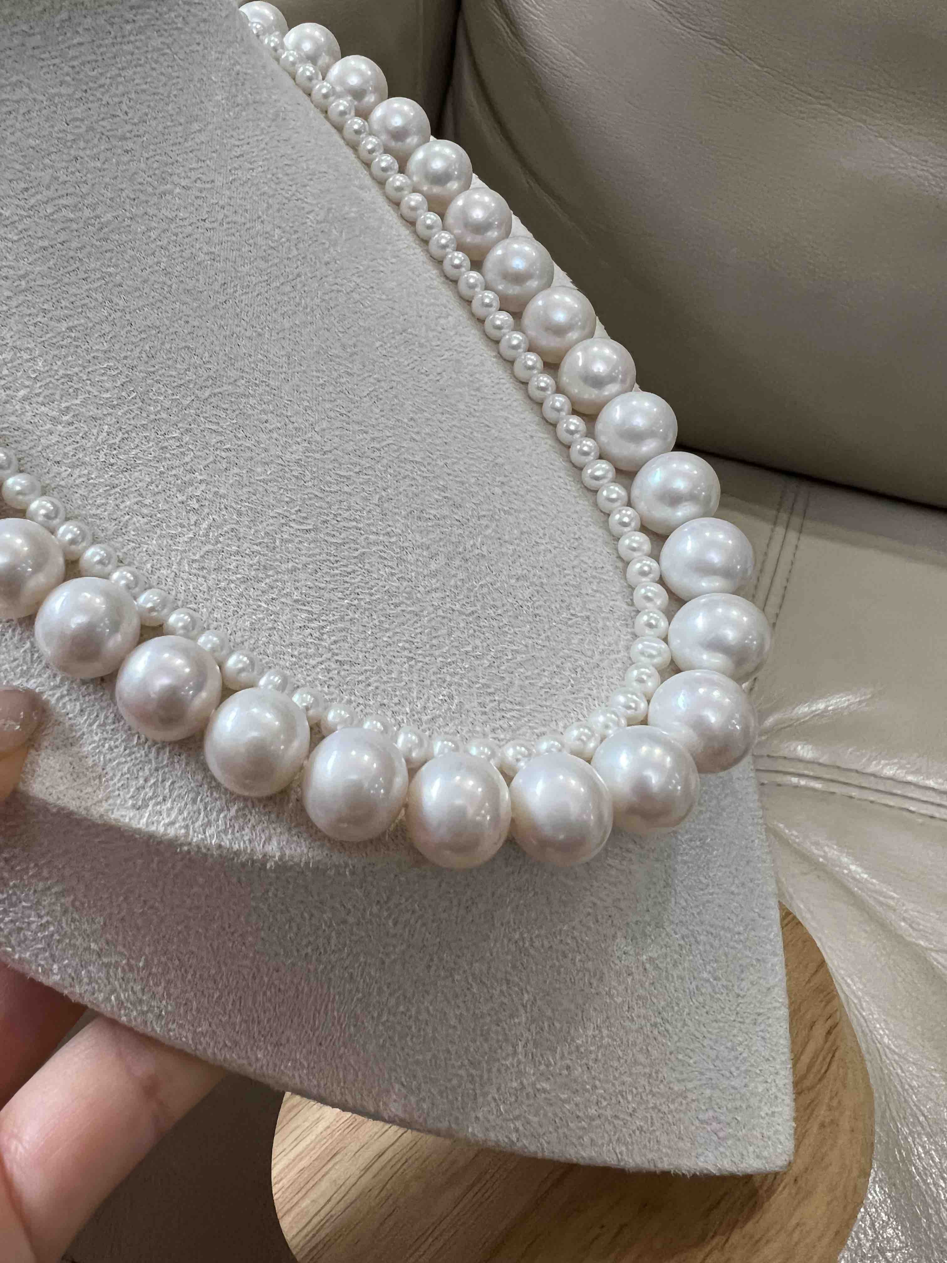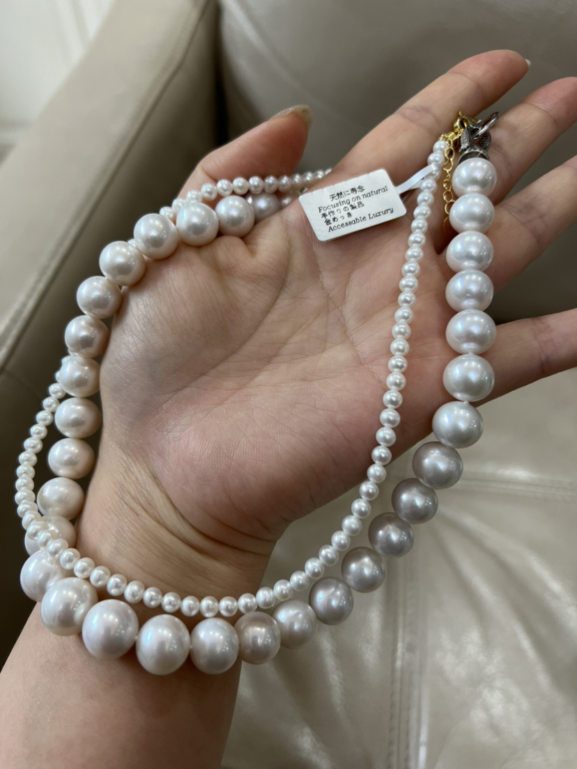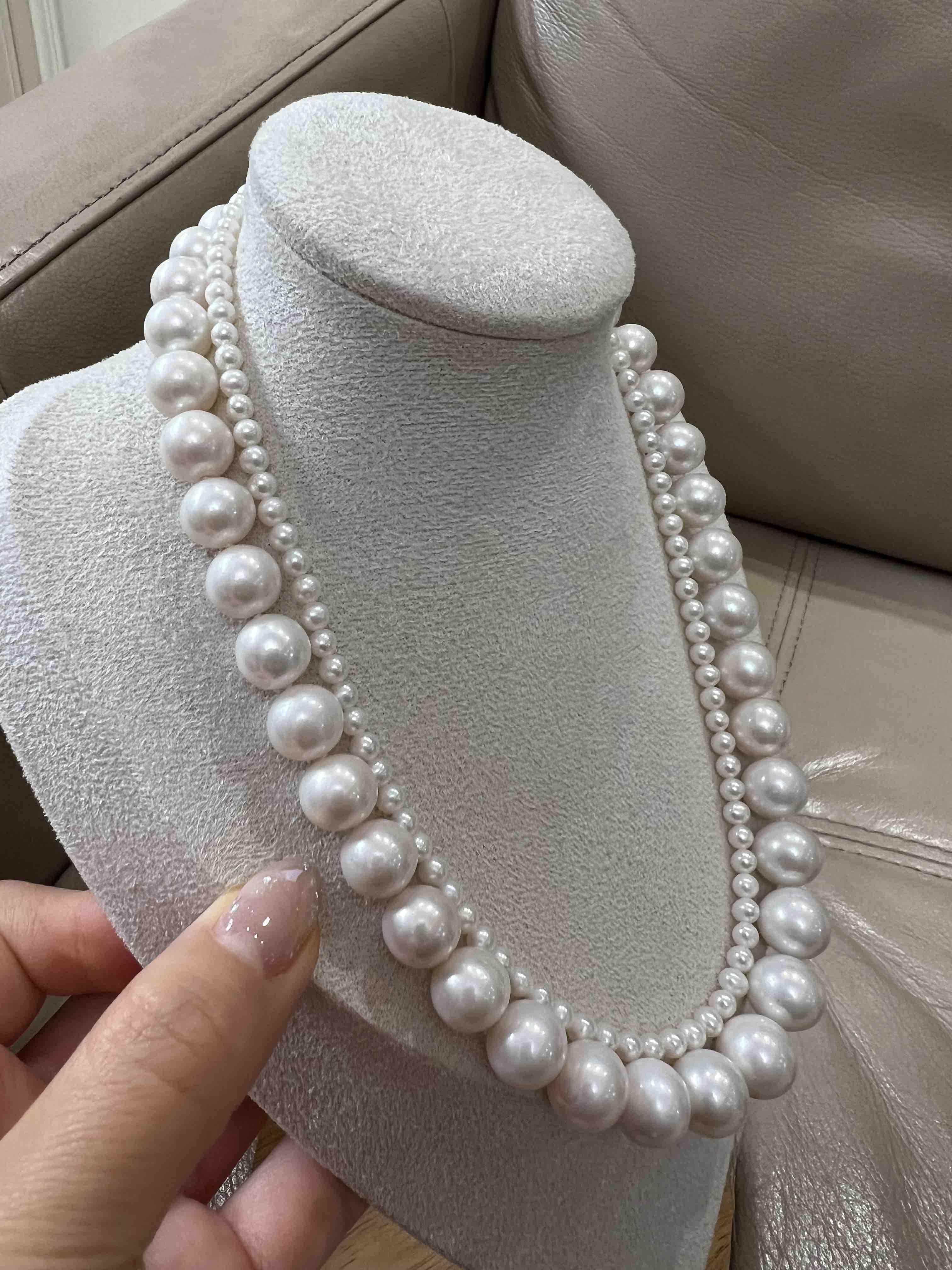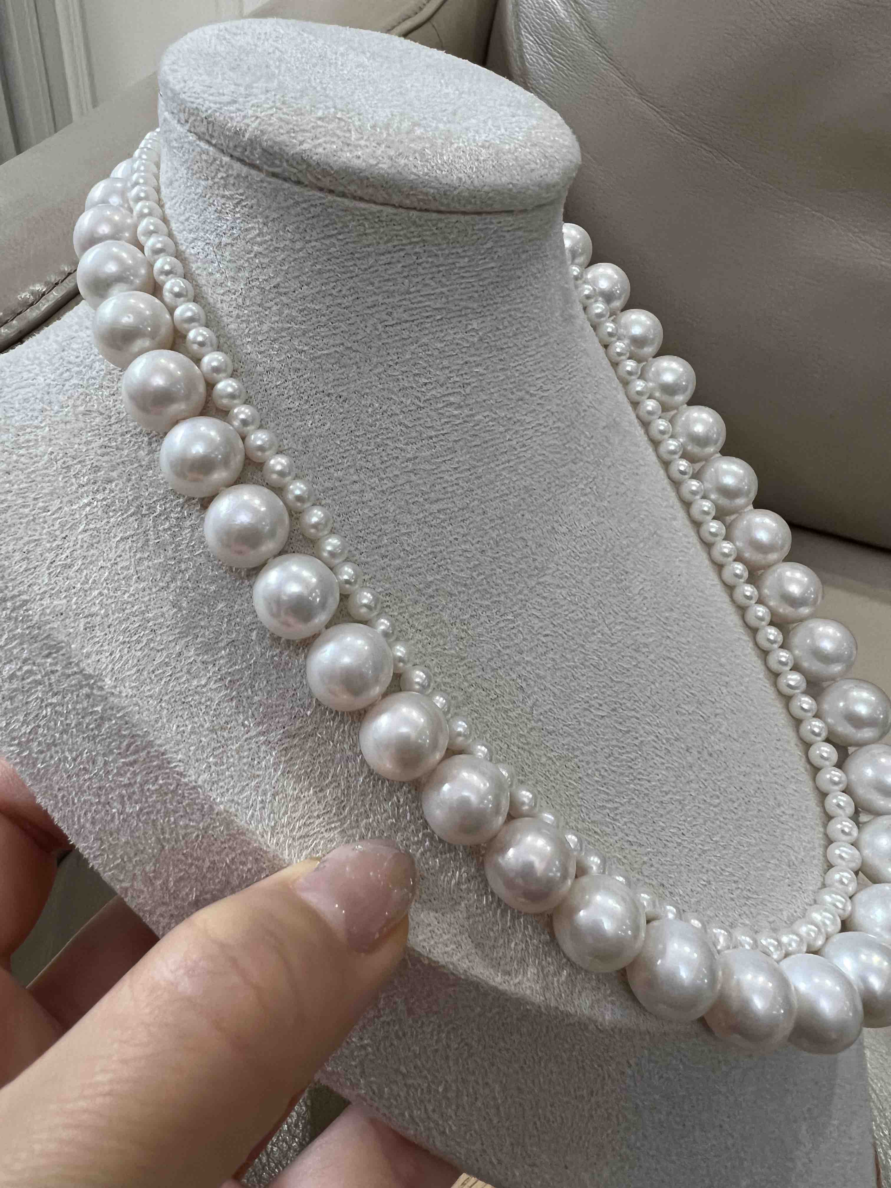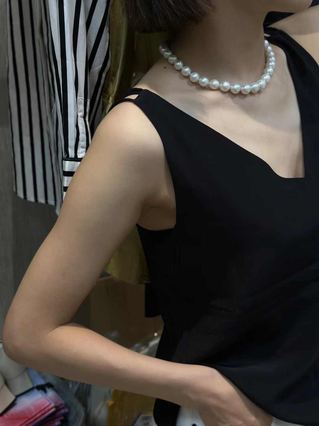 这种稀缺大珠珠,真的很少见了。不是随随便便的淡水珠都能澳白平替,它替不了。这条的优点在于,有澳白的冷光,就显得分外高级。光泽度很好,微瑕真的社交距离完全看不出。