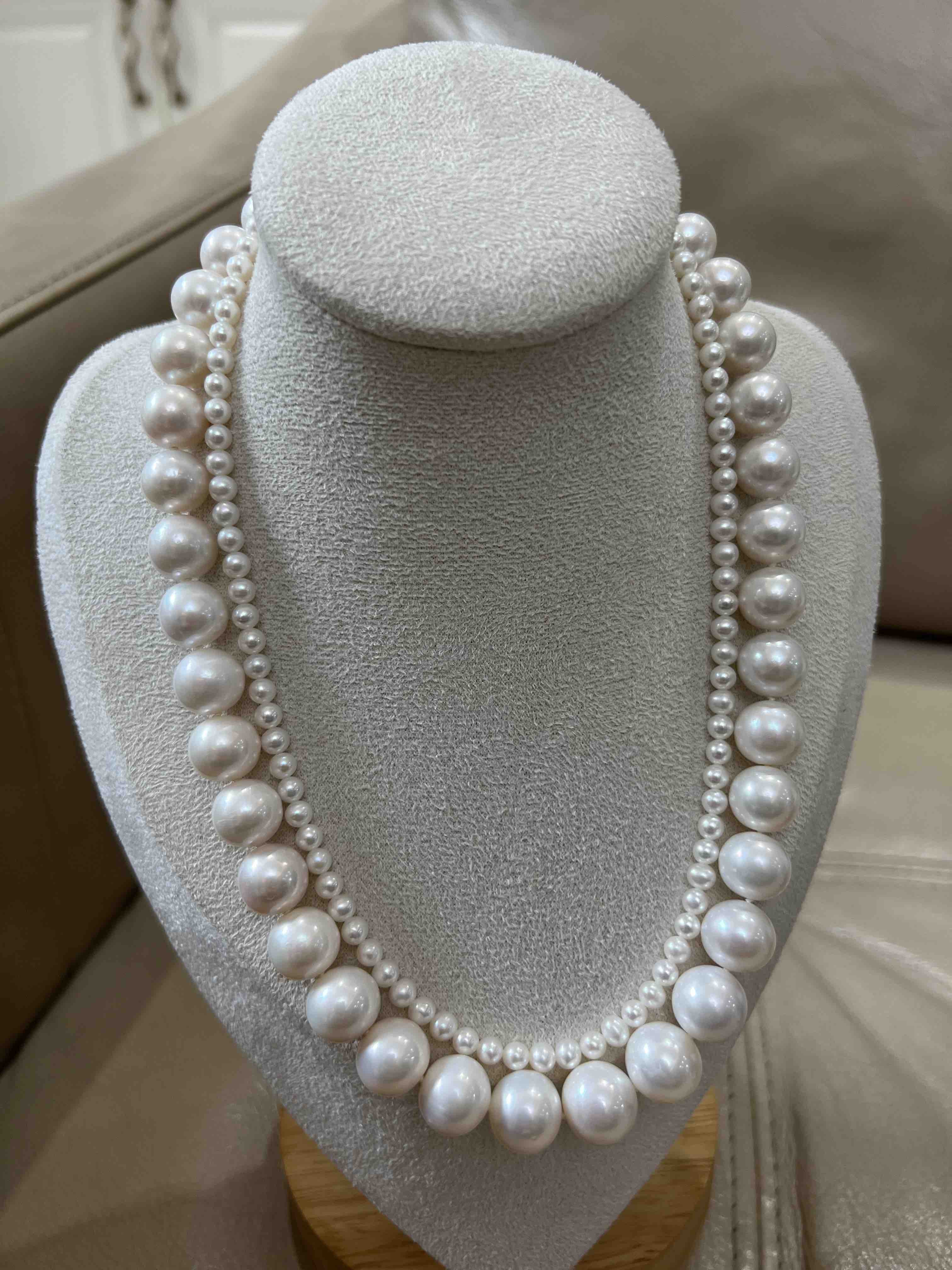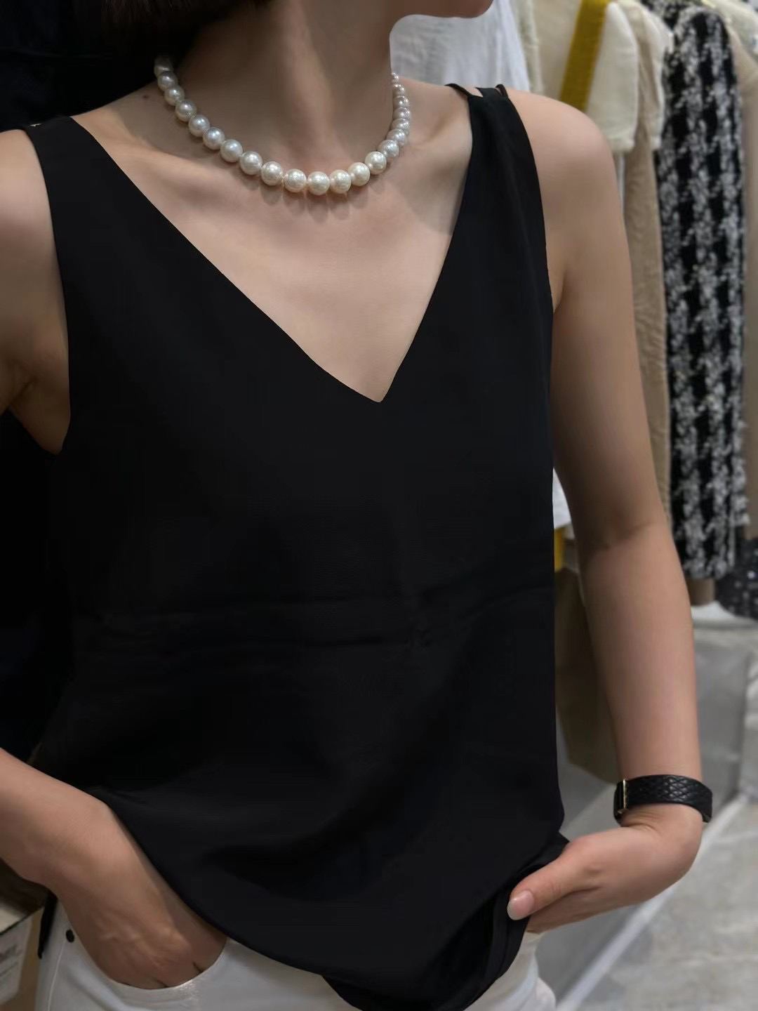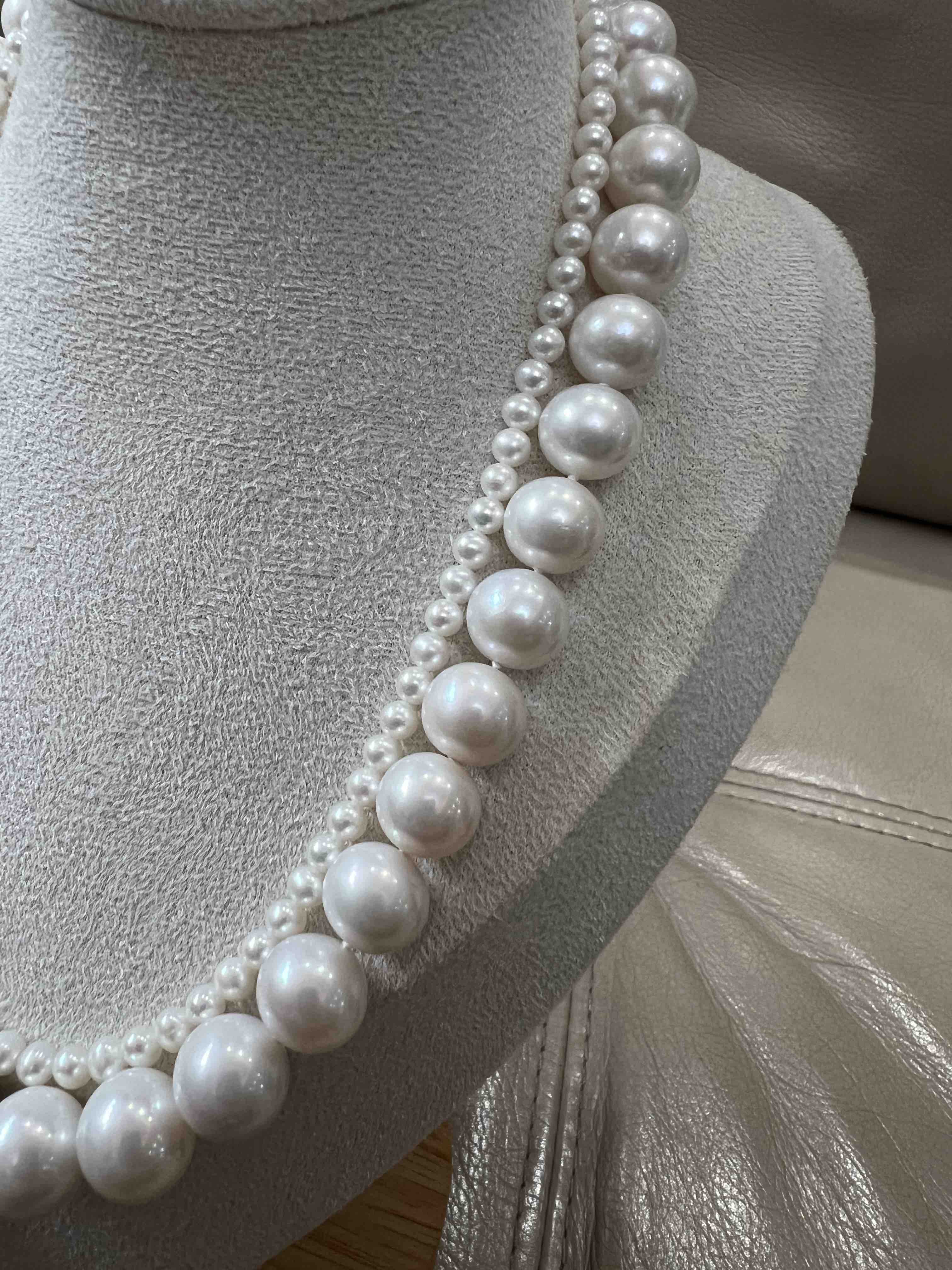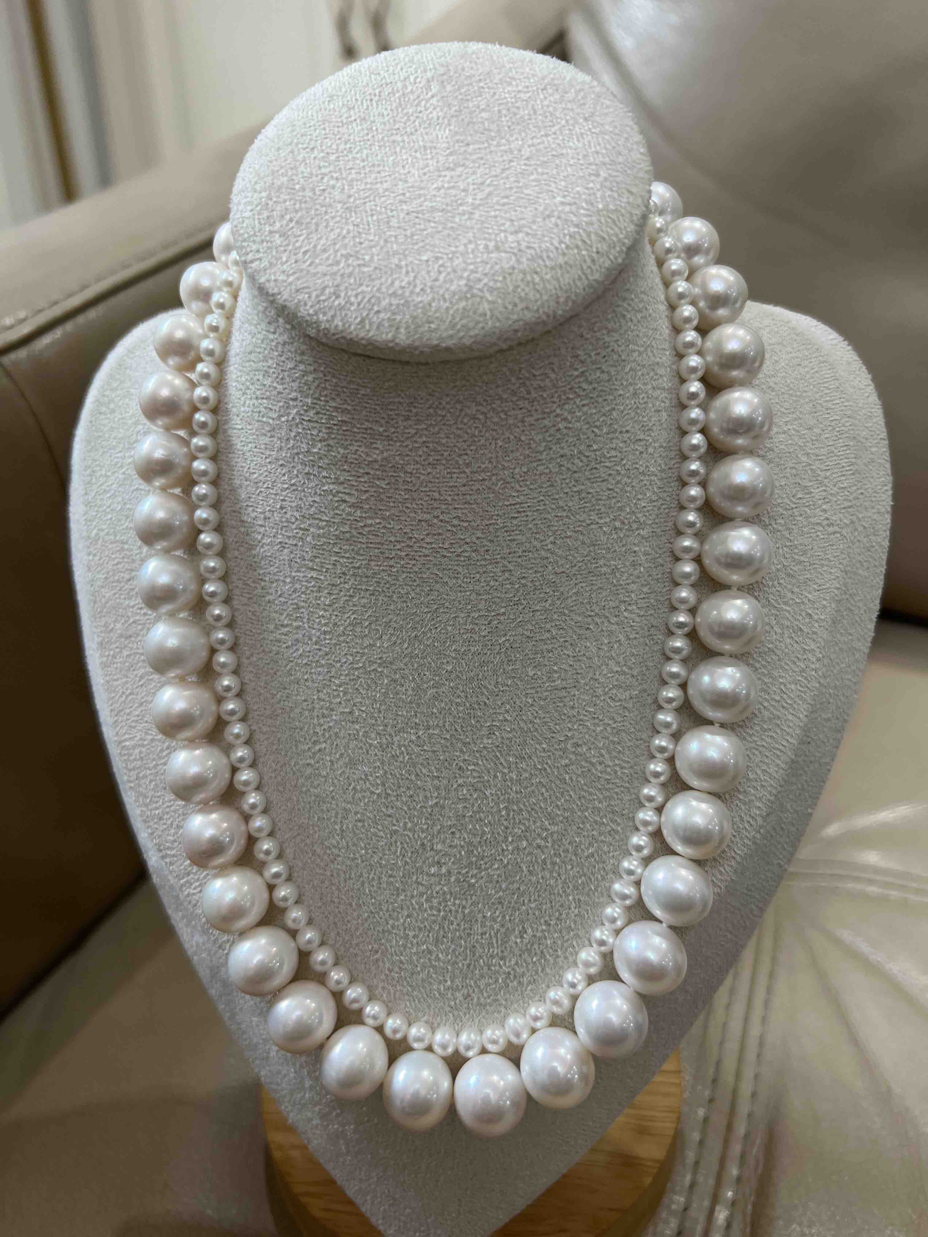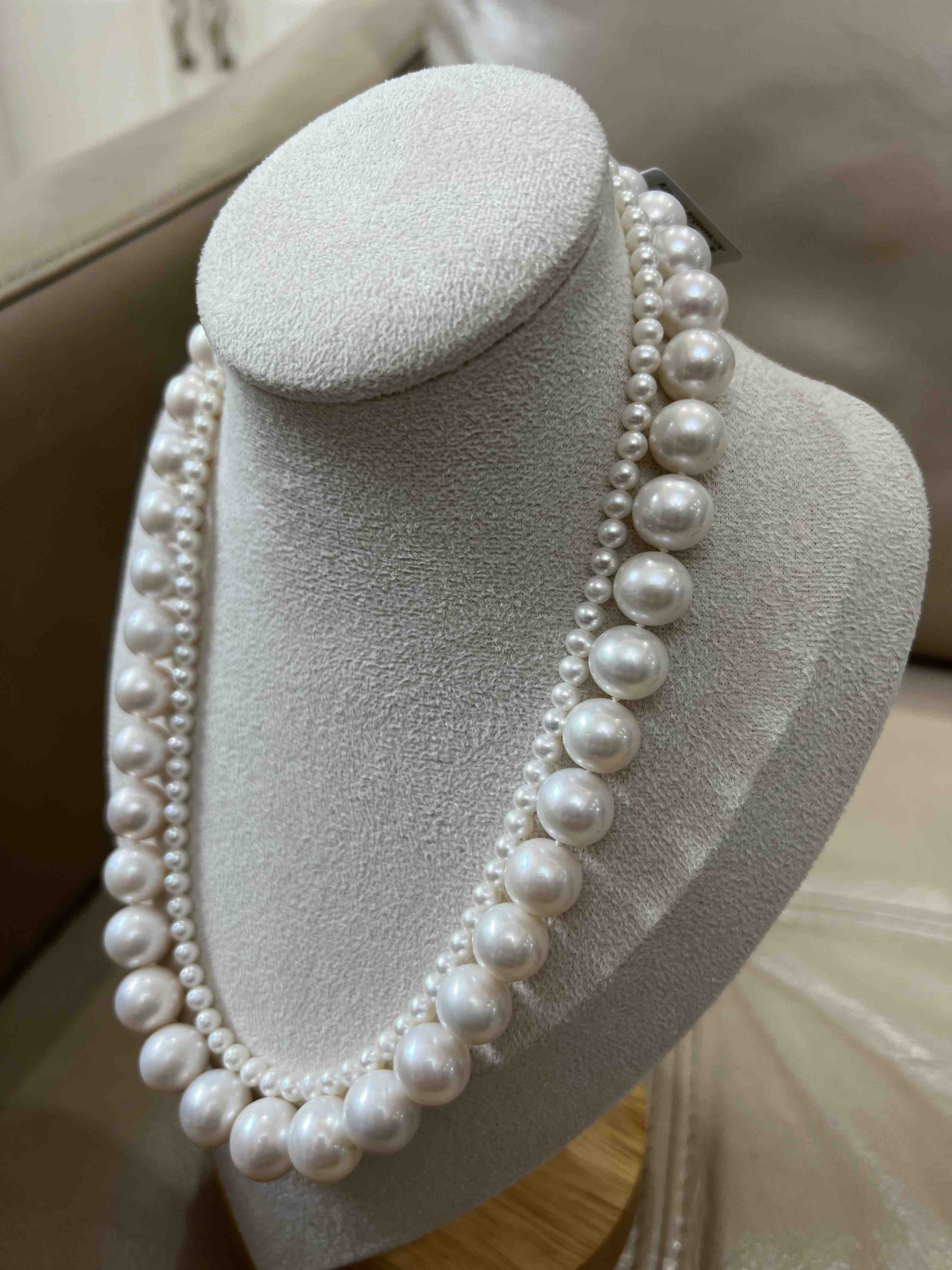 这种稀缺大珠珠,真的很少见了。不是随随便便的淡水珠都能澳白平替,它替不了。这条的优点在于,有澳白的冷光,就显得分外高级。光泽度很好,微瑕真的社交距离完全看不出。