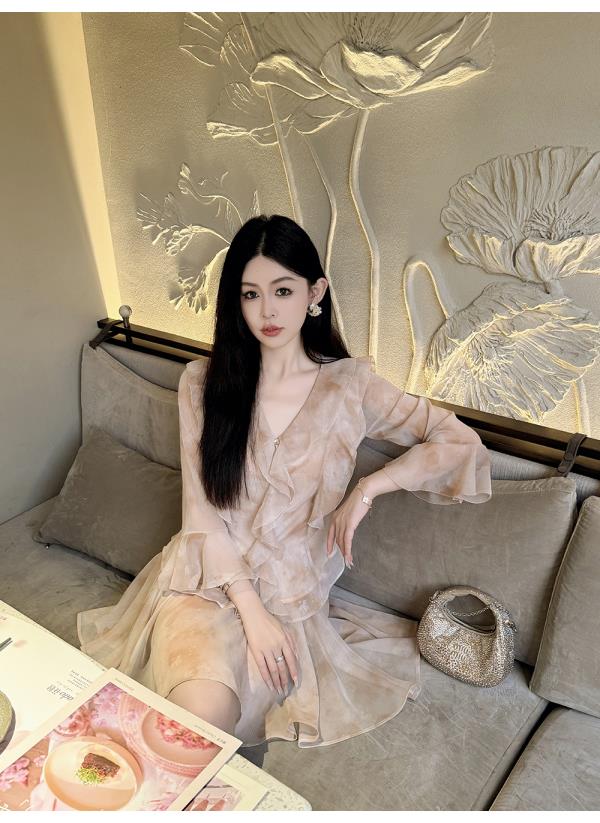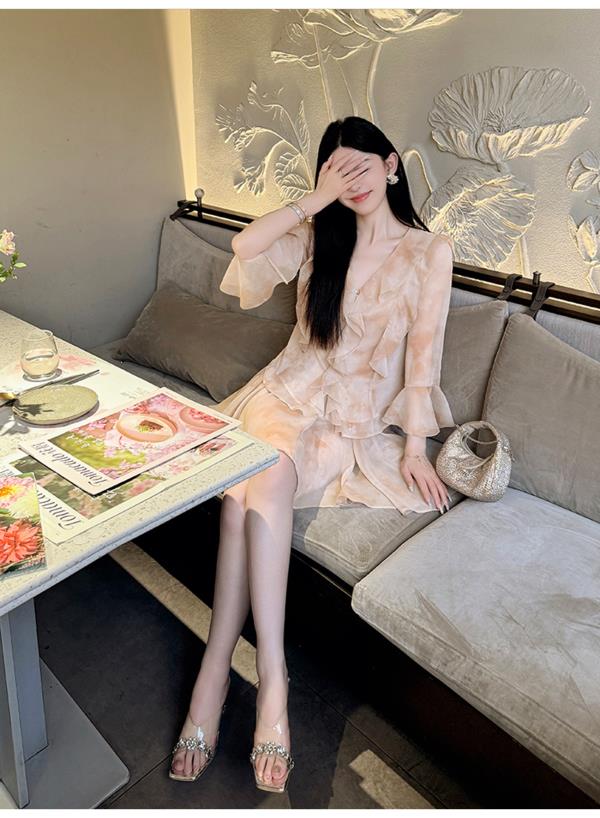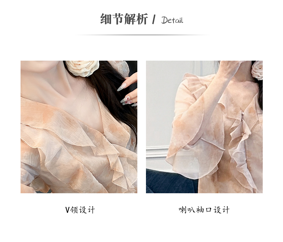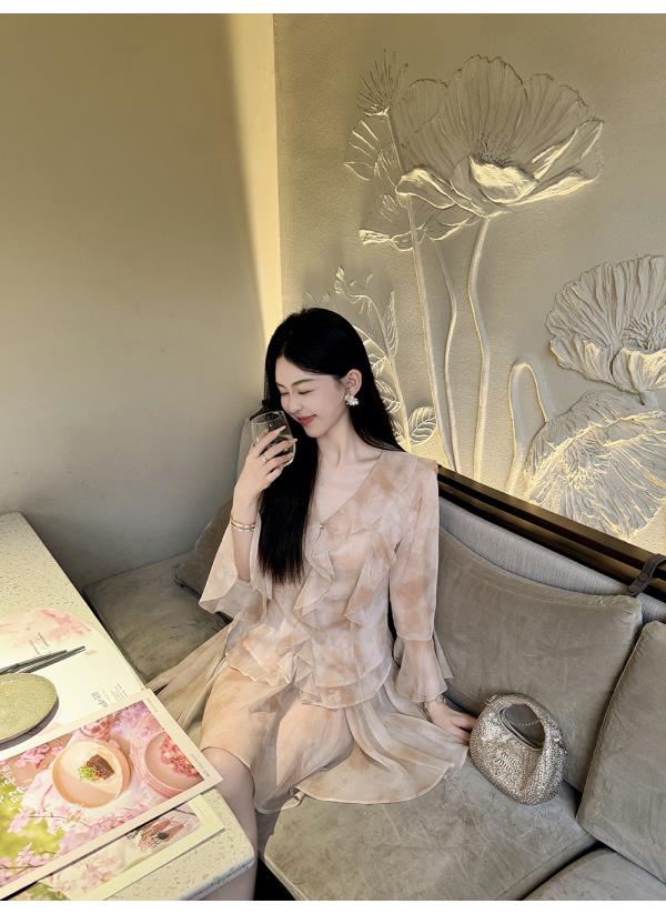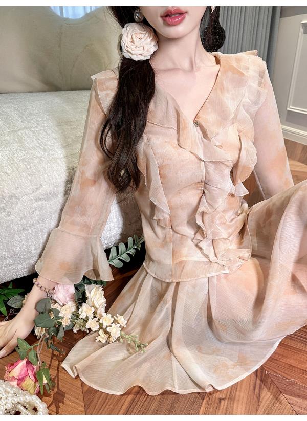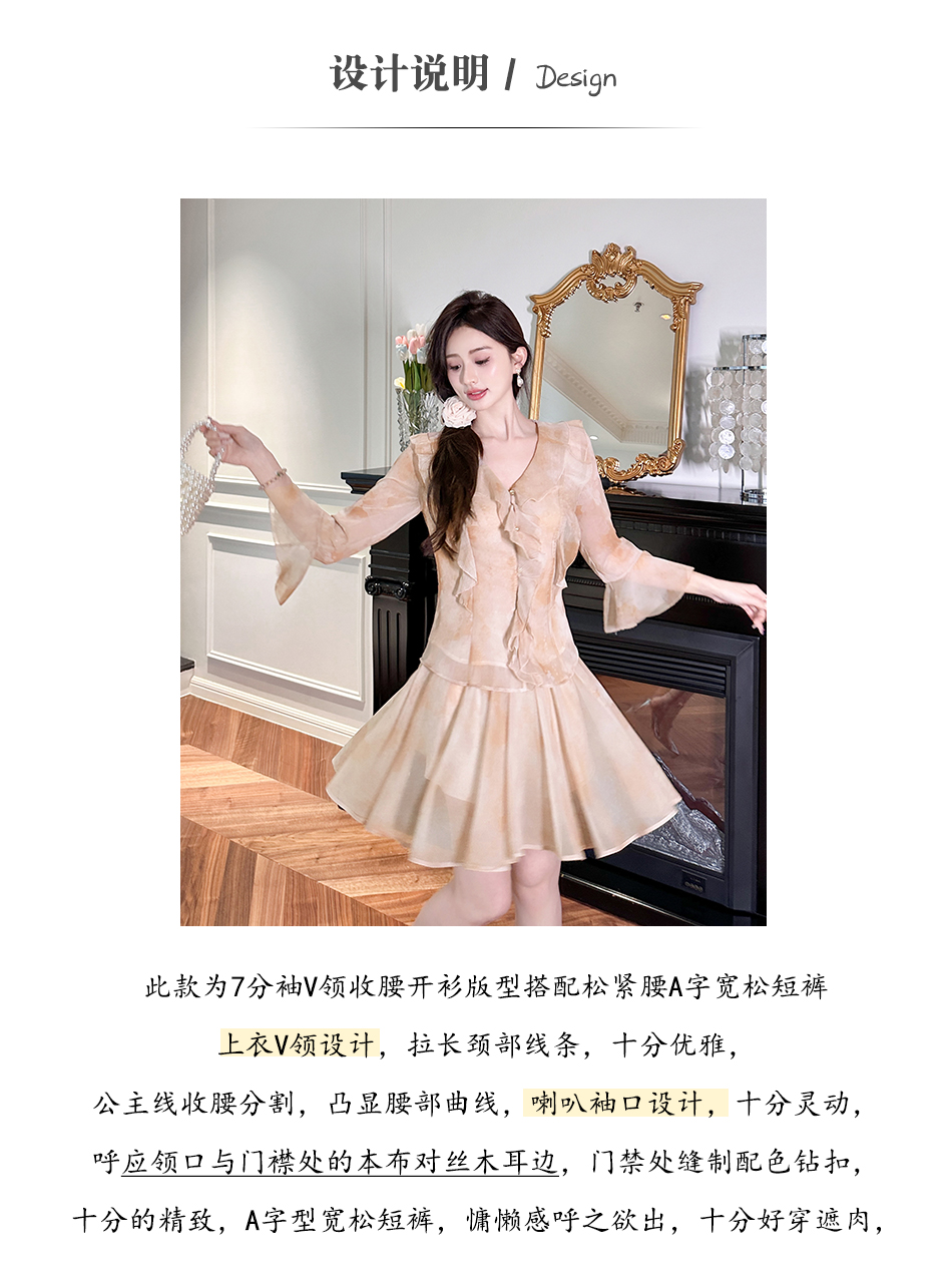 BeQueenStory【焦糖玛奇朵】荷叶边晕染雪纺V领收腰开衫&短裙裤套装
