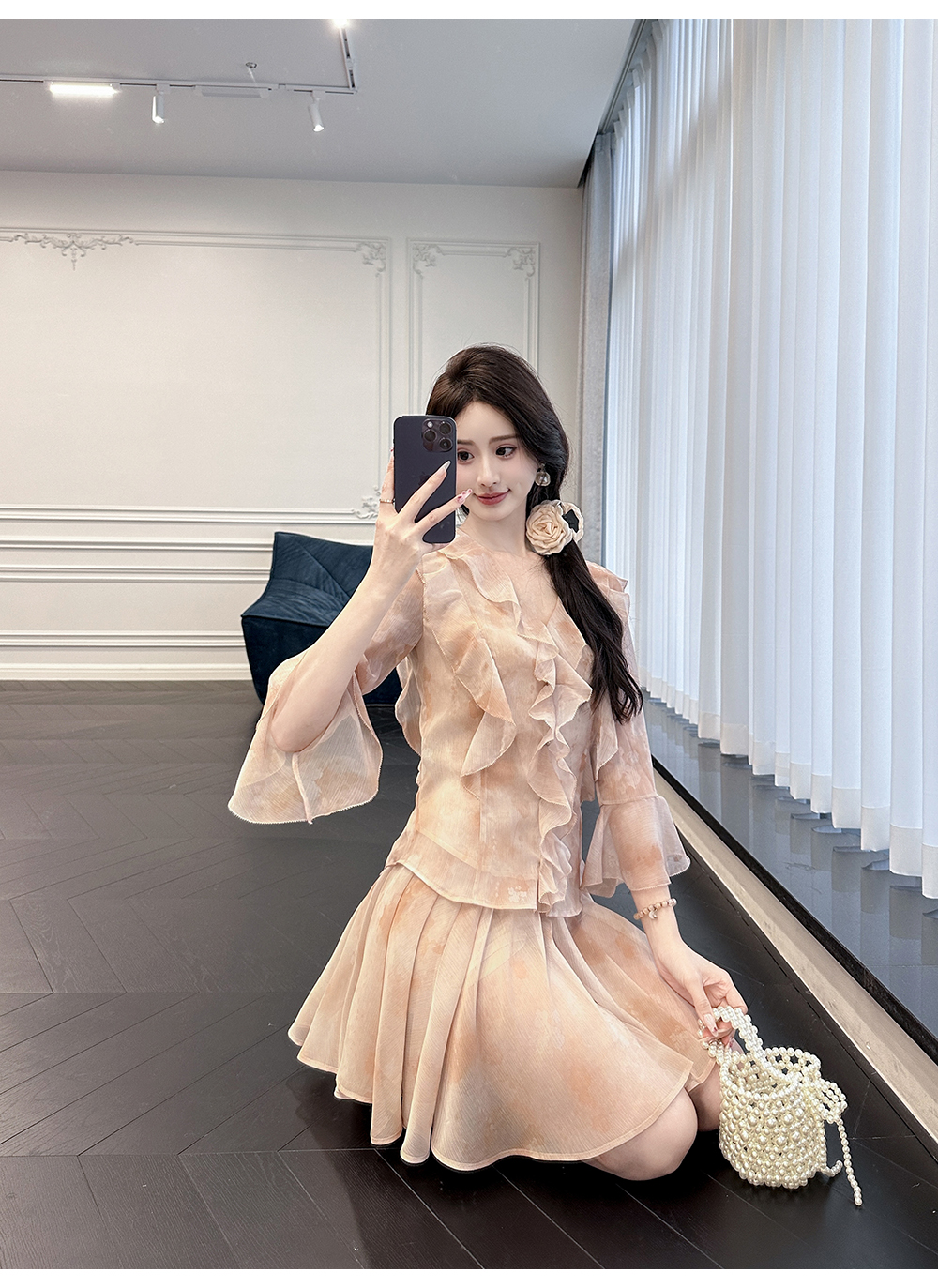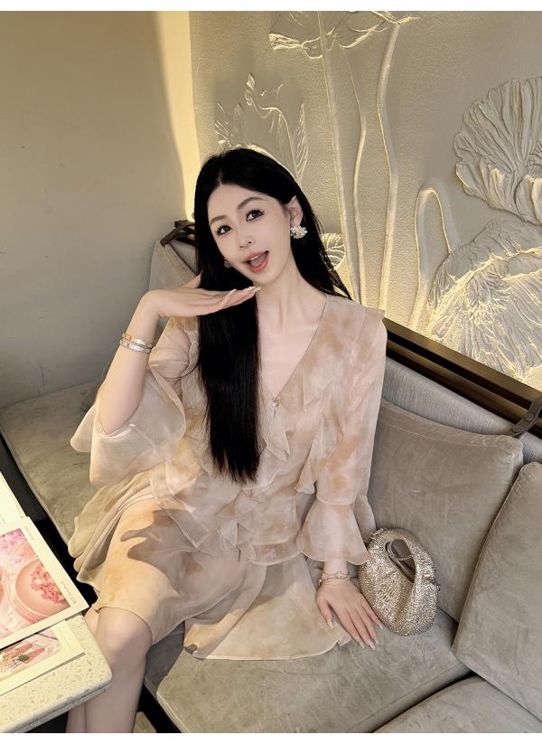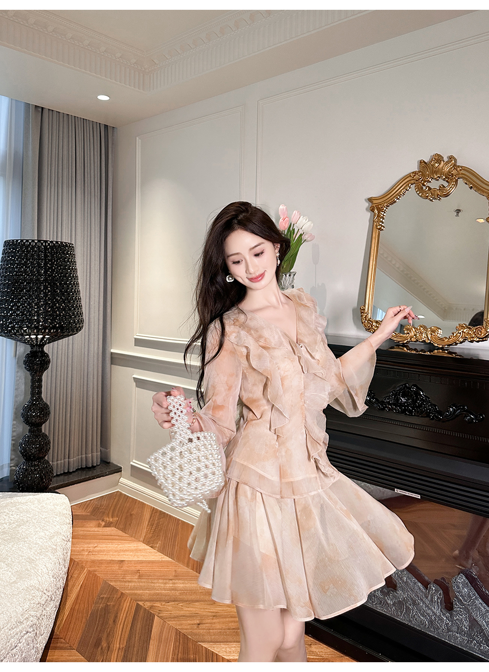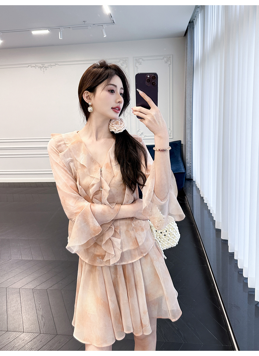 BeQueenStory【焦糖玛奇朵】荷叶边晕染雪纺V领收腰开衫&短裙裤套装