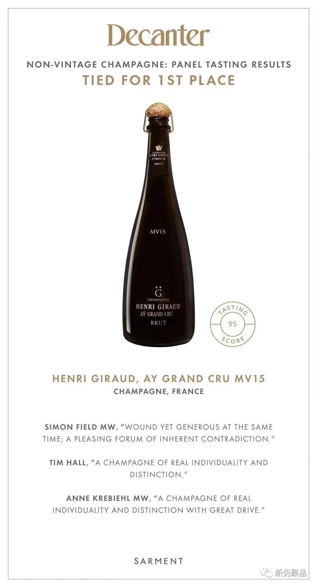 当然,不光是全球顶级餐厅必备的香槟,HG人家在香槟业内也是公认的与Krug,Salon齐名的王者香槟。知名的专业葡萄酒杂志Decanter最新一期2020年全球香槟测评中,HG的2015多年份混酿香槟得到了95分的高分,列在全球无年份香槟类目之首!