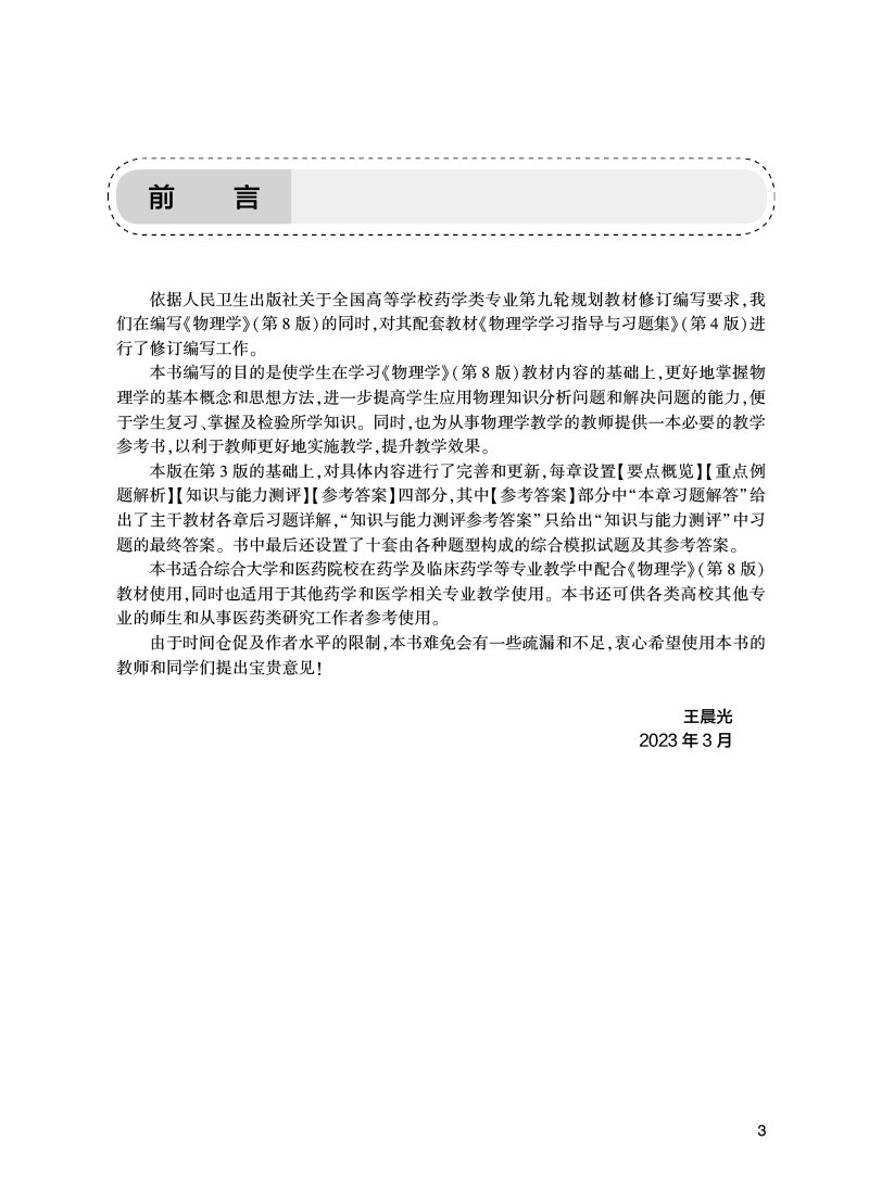 物理学学习指导与习题集 第4版 王晨光 十四五规划 全国高等学校药学类专业第九轮规划教材配套教材 人民卫生出版社9787117350242