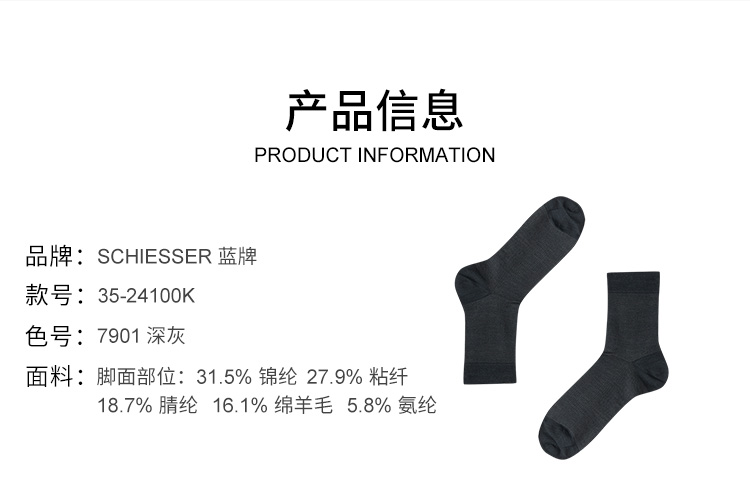 【3A抗菌防臭羊毛】SCHIESSER德国舒雅男士3A抗菌防臭 发热保暖中筒袜(腈纶33%+绵羊毛30%+锦纶32%+5%氨纶)35/24100K