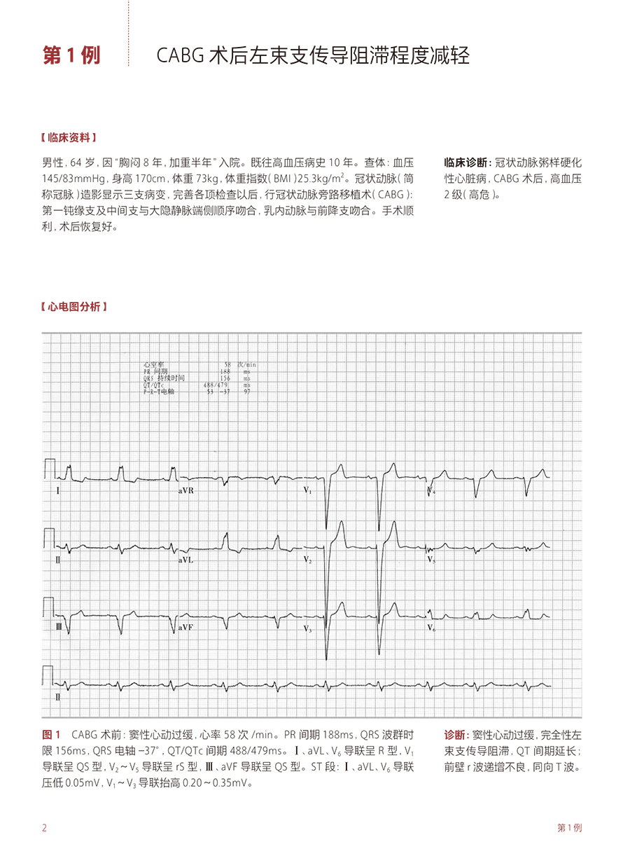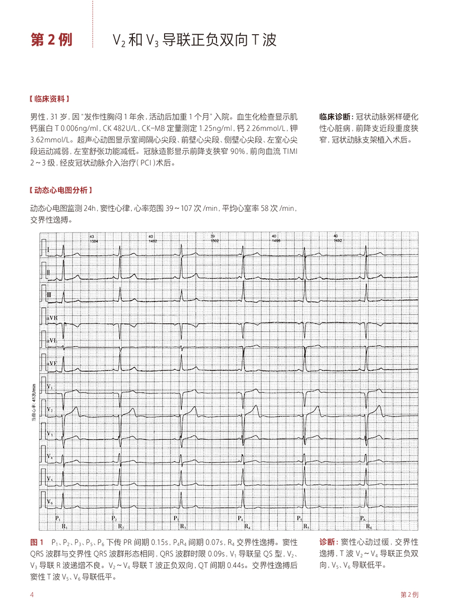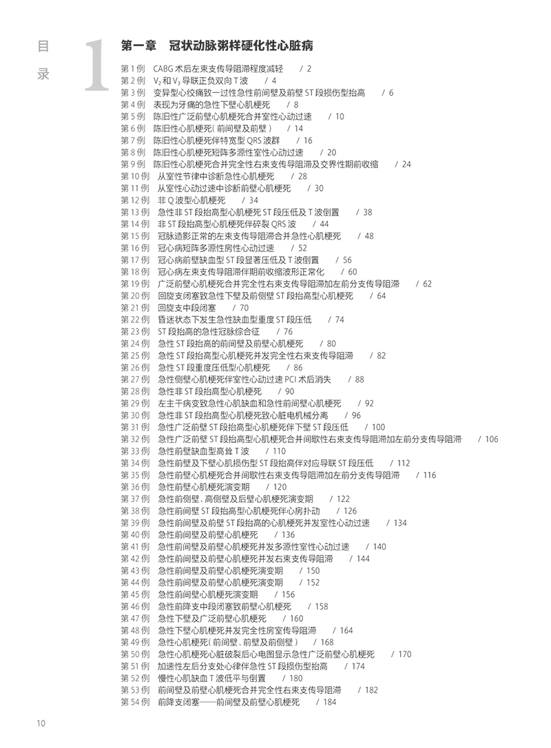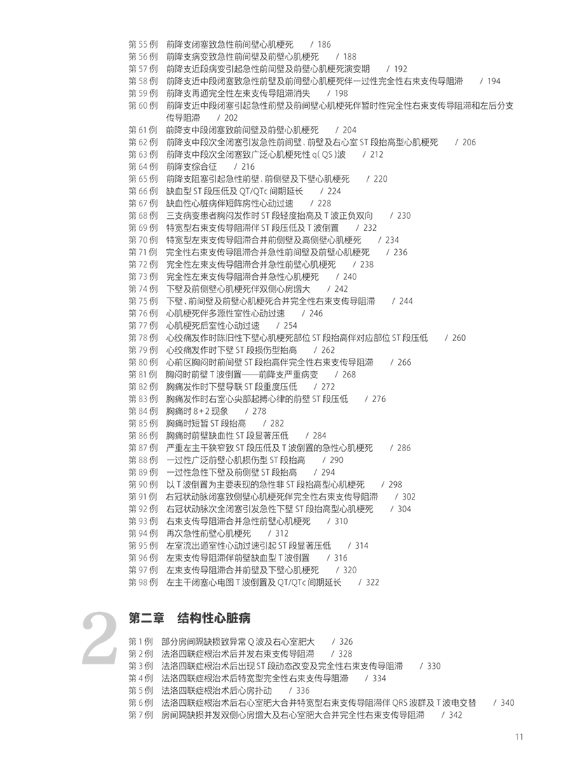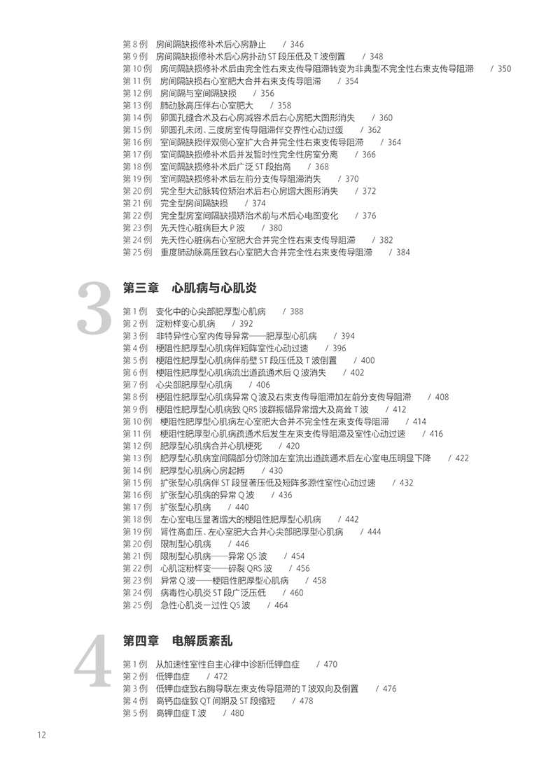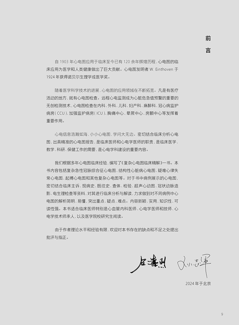 【1】以疾病为章,包括先天性心脏病、冠心病、心肌病、心律失常、起搏心电图及心血管系统疾病之外其他疾病等章;【2】复杂心电图包含图形复杂、病情复杂及病程中心电图变化与转归复杂等情况;【3】基本设计是1~2个对开页是一个案例,单页码是一组心电图,双页码是相关临床资料,及对诊断有关键作用的心电图表现分析,针对文字在心电图上加以细致标注;【4】为控制篇幅,同时又要展示给读者疾病转归与心电图变化的关系,将一部分病程中的心电图及关联紧密的临床资料以二维码的形式加以链接;【5】文字部分体现“临床精研”的深度和广度。
