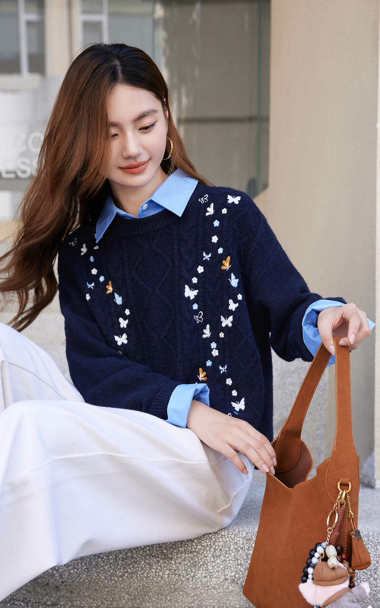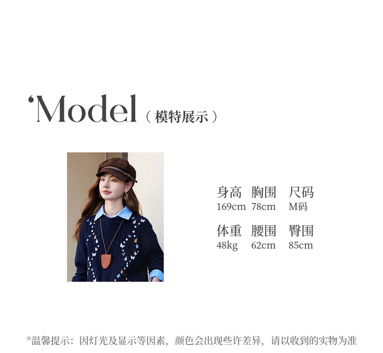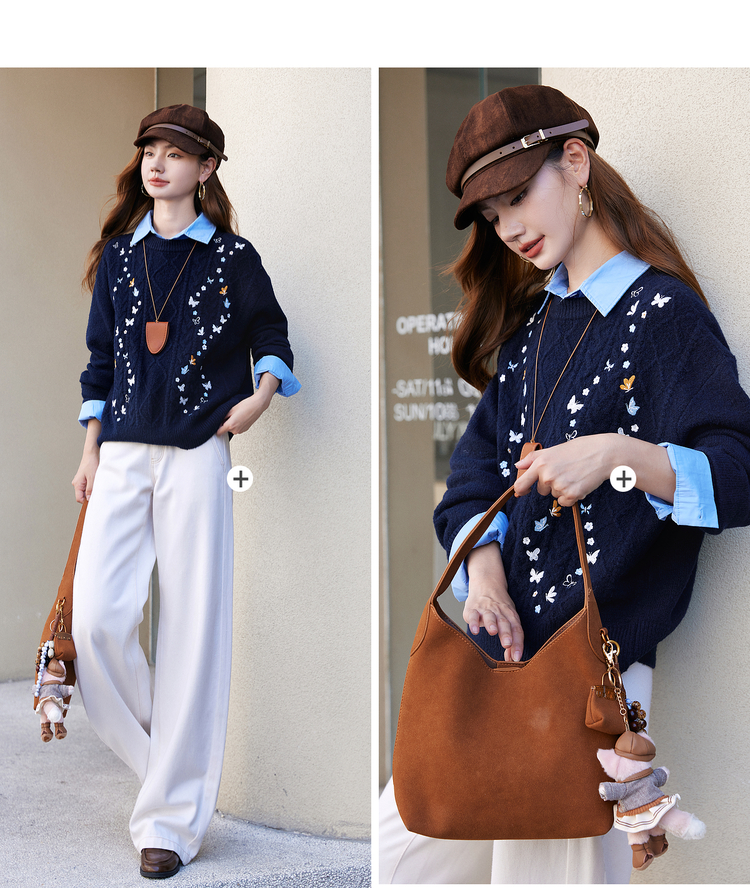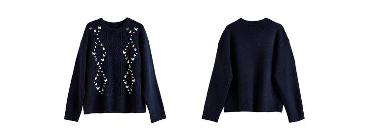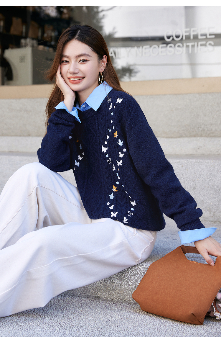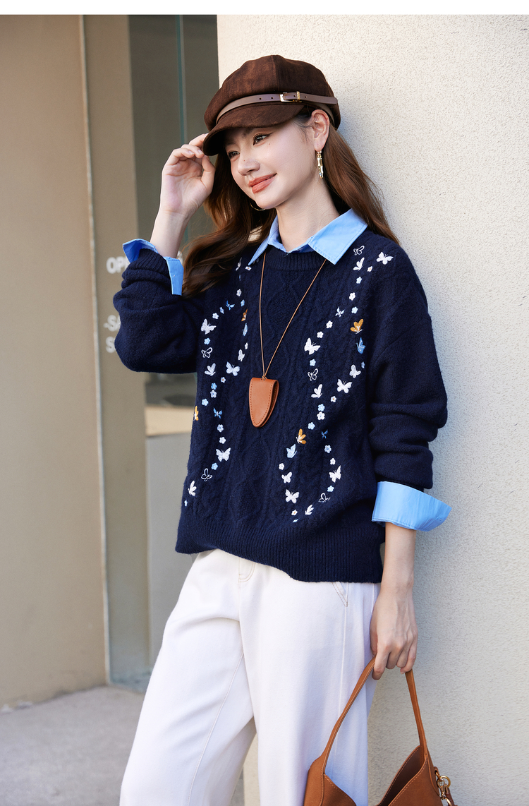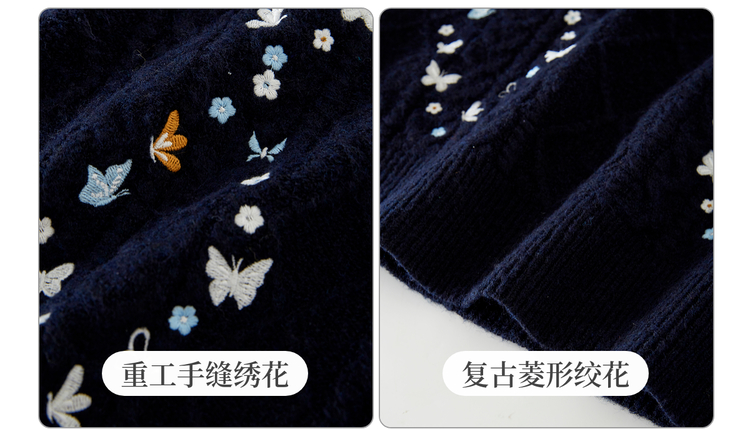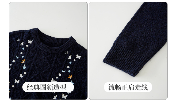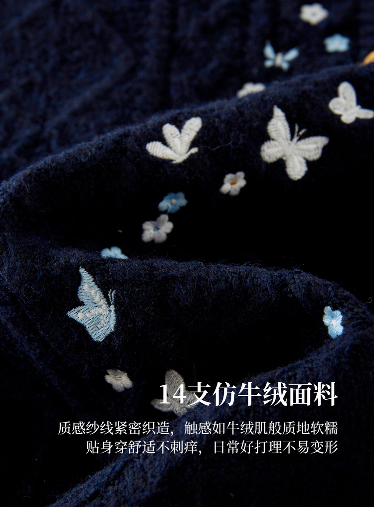 【11/14新品】熙世界仿牛绒蝴蝶刺绣针织衫女2025秋冬新款圆领宽松复古绞花毛衣