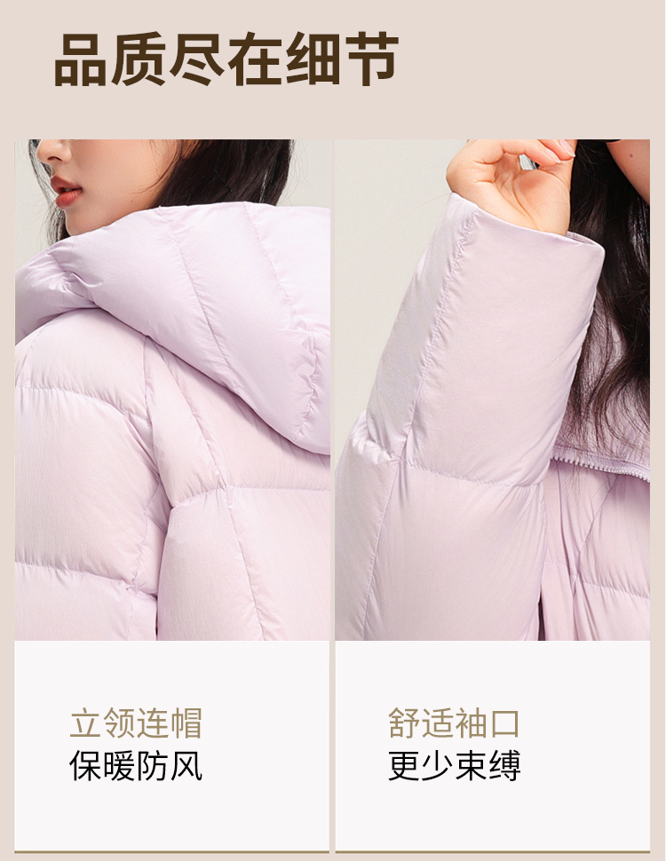 ✅ 20D 锦纶高密防风面料,防寒风抗小雨,哑光显高级,触感柔软亲肤透气,告别普通亮面羽绒服的闷热感