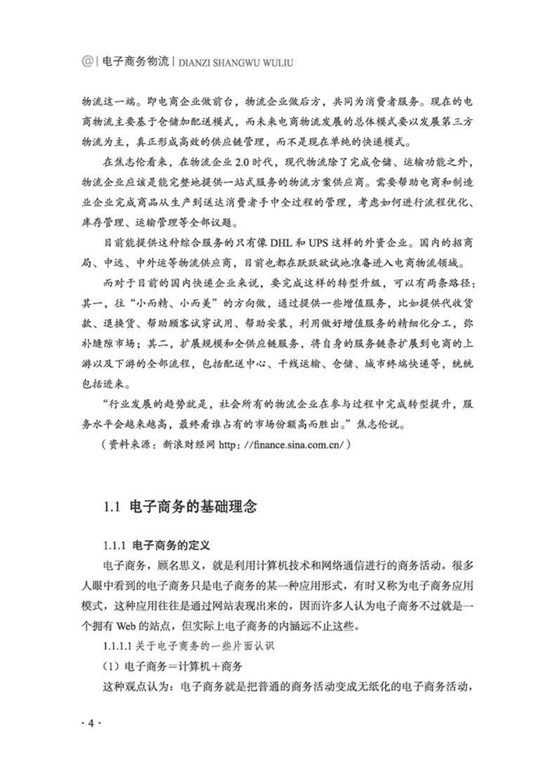 《电子商务物流》一书广泛参考了国内外相关电子商务物流管理著作和论文,在吸收它们的理论、思路、方法与实践经验的基础上,围绕电子商务物流管理理论与实践的主线,重点介绍了电子商务物流模式、电子商务物流技术、电子商务物流订单、电子商务物流仓储、电子商务物流配送、电子商务物流供应链、电子商务物流安全等几个方面的内容,并选择具有代表性的标杆案例供读者借鉴。