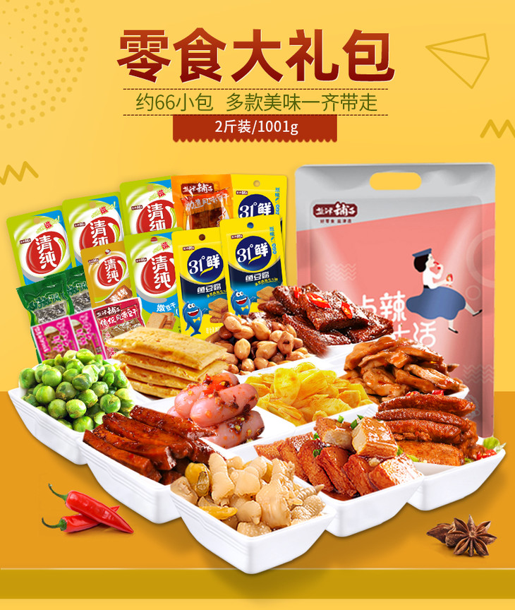 盐津铺子零食大礼包休闲食品小吃辣条豆干辣味鱼豆腐整箱