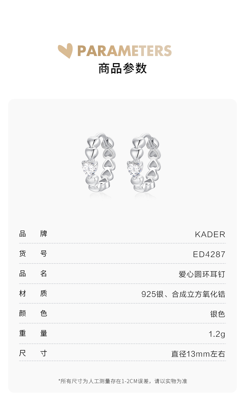 卡蒂罗/KADER 爱心圆环耳环 925银经典几何爱心造型优雅复古设计耳饰 精致立体优雅百搭通勤配饰闪光少女 女生女友