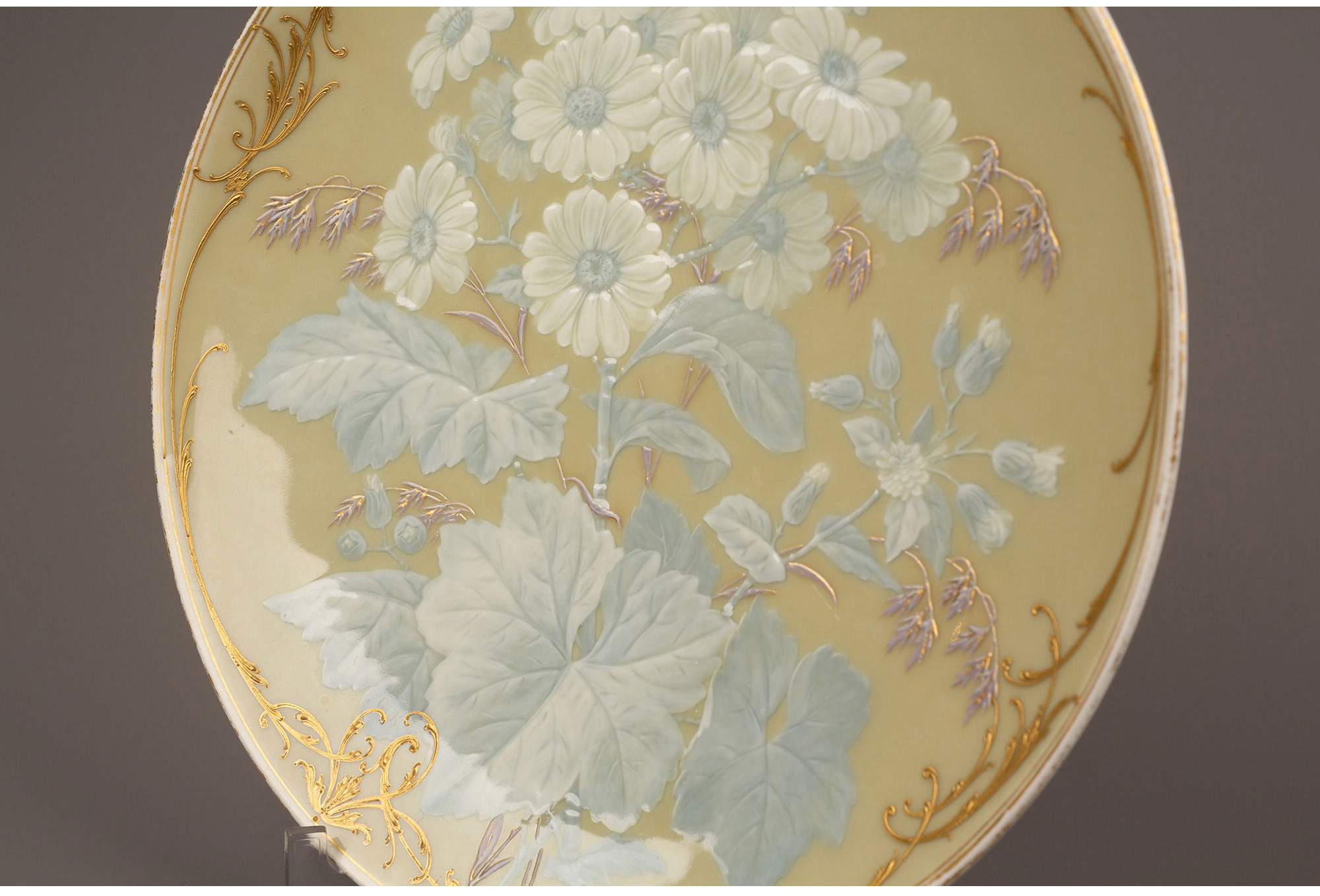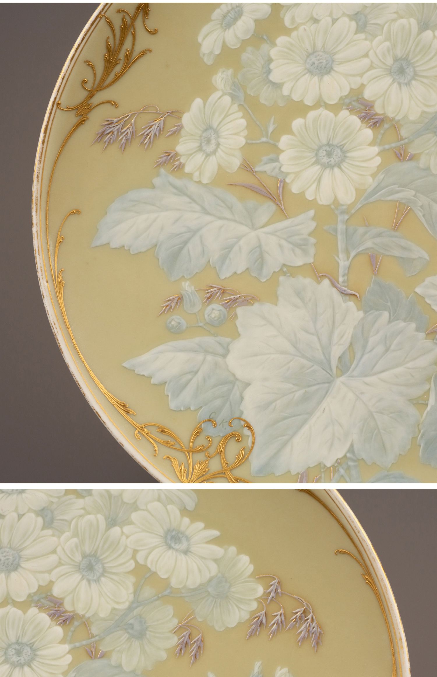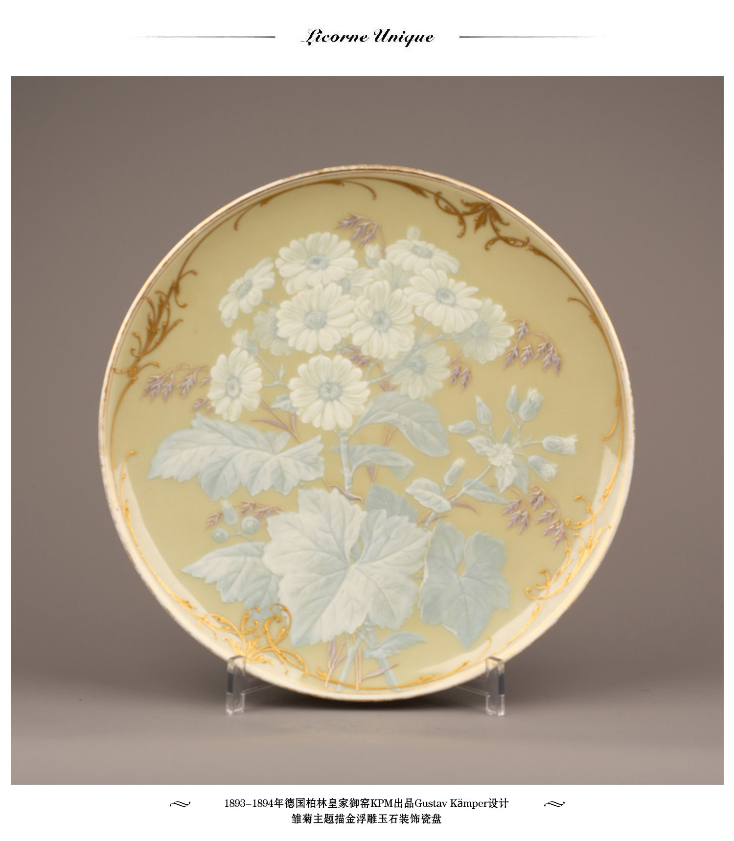 独角鹿西洋古董瓷器德国KPM Gustav Kämper雏菊描金浮雕玉石瓷盘