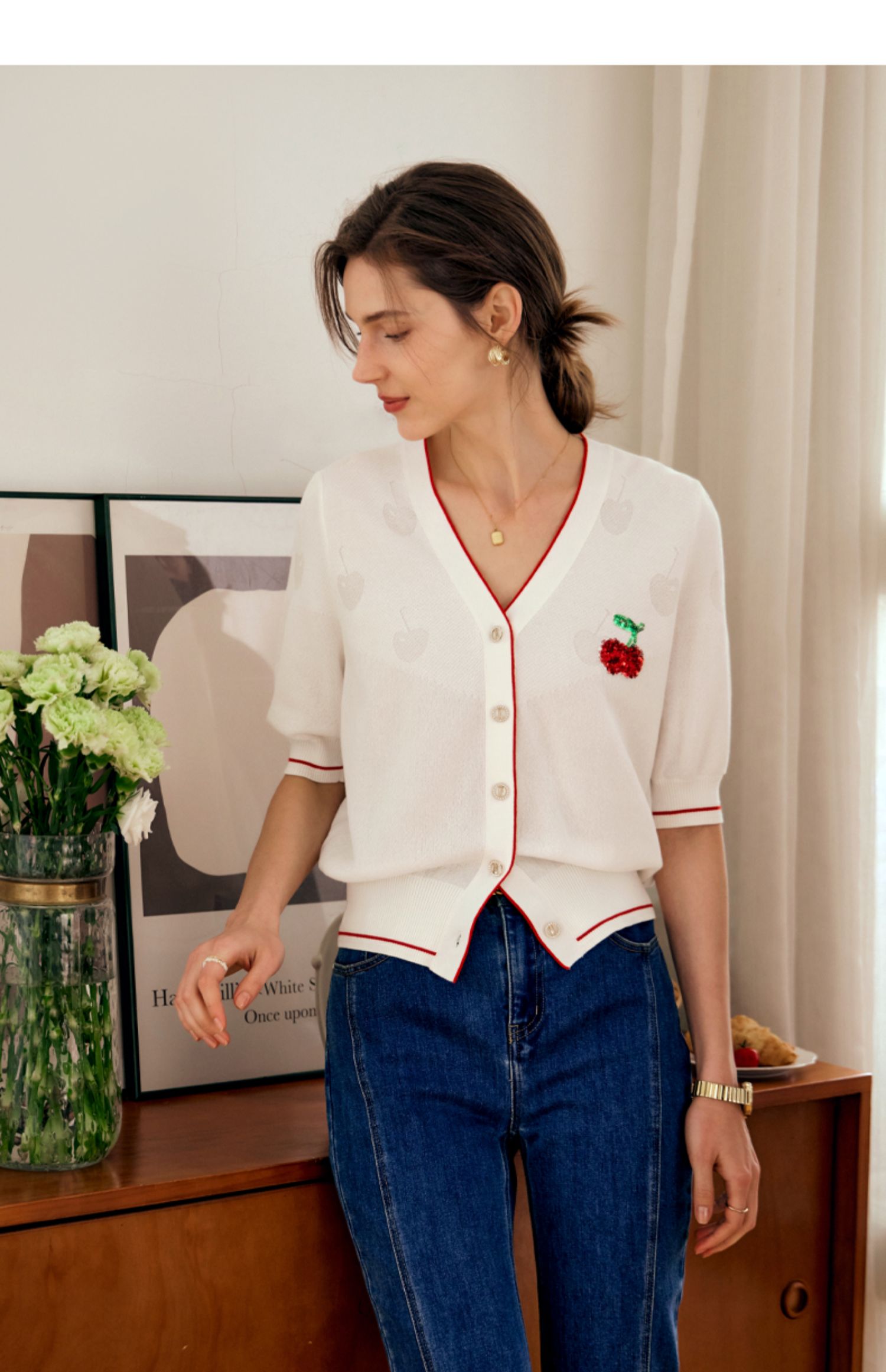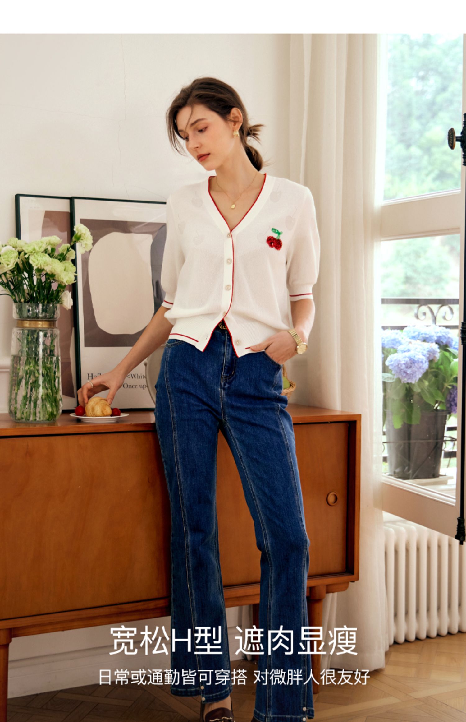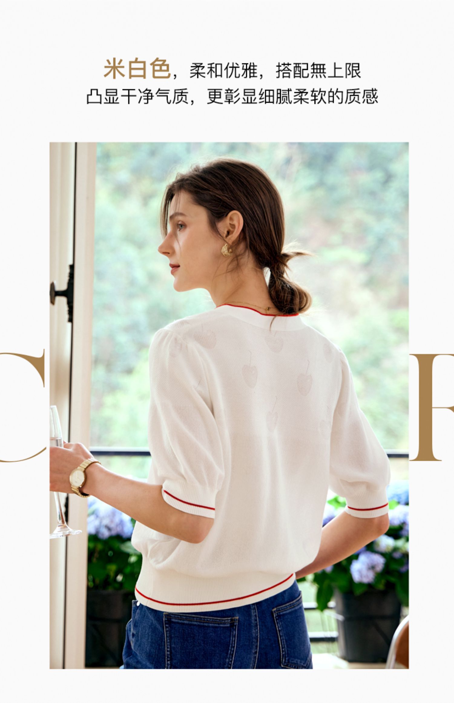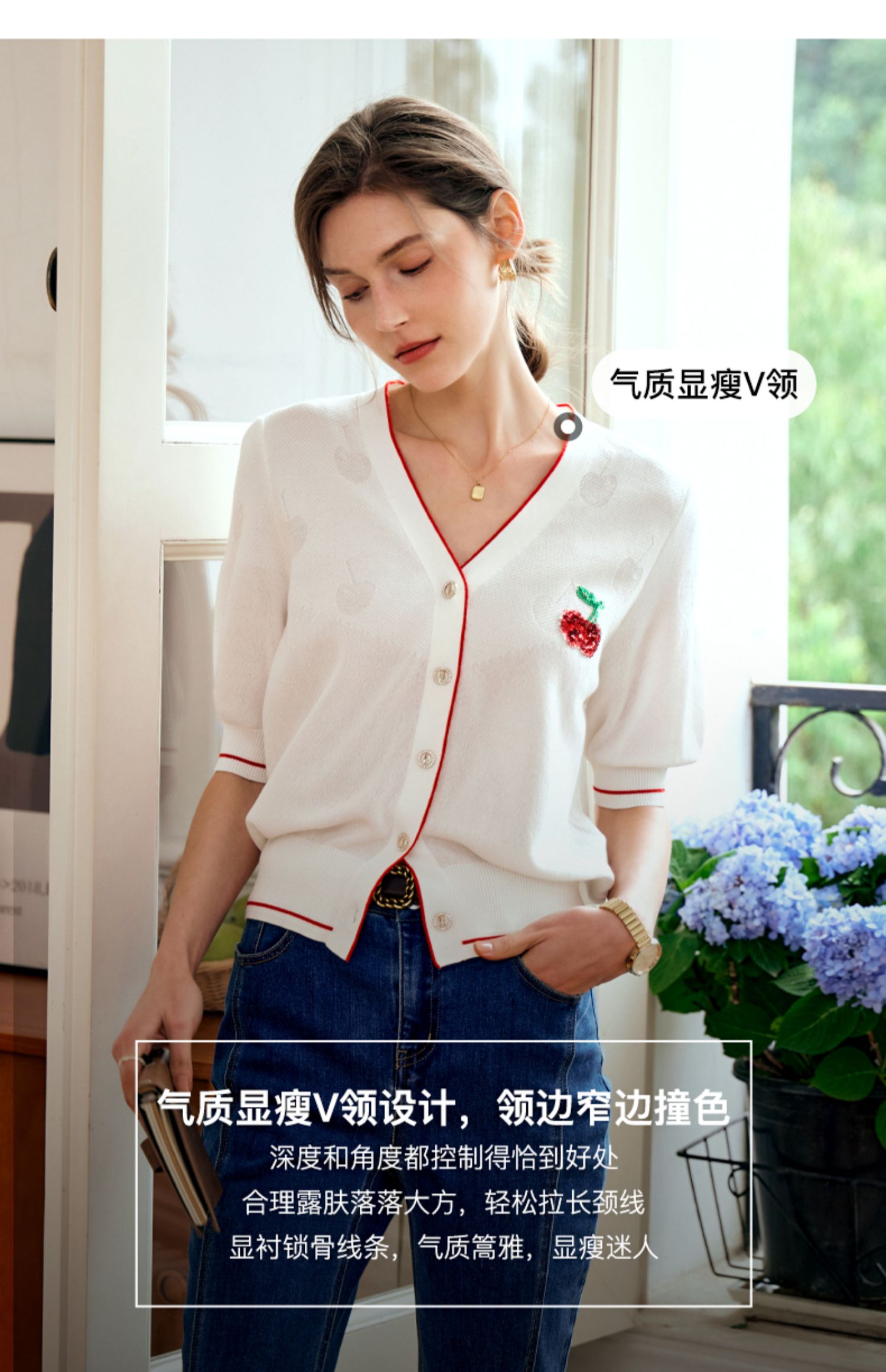 OLrain欧芮儿米白色V领针织衫女早春2024年新款宽松暗纹提花开衫