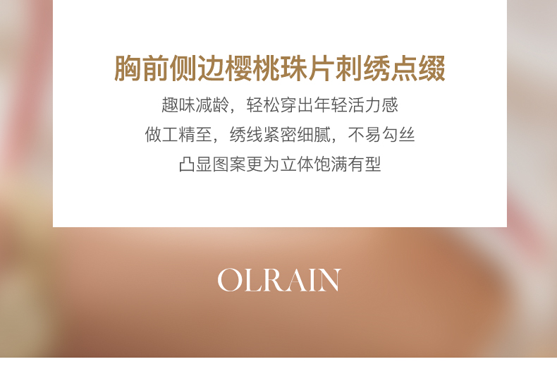 - “精致”是欧芮儿olrain品牌文化的核心,欧芮儿认为,精致的女人,不但要外在动人,更要内在迷人,内外兼修,有魅力、有气质、有内涵,自信而不自傲,优雅而不矫揉,自有万种风情而不轻浮,更不故作矜持。