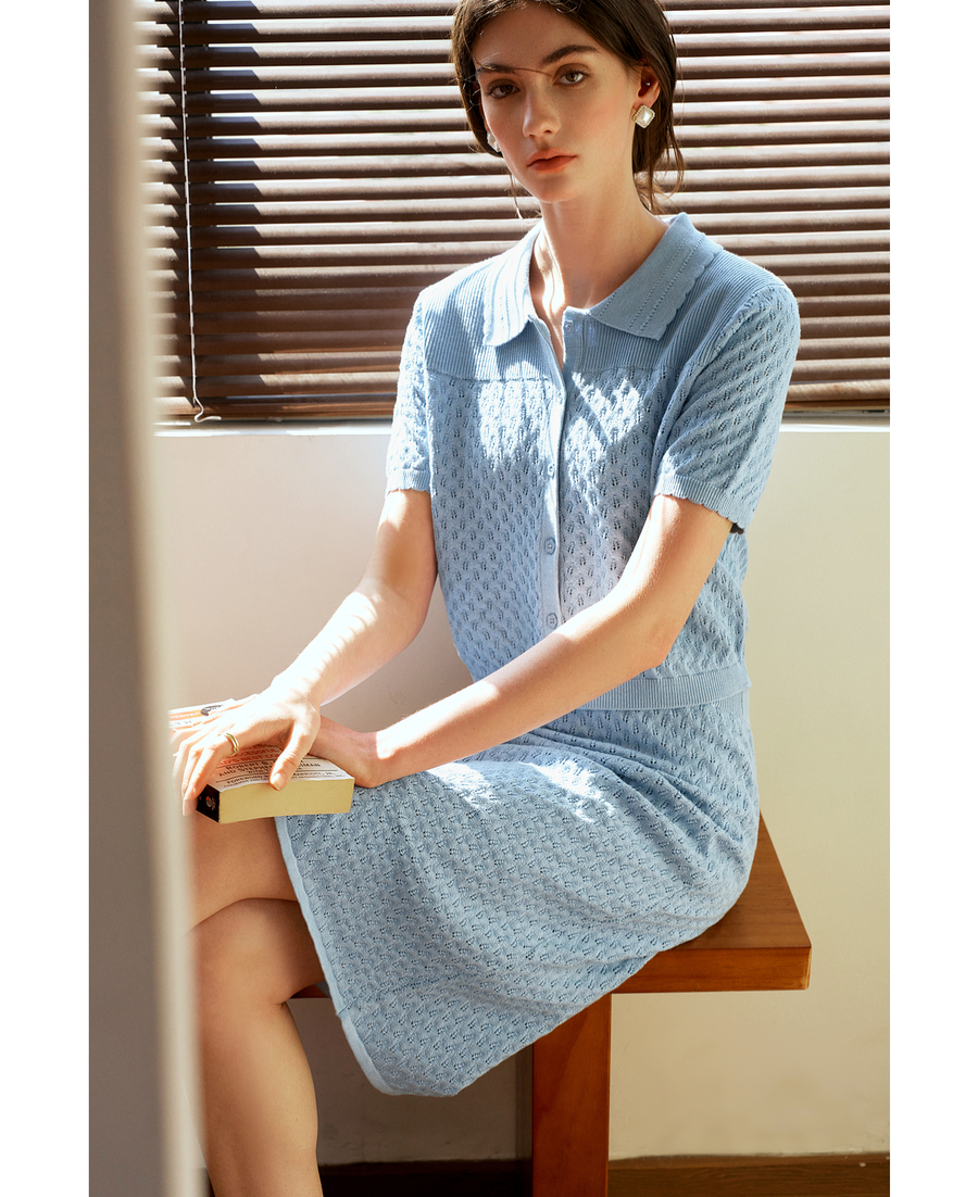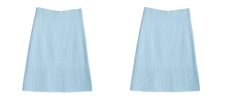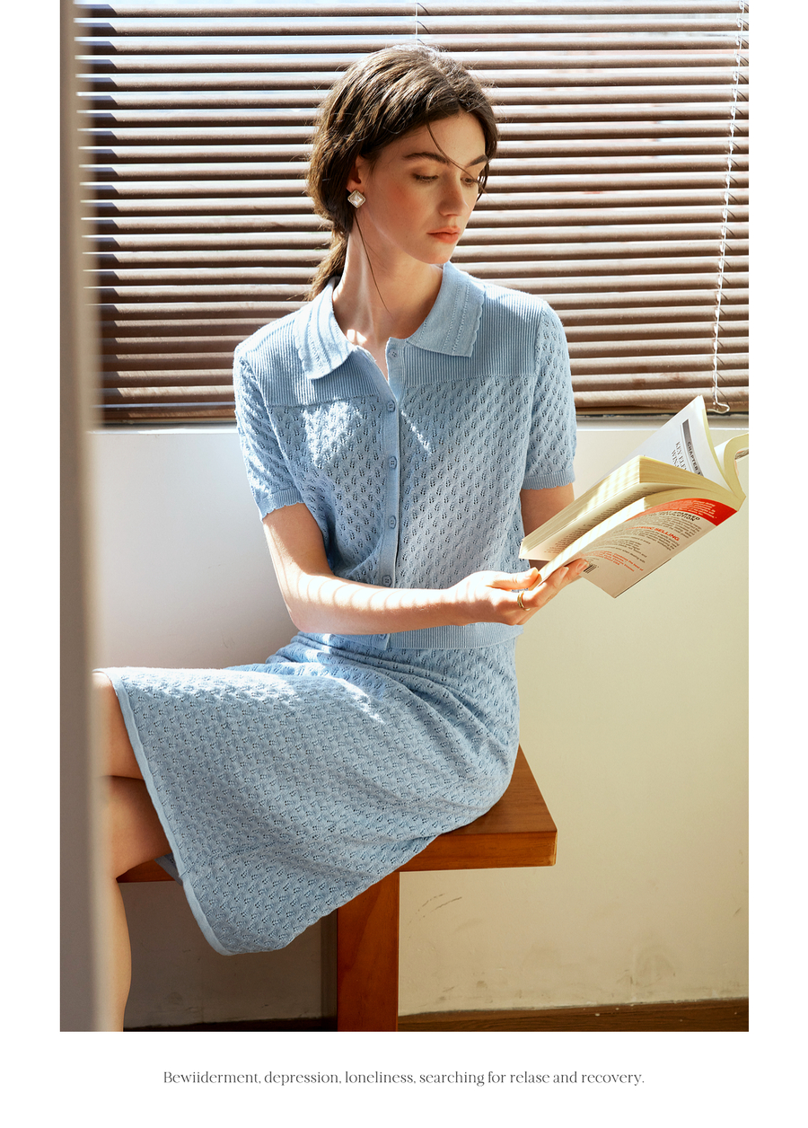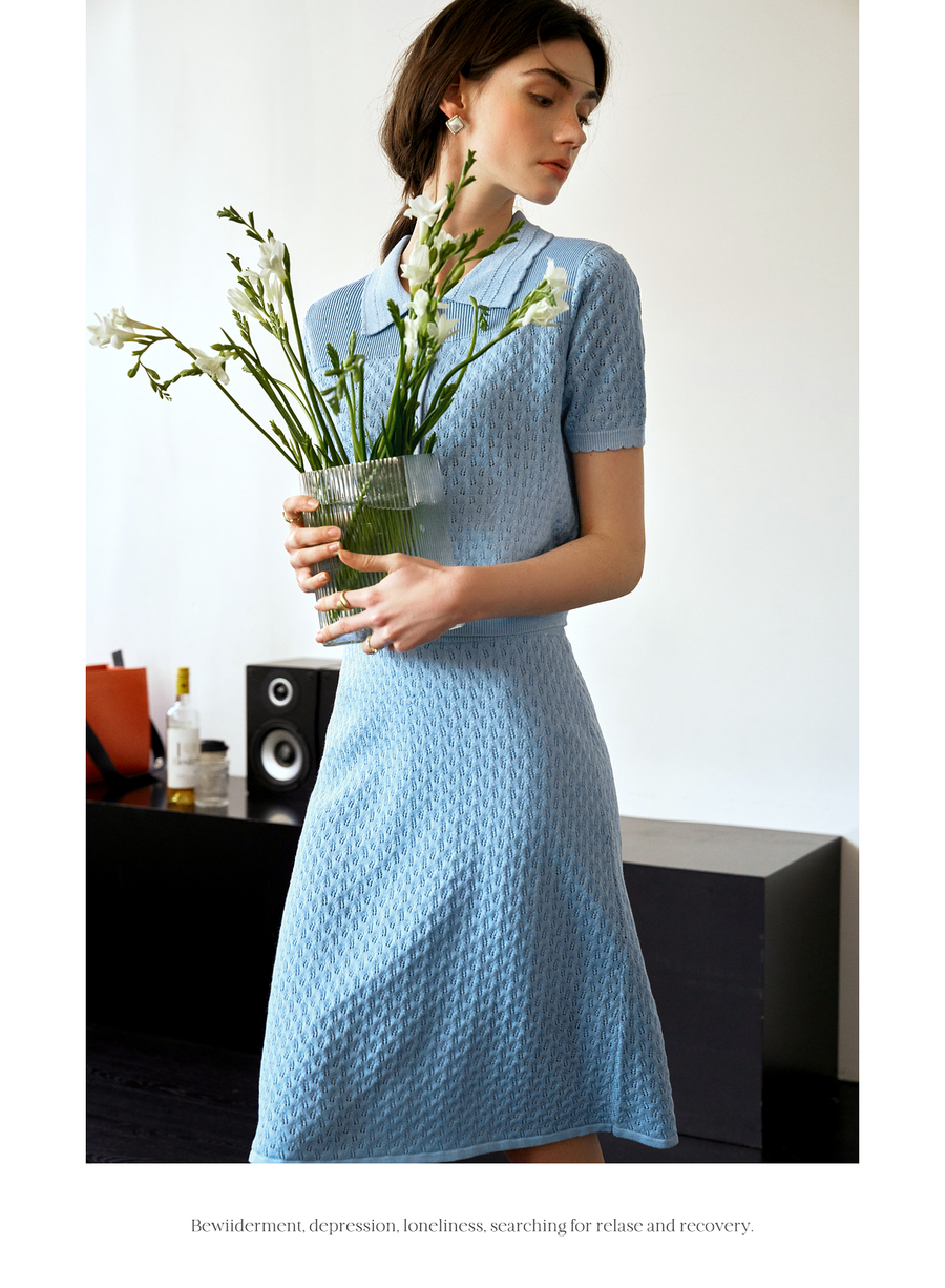 OLrain欧芮儿2025春季蓝色法式通勤镂空毛针织裙气质两件套装裙
