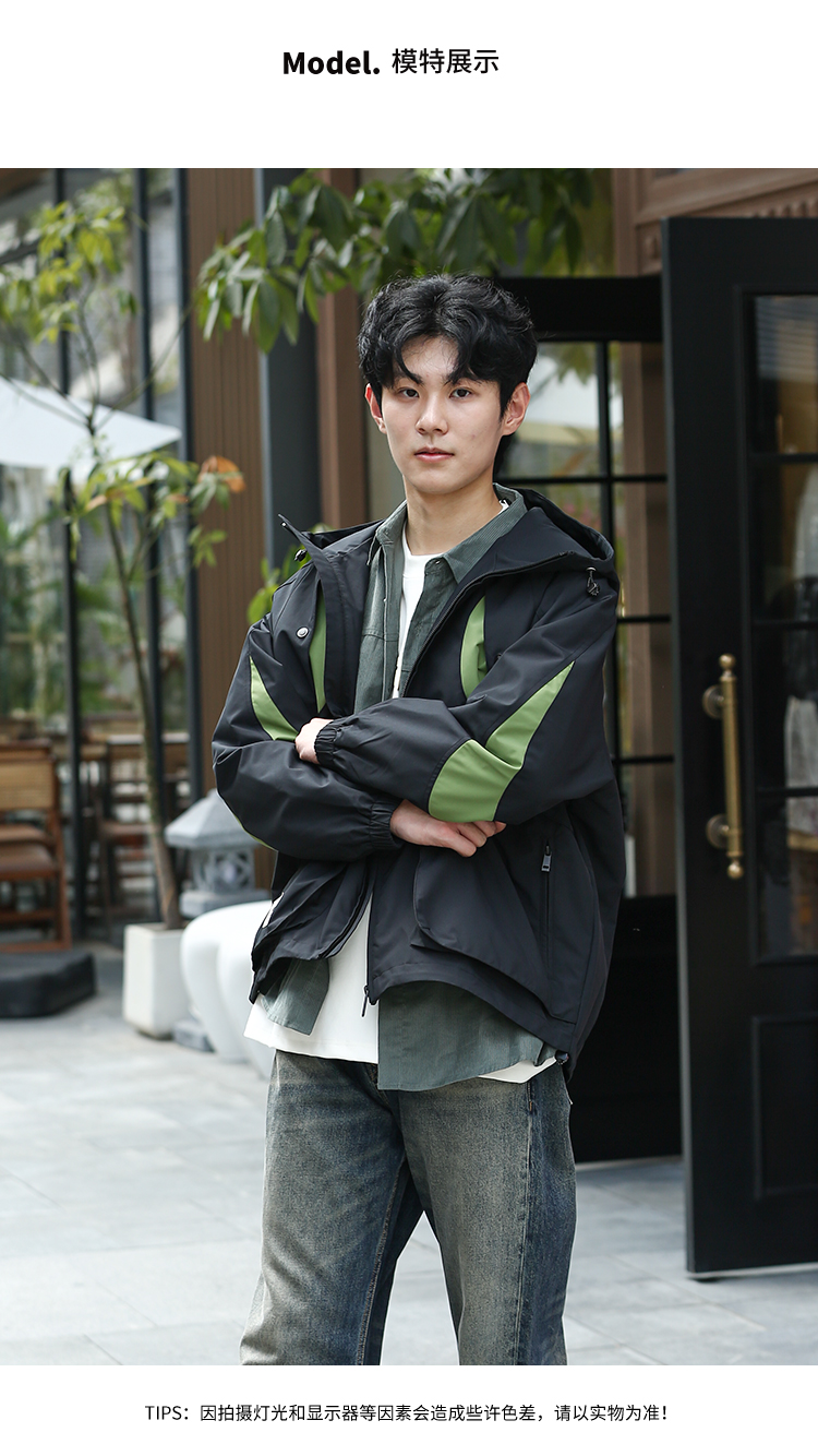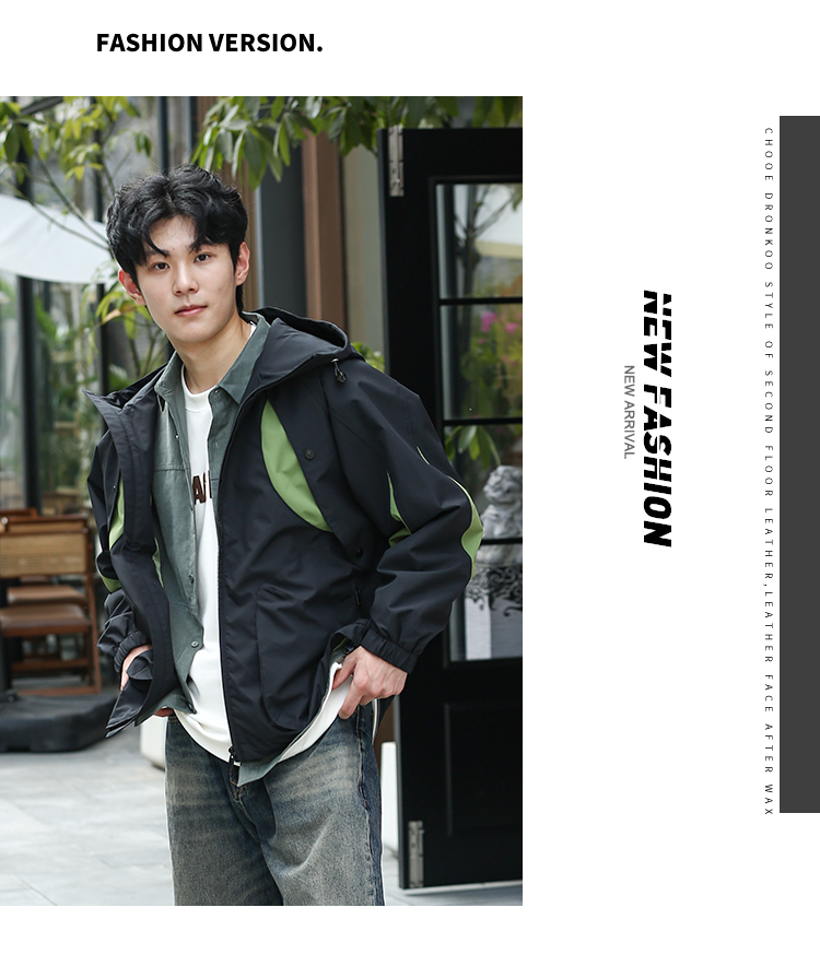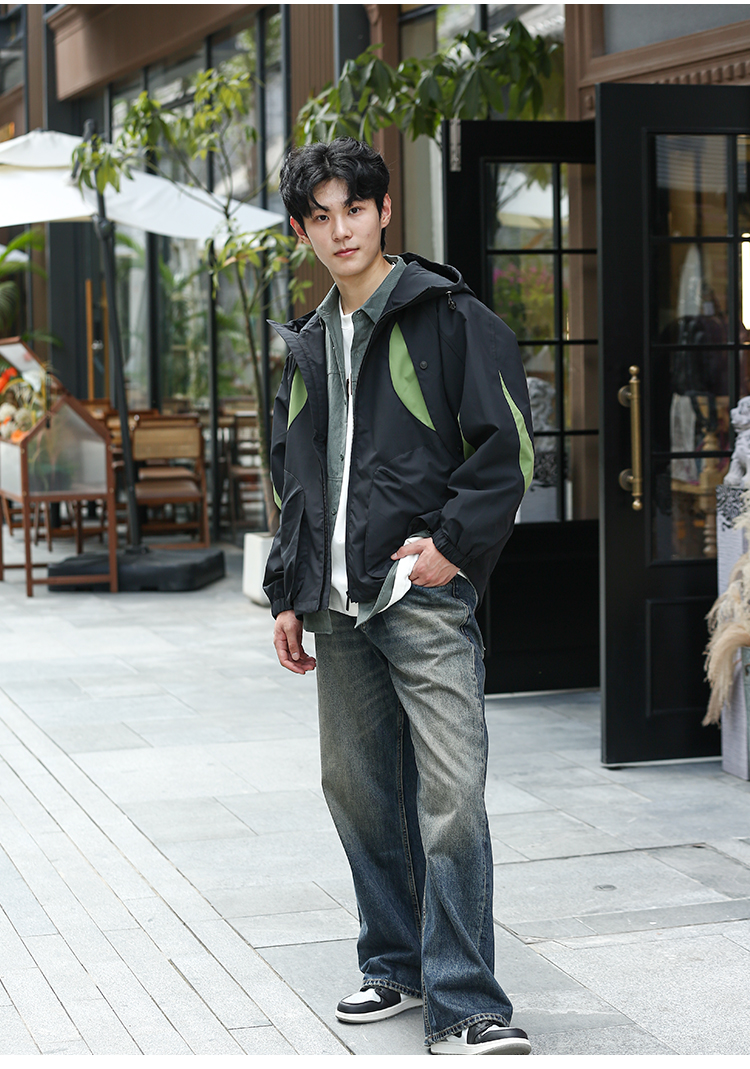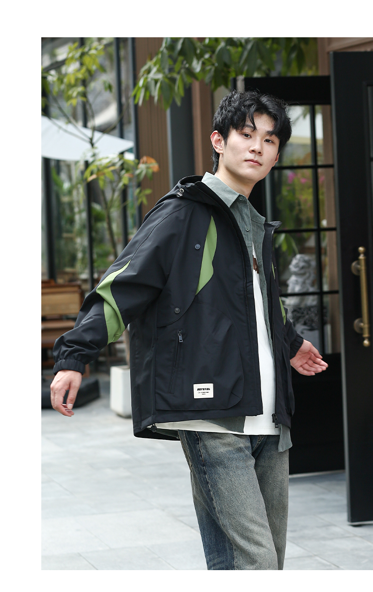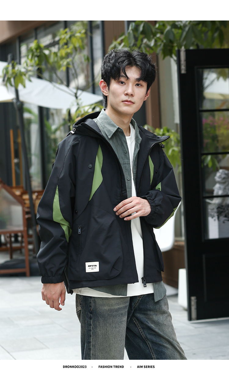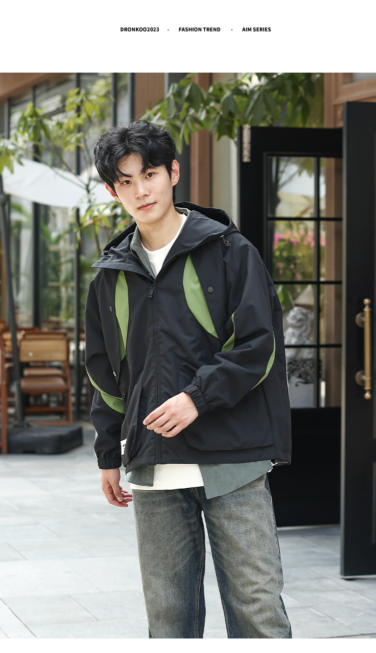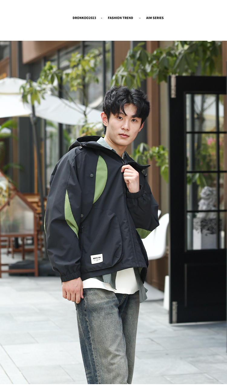 DRONKOO 2024 连帽前胸袖子撞色拼接口袋拉链微阔中厚夹克