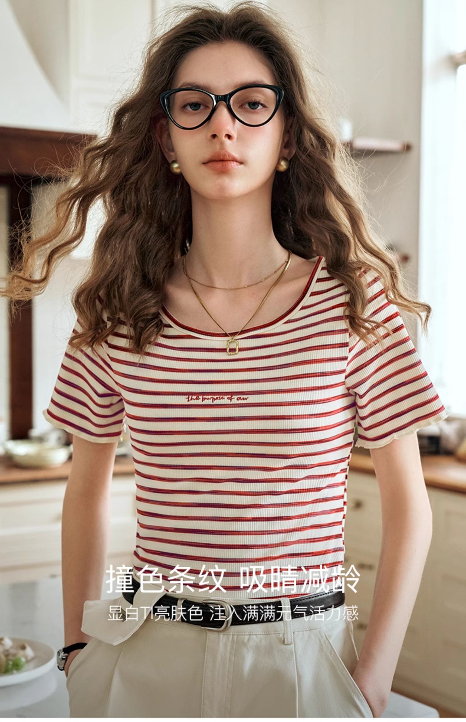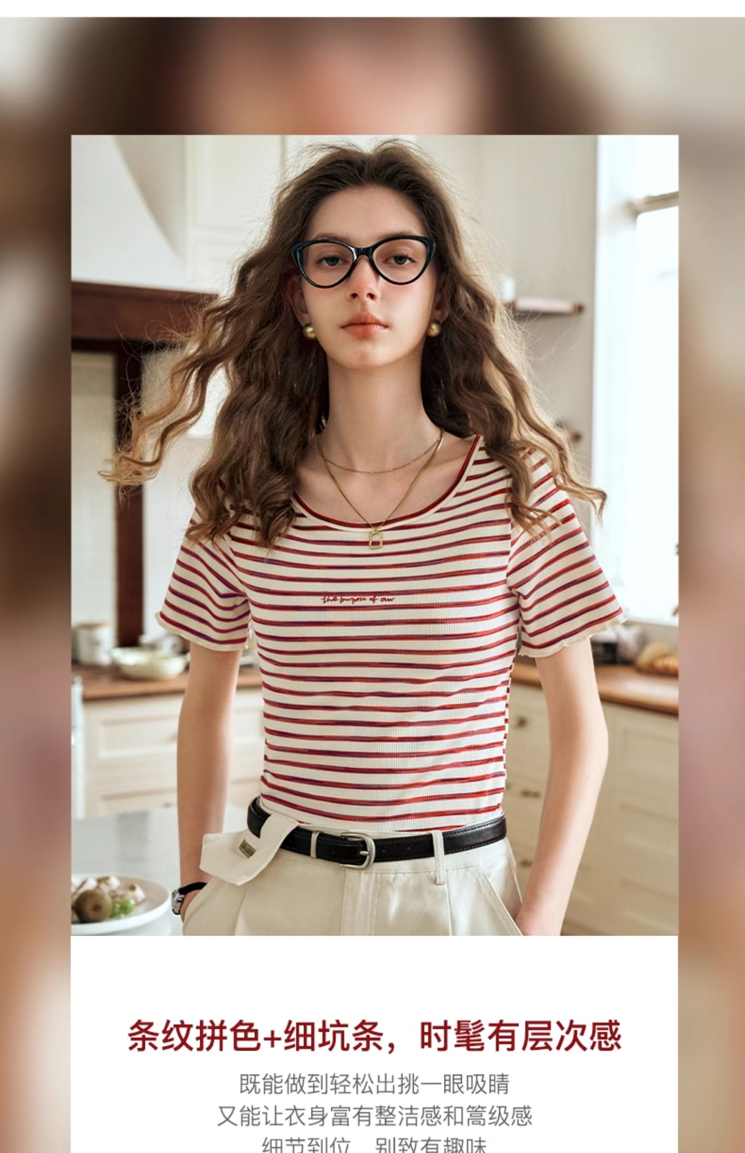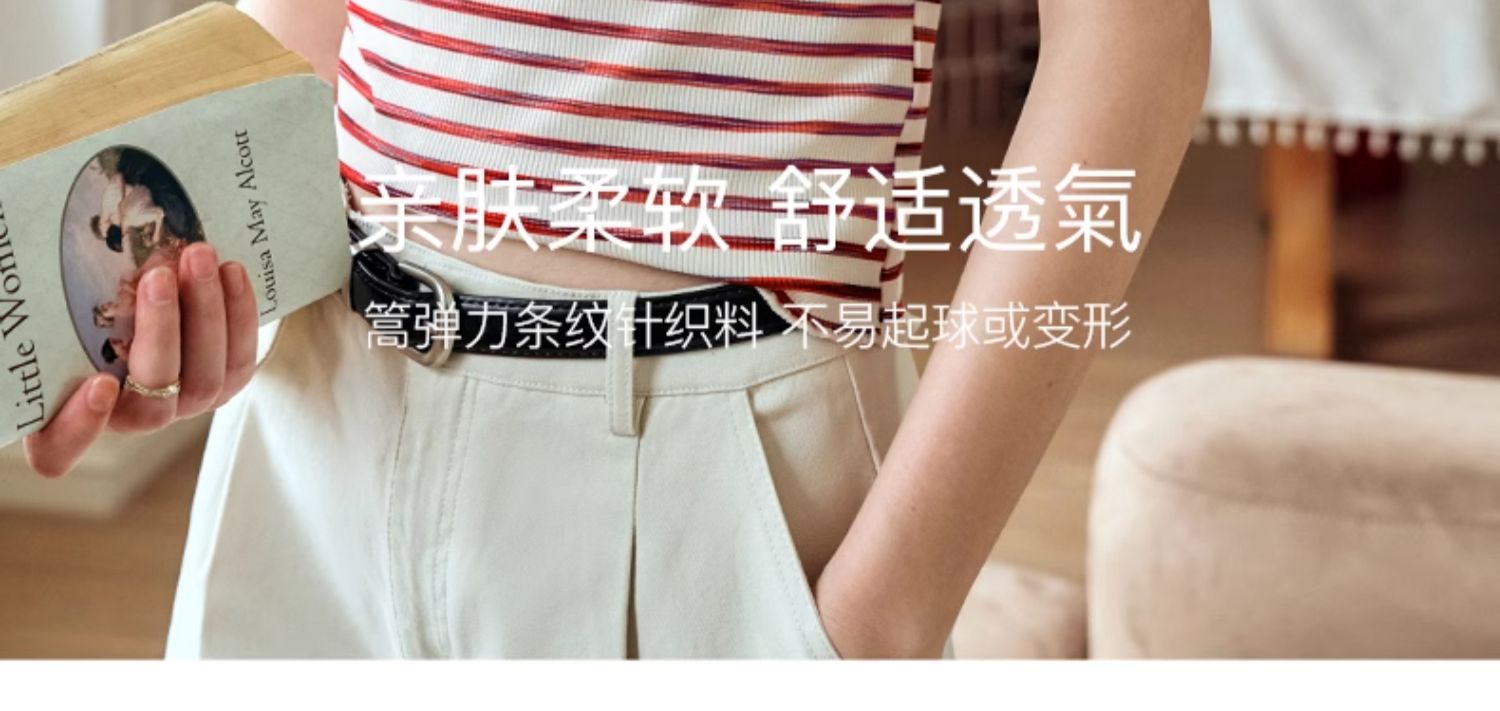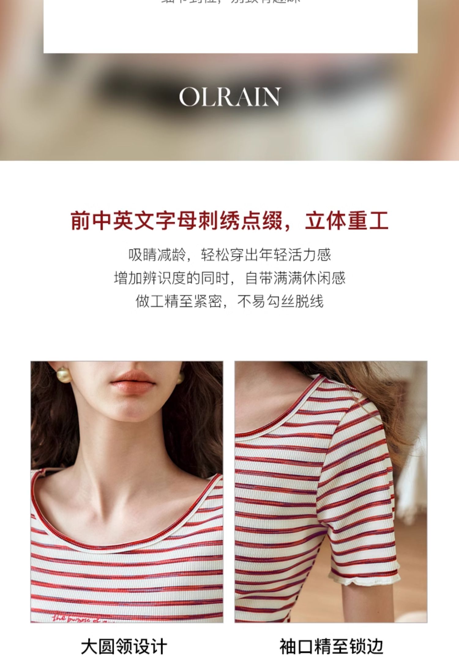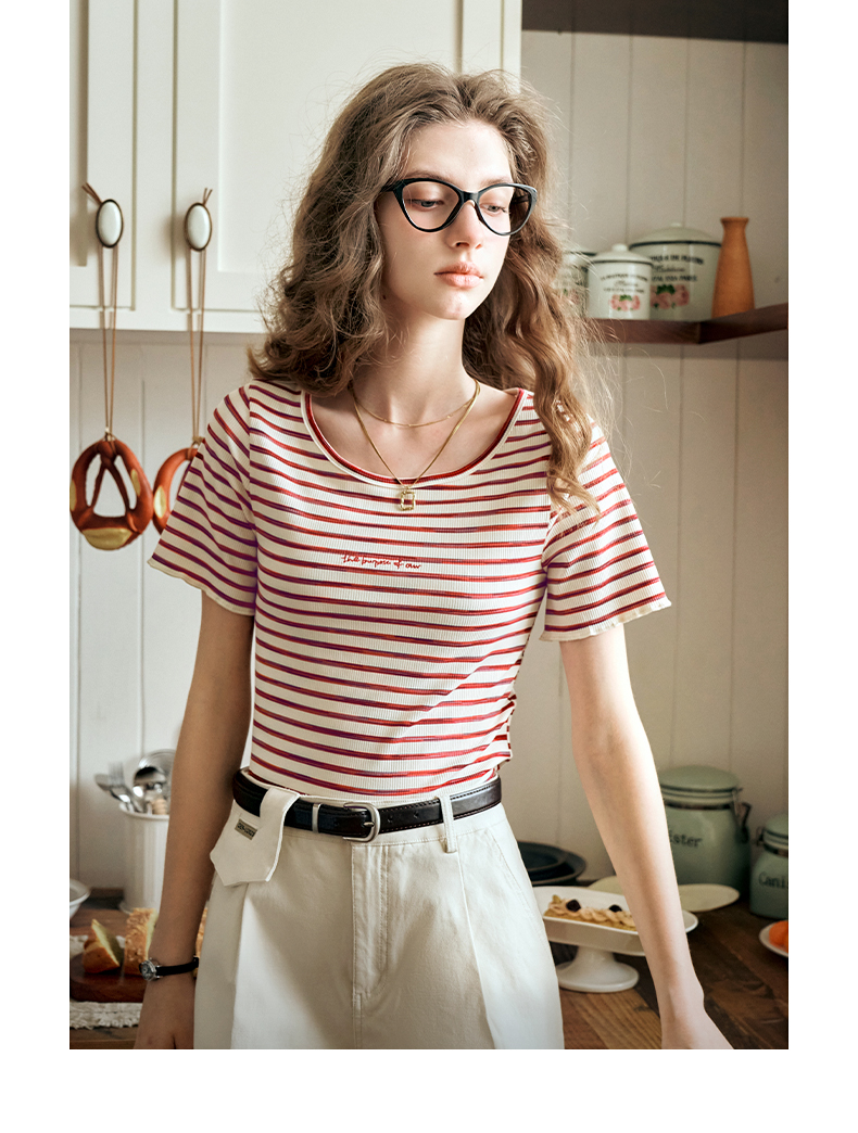 OLrain欧芮儿方领条纹T恤女夏季2024年新款时尚休闲短袖针织衫