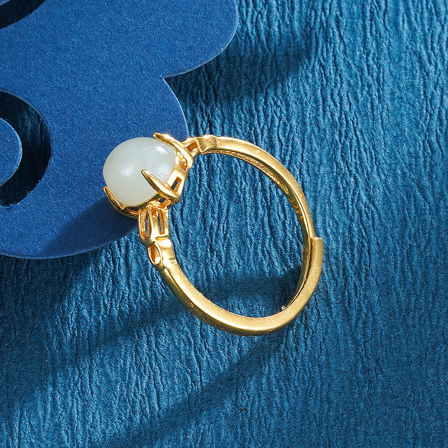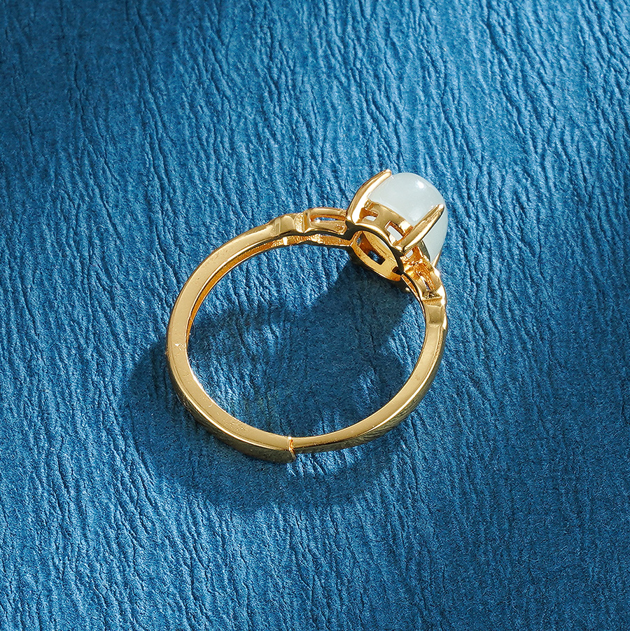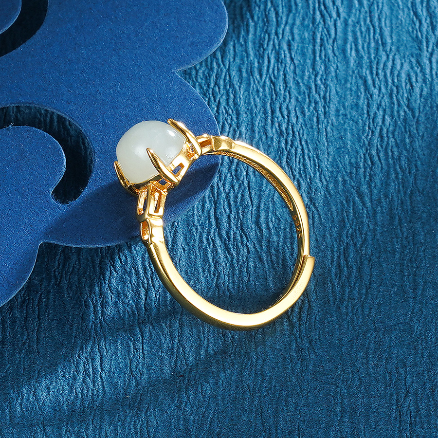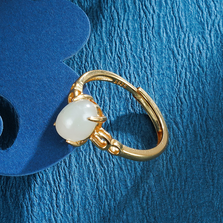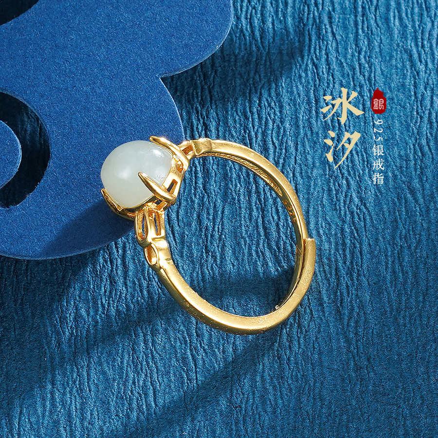 【寓意】:纯银镀金戒托,点缀和田玉蛋面戒指。尽显东方之美的简约设计,增添一抹高贵气息。