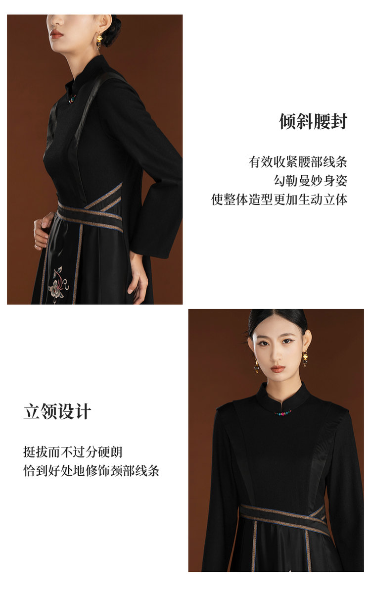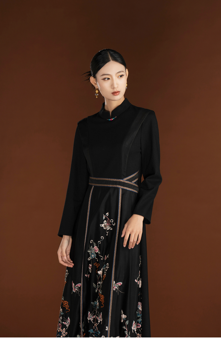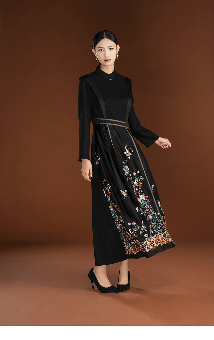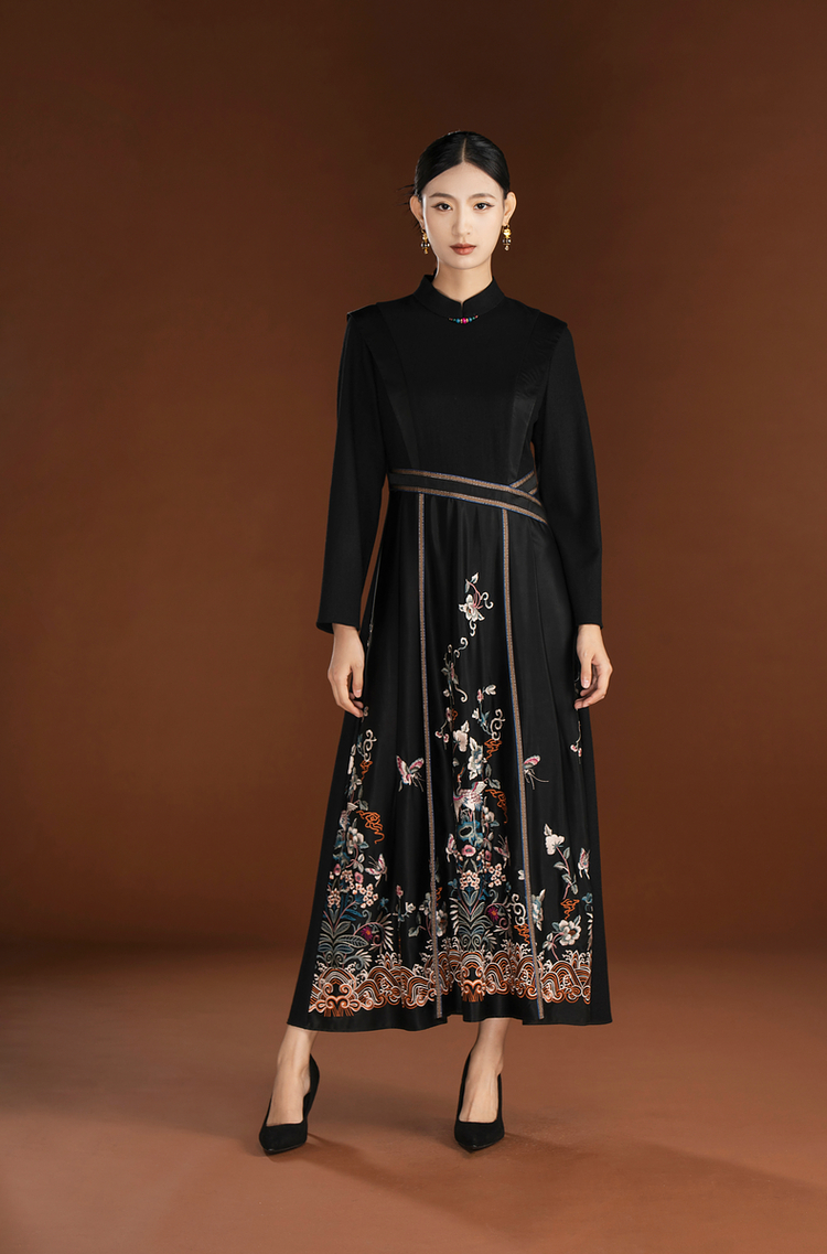吉祥衣家2025春夏新款长袖绣花新中式国风芳菲其弥章修身连衣裙