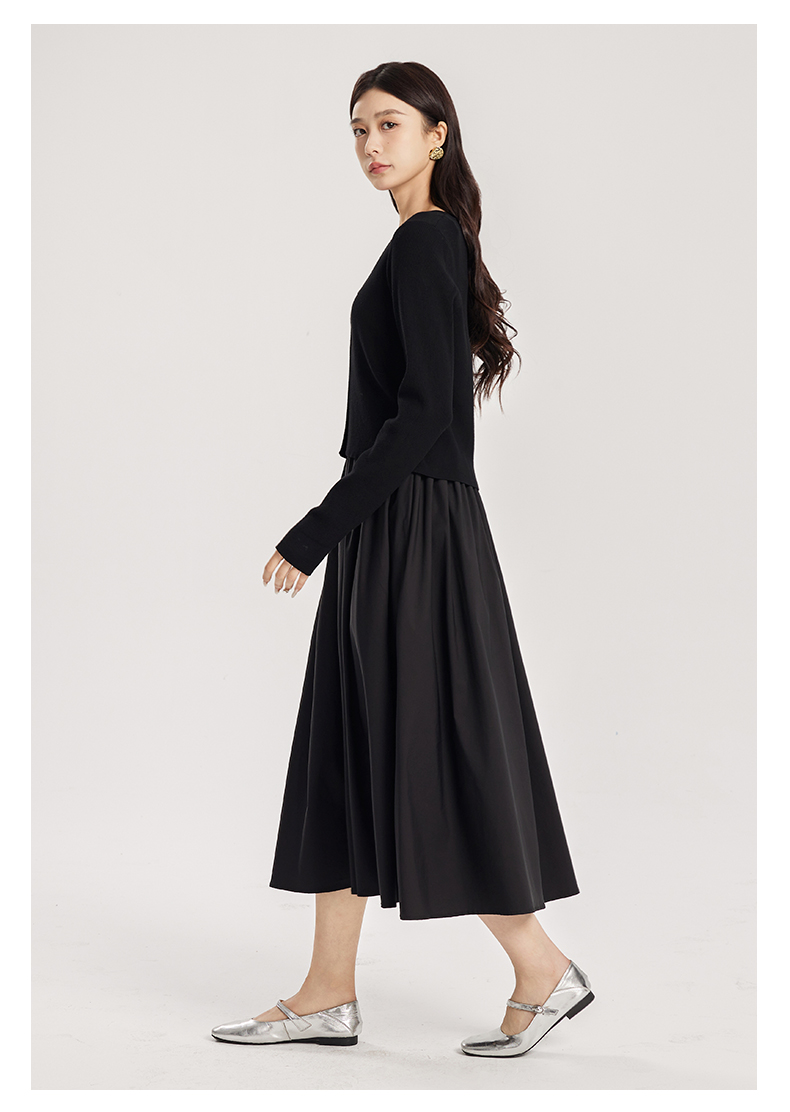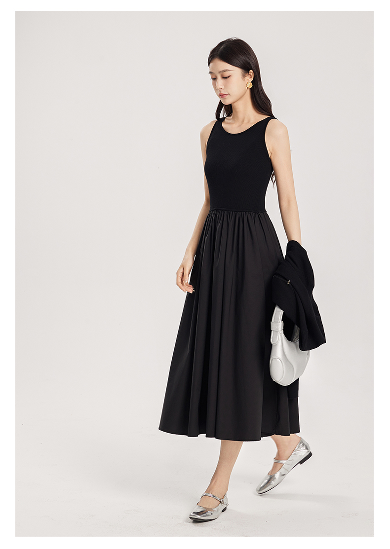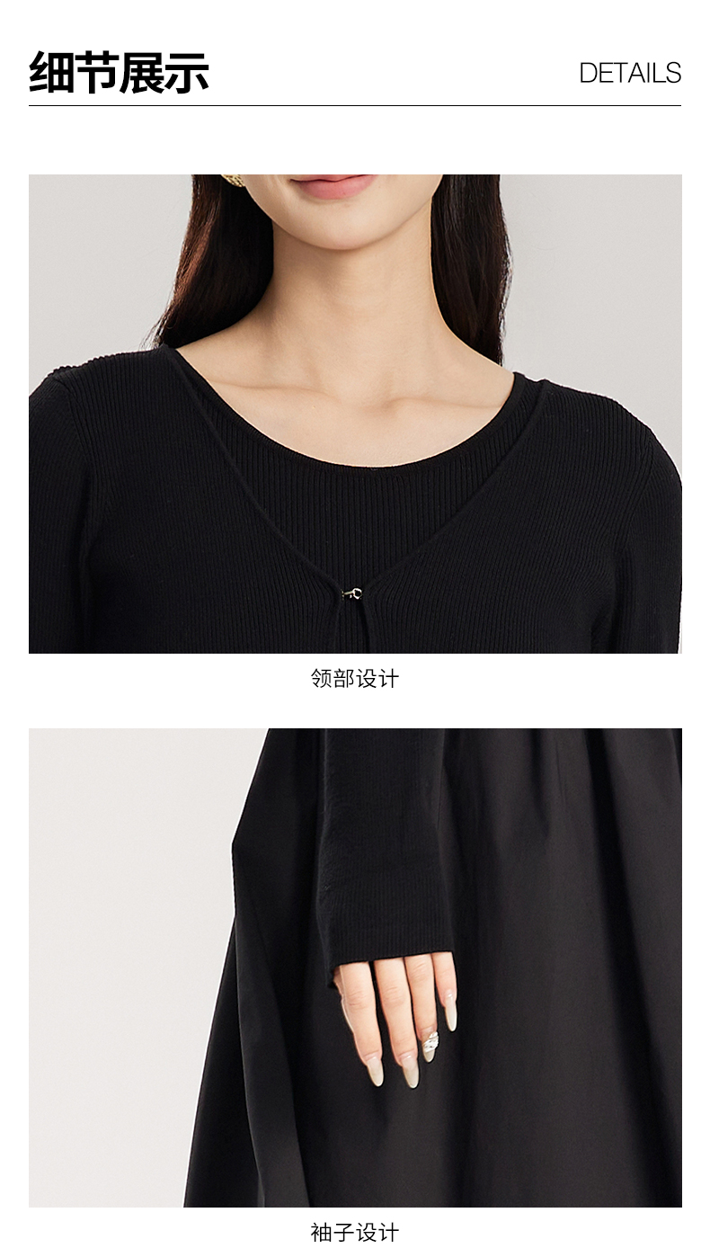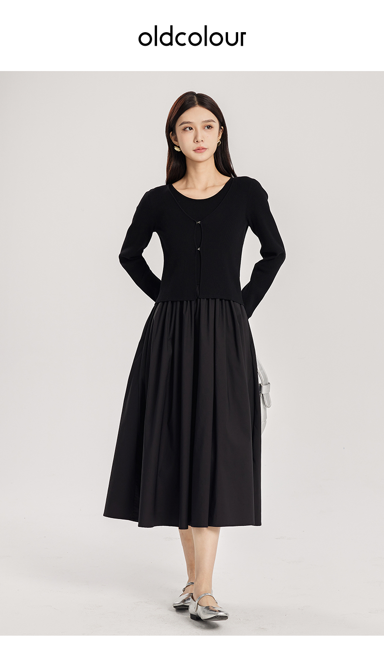 oldcolour春季新品黑色法式圆领时尚拼接针织连衣裙女Q120516A1