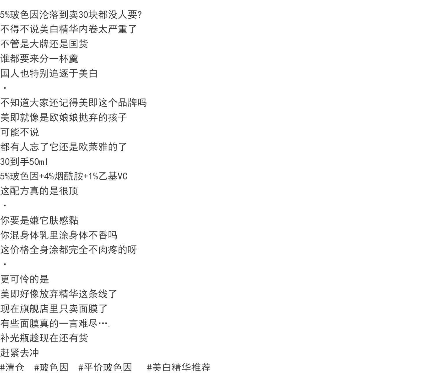 美即被欧莱雅收购后就不再是我了解的那个面膜品牌了,有了欧莱雅的技术支持,美即的产品线变得丰富多样了起来,比如我们所熟知的这个补光瓶,是美即推出的所有原液精华里卖的最好的一款。此外,它家还有玻尿酸精华、胜肽精华、维C精华、果酸精华等,看了下成分都不错,价格都不贵。