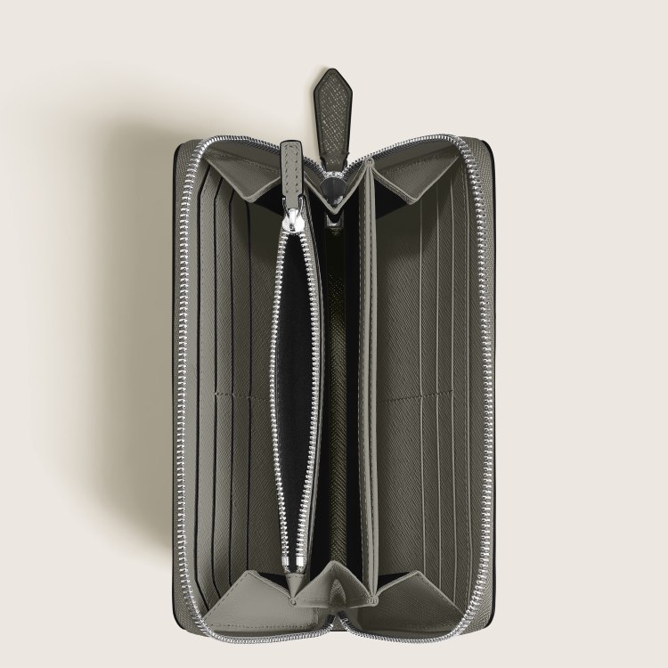 这款十字花纹典雅灰色钱夹内设多达12个卡位,3个纸币隔层,1个专用拉链零钱袋,以及3个可收纳其他小件物品的附袋