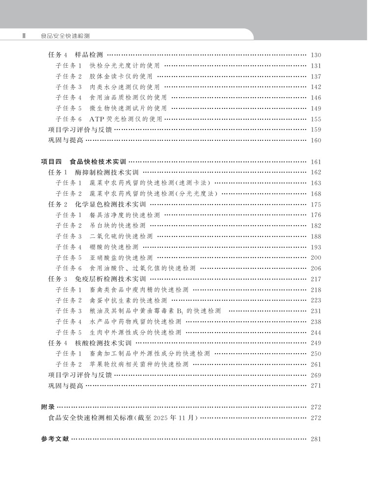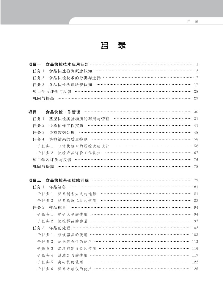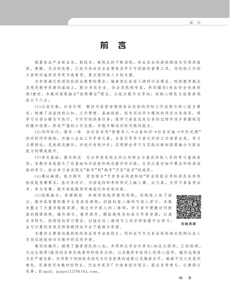 《食品安全快速检测》教材是一本涵盖食品快检基础知识、实验室设计与管理、技术训练和实践操作的教材。通过其中5个项目、18个任务的学习与实践训练,学生将了解食品快检的基础知识、原理和方法,掌握快检实验环境管理流程,能够针对各类食品中潜在的安全问题进行快速检测并做出检验报告,同时具备快检项目管理能力。教材以二维码形式配有丰富的视频、微课等学习资源,形象讲解重难点和实操关键点,使学生更加直观了解食品快检工作的全过程。并配套建设在线开放课程,供教师进行线上线下混合式教学。