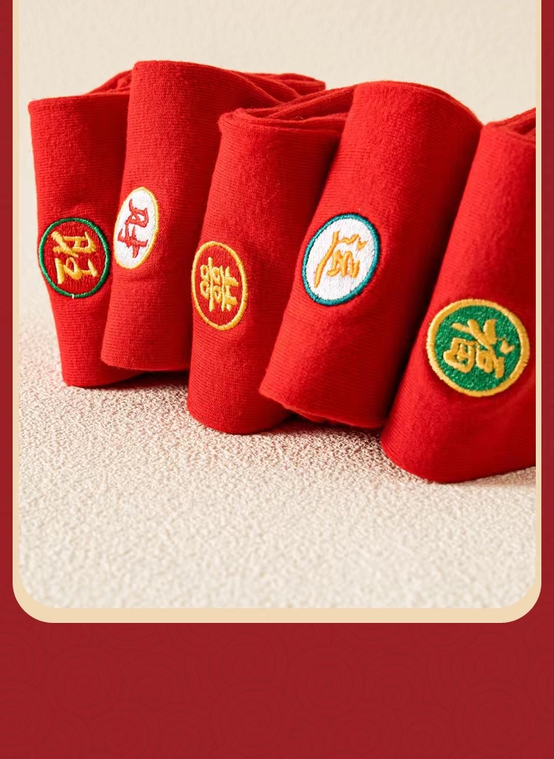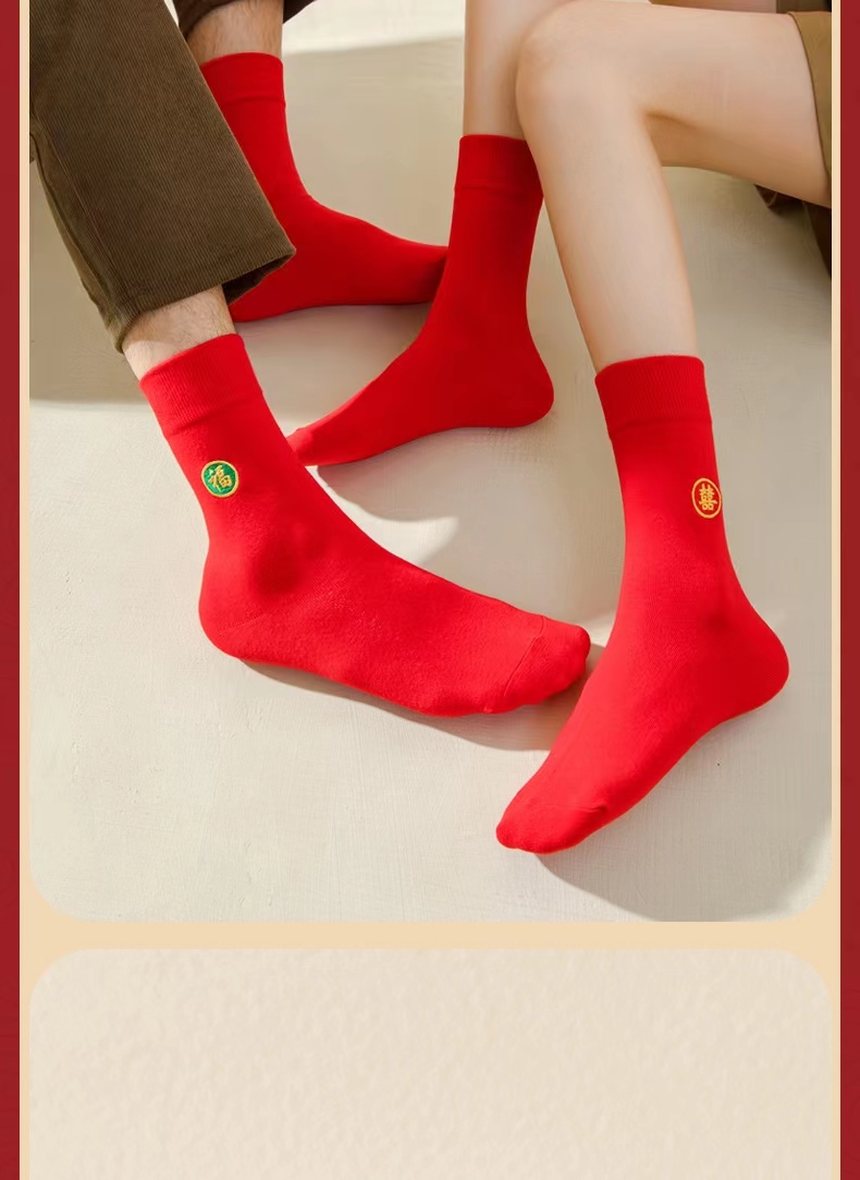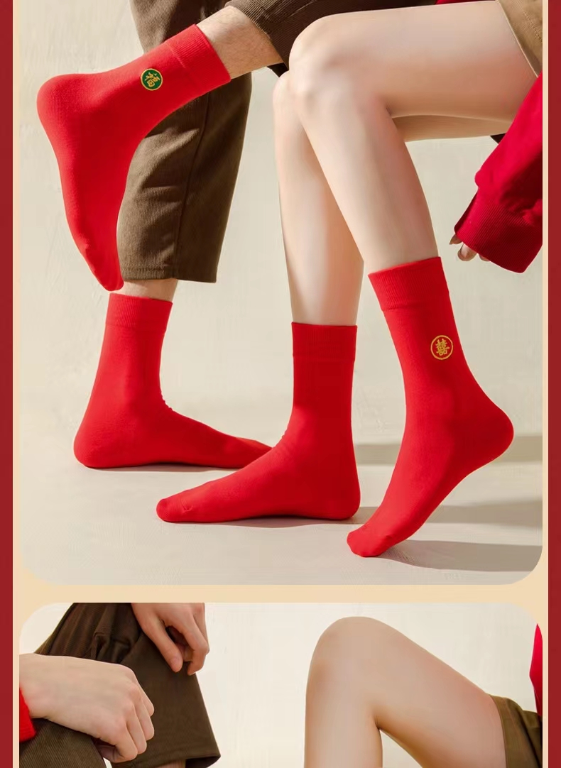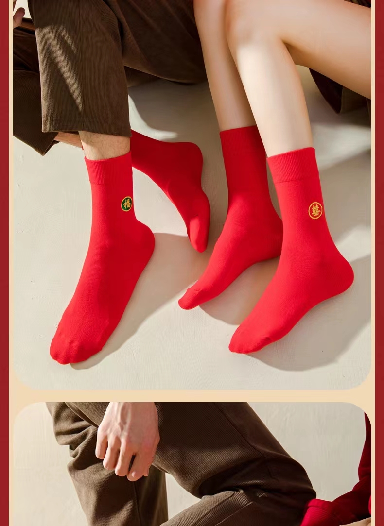 米旗 刺绣红袜子 过年大红袜 情侣款红色中筒袜