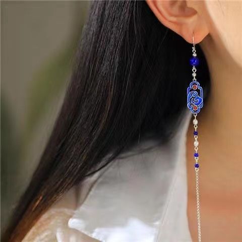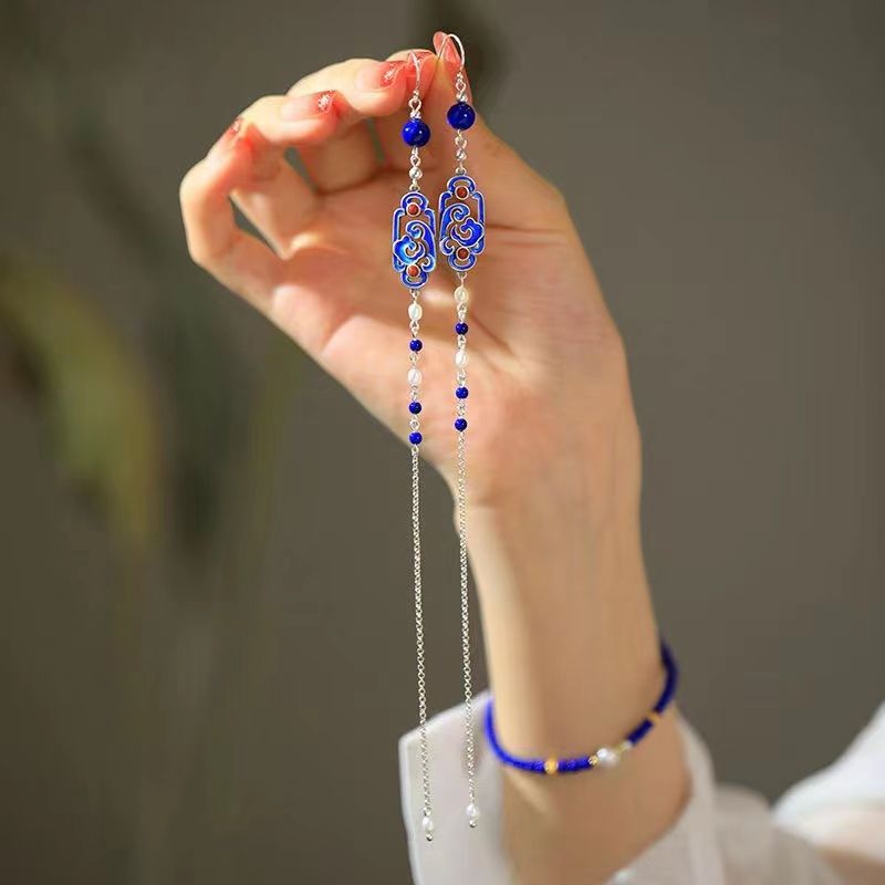 克莱因蓝耳饰珍珠耳环女新中式长款流苏耳坠复古风气质小众饰品