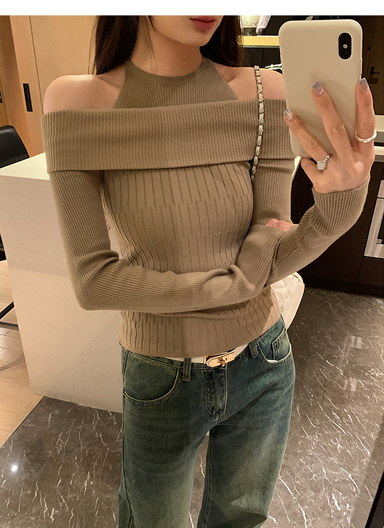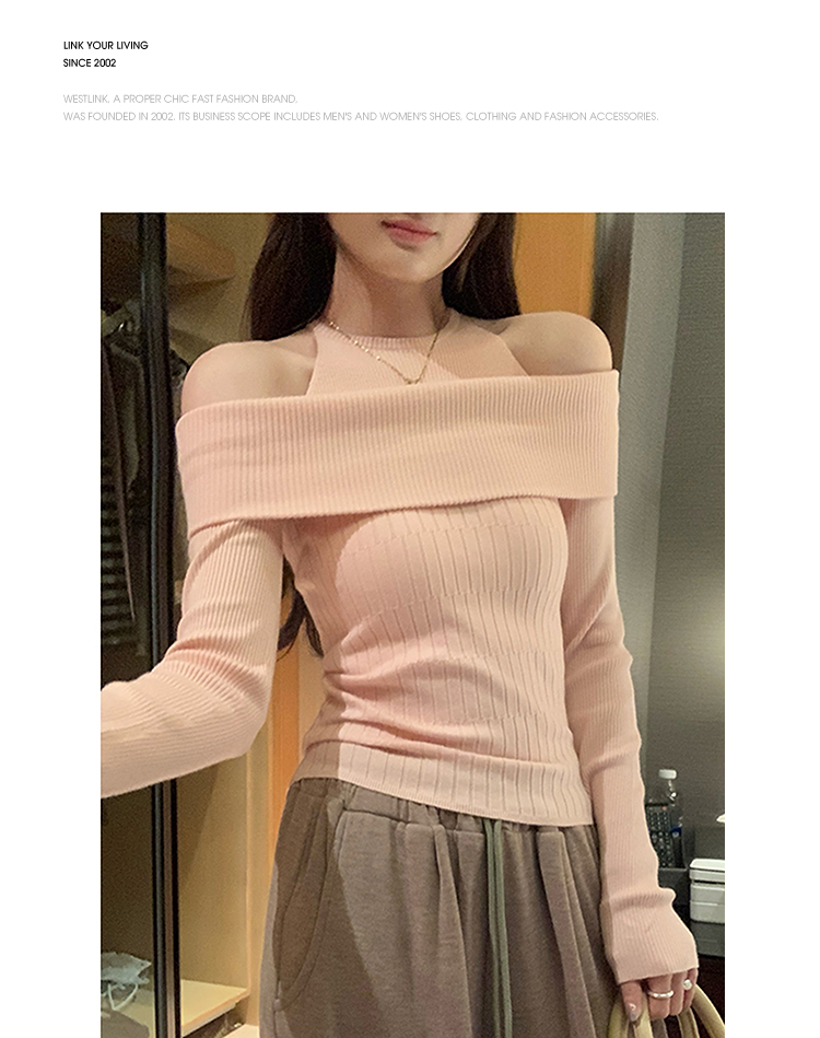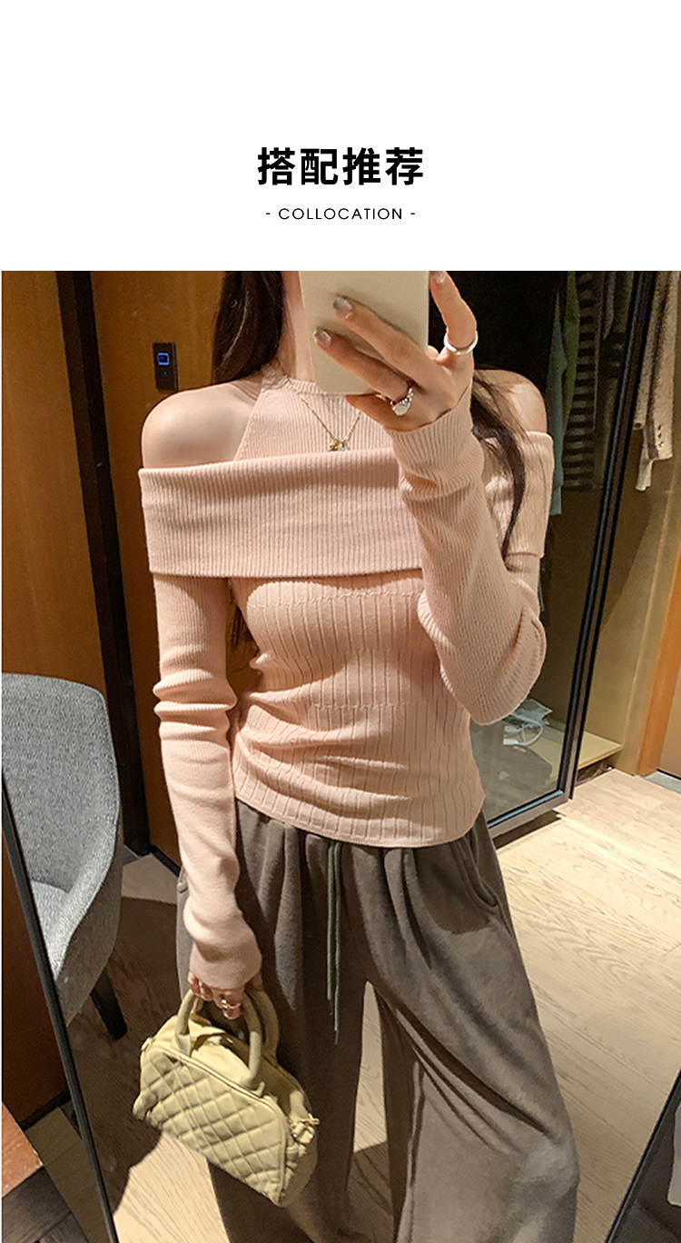 西遇长袖针织衫女秋冬新款设计感假两件一字肩毛衣打底衫SS051770