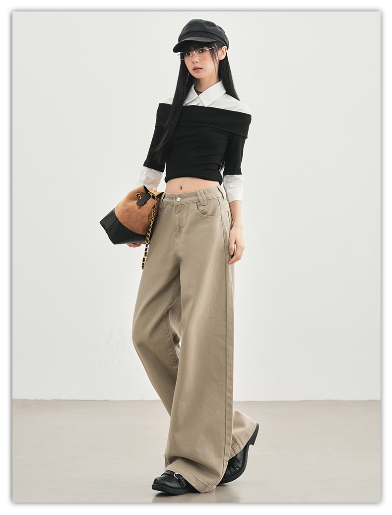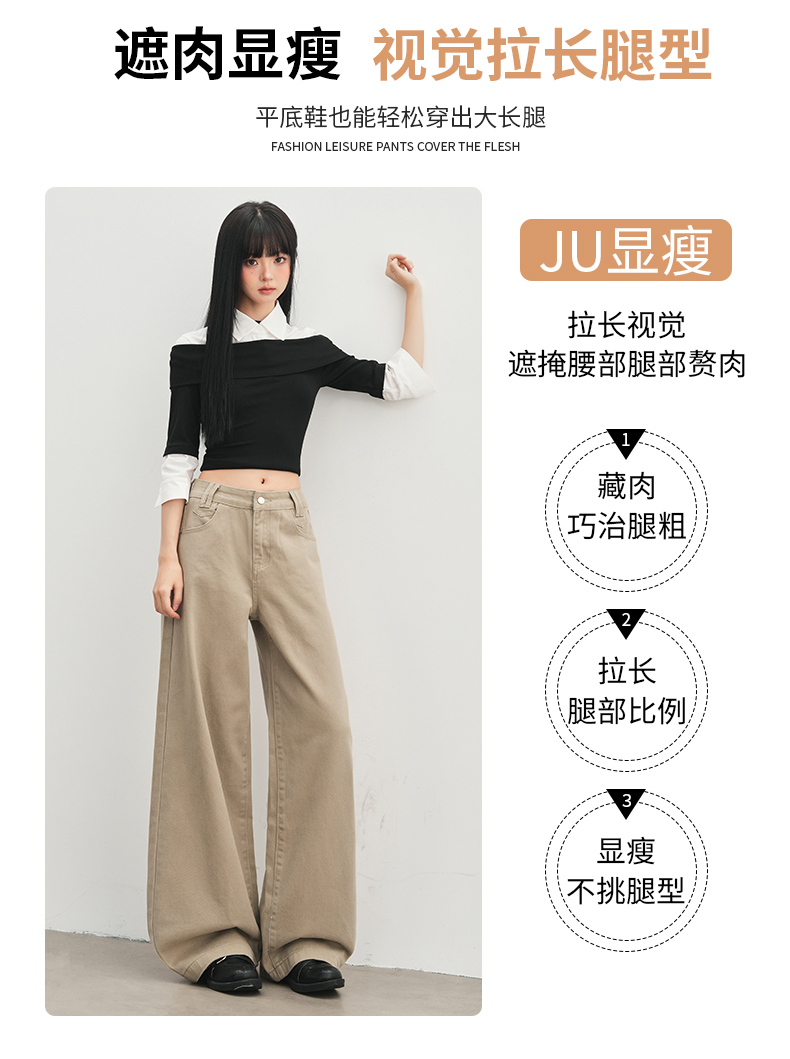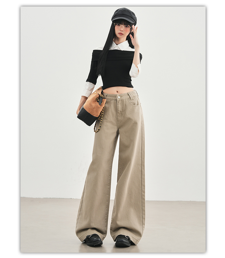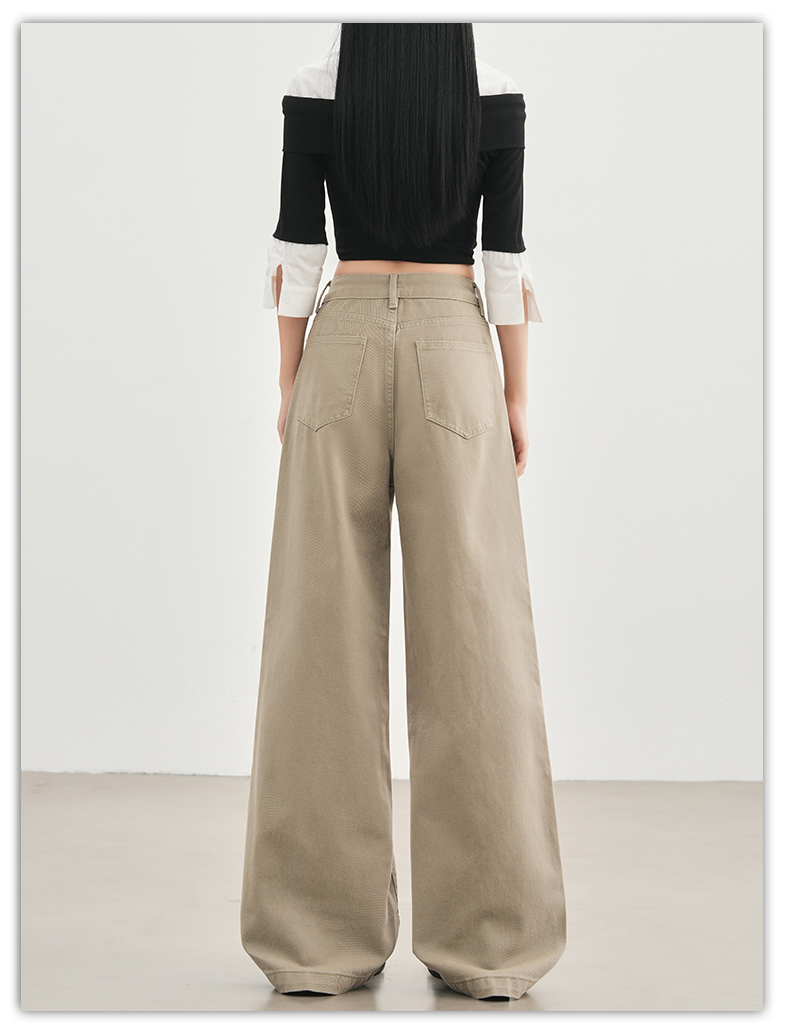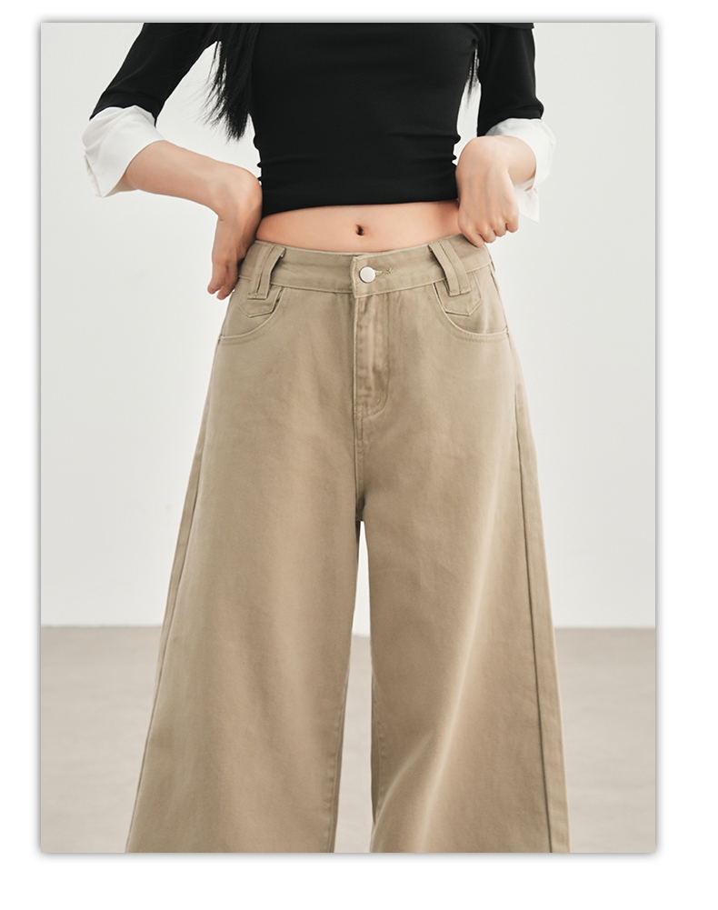 罗蒙秋冬牛仔裤女士美式卡其色高腰直筒百搭宽松显瘦阔腿拖地长裤子