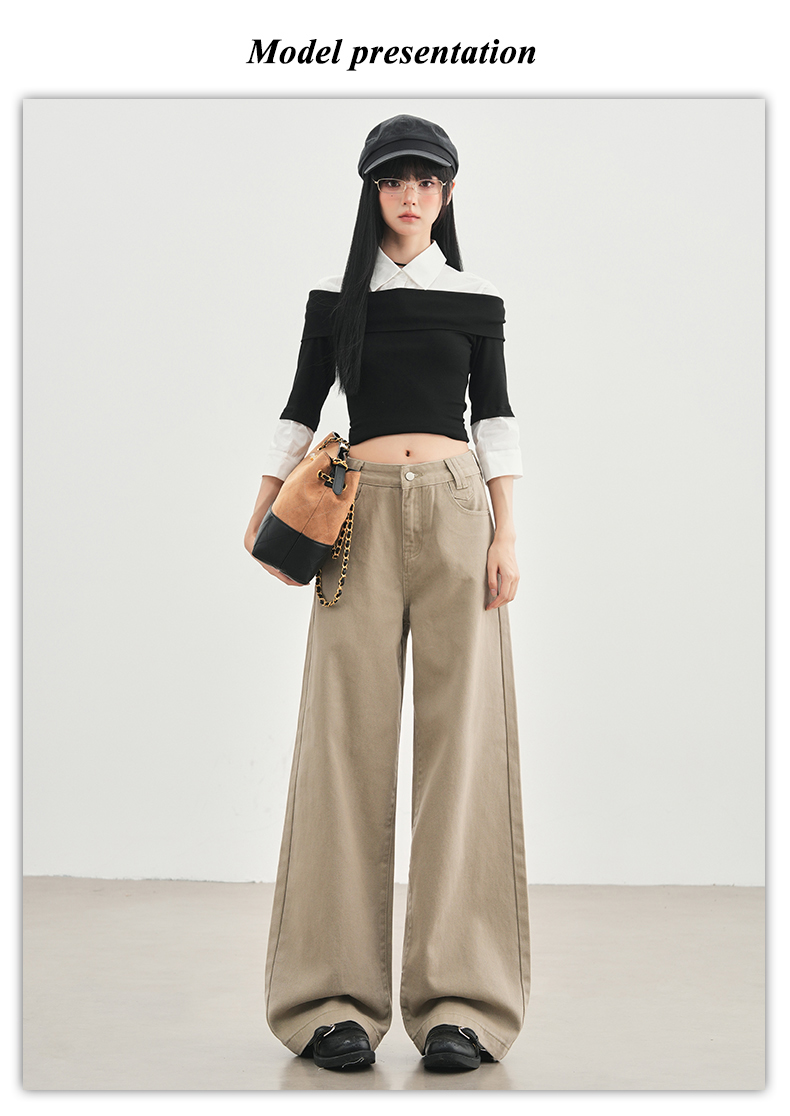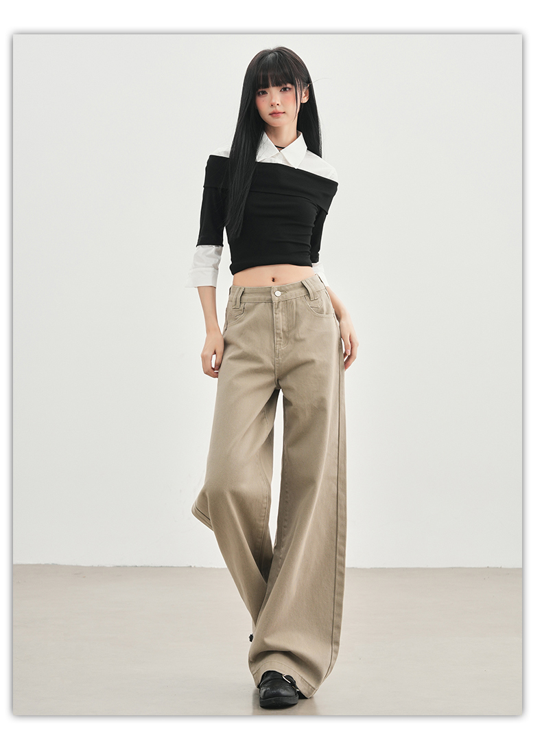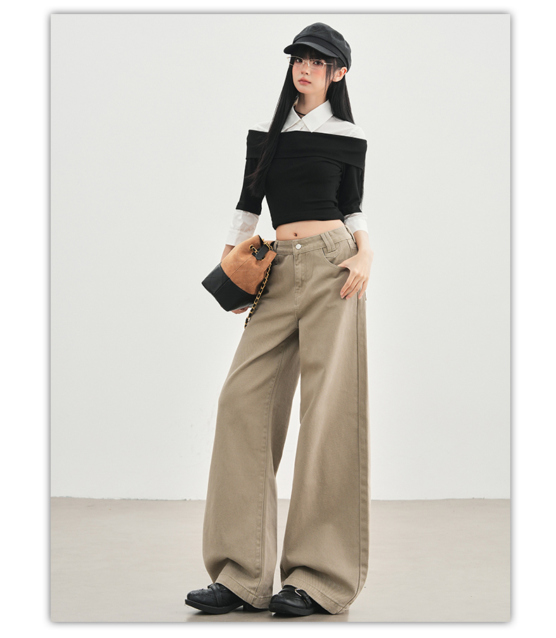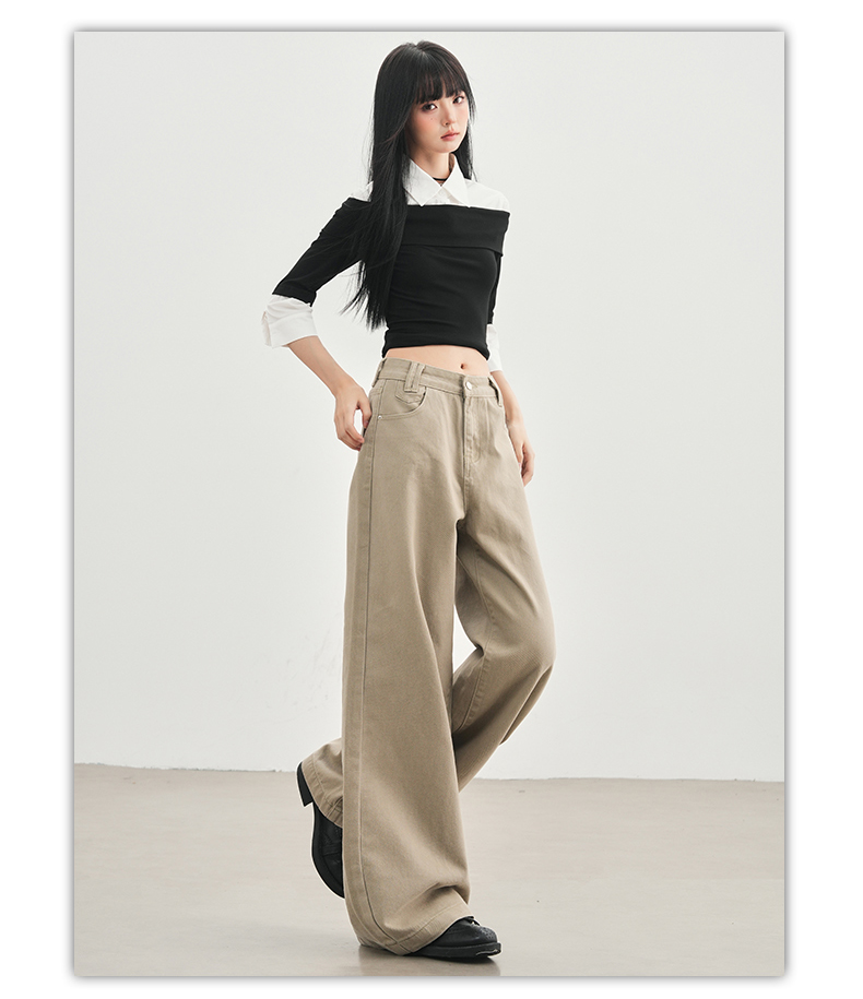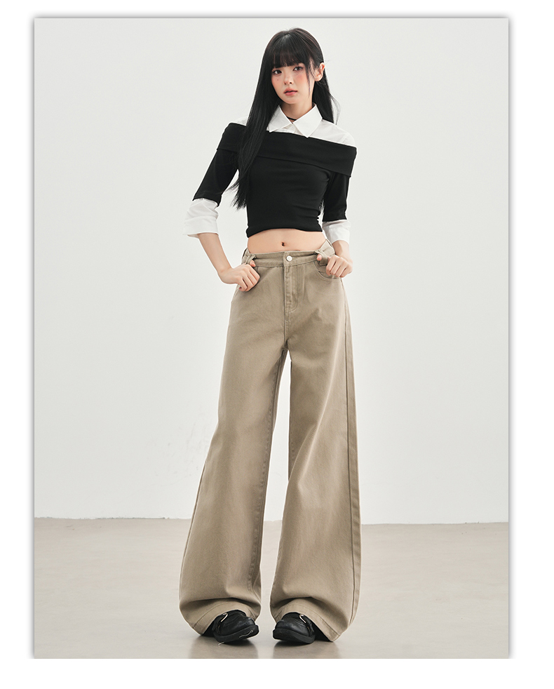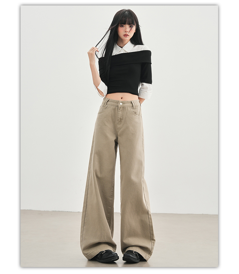 罗蒙秋冬牛仔裤女士美式卡其色高腰直筒百搭宽松显瘦阔腿拖地长裤子