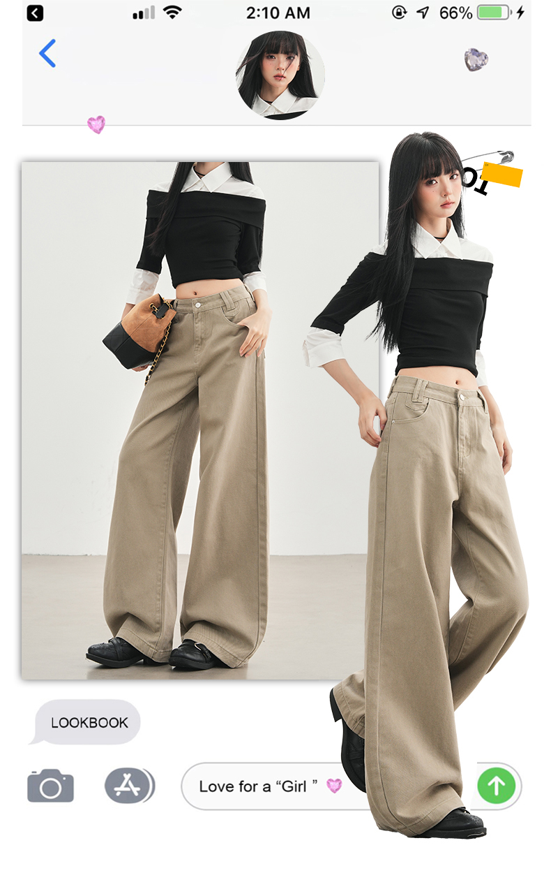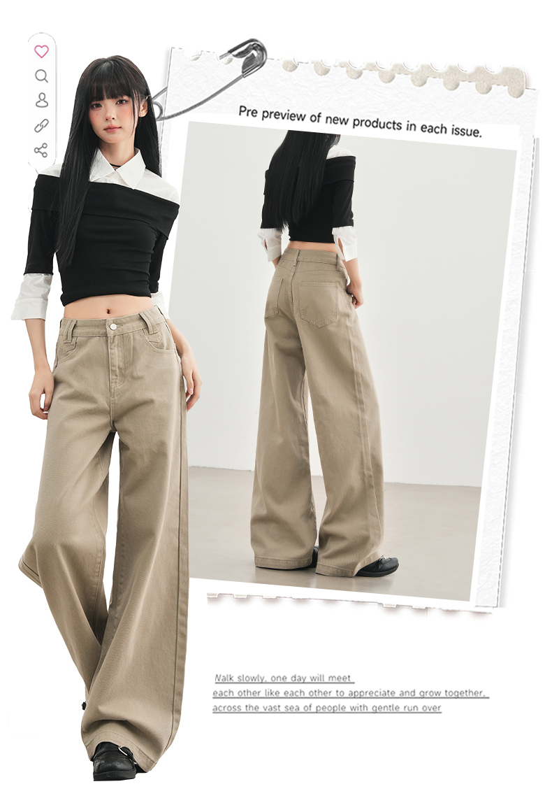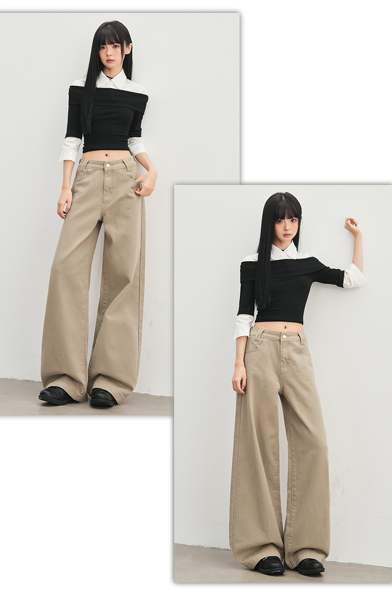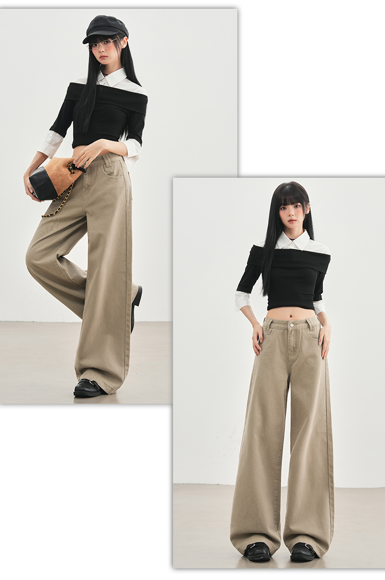 罗蒙秋冬牛仔裤女士美式卡其色高腰直筒百搭宽松显瘦阔腿拖地长裤子