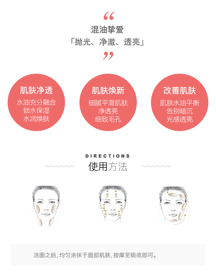 专为混油问题肌定制,拯救混油皮!上下两层设计,上层是油状液体,下层为水状液体,配方精简,可以软化角质层,