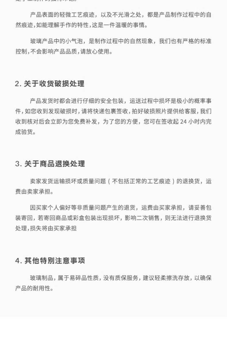 | 【下单须知】 关于产品工艺说明: 1、所有产品的装饰物均出自匠人之手,虽带有细微的夹杂物或痕迹,这正是手工制作的独特印记。 2、产品表面的轻微工艺痕迹,以及不光滑之处,都是产品制作过程中的目然痕迹,如能理解手作的特性,这是一件温暖的事情。 3、玻璃产品中的小气泡,是制作过程中的自然现象,我们也有严3格的标准控制,不会影响产品品质,请放心使用。 |