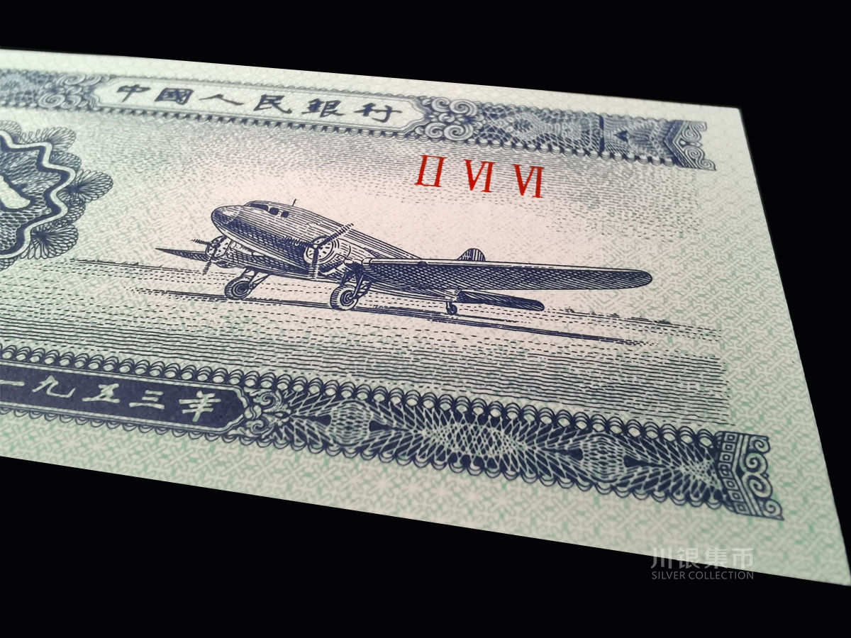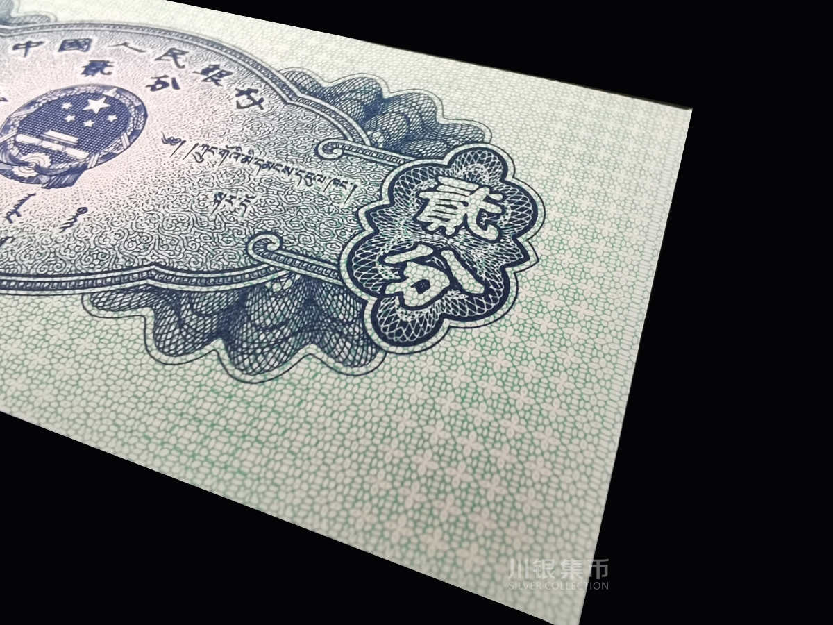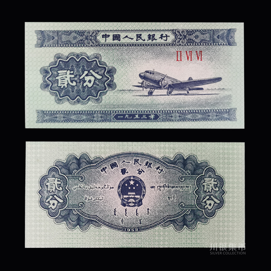 2分纸币,票面是蓝色的,主图为飞机,因此被称为“蓝飞机”;背面图案是徽及汉、蒙、维、藏字,票面尺寸为95×45mm。